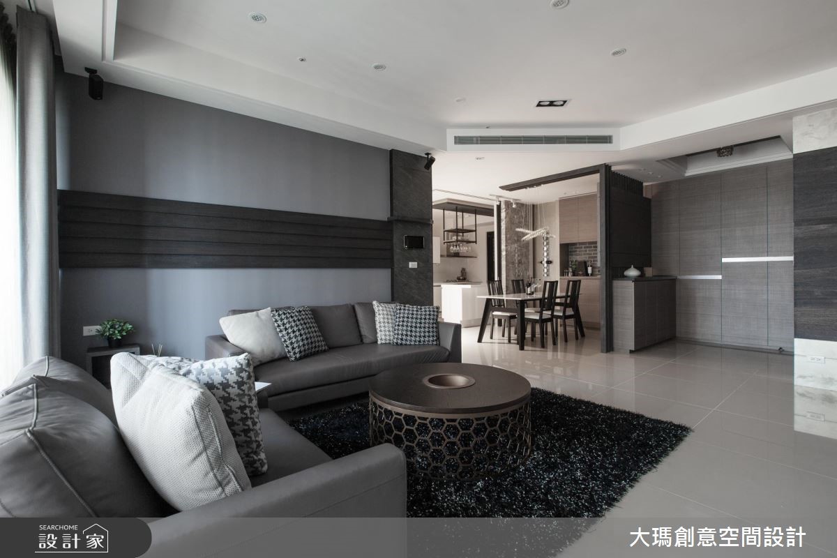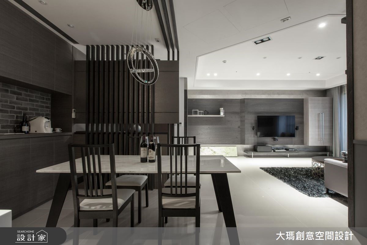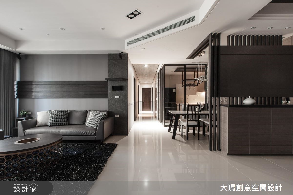 119平方米的新成屋必须同时融合三代的使用需求及品味,因此设计师利用黑、灰、褐色等深色调交织,适当的安排色彩比例,并利用多元建材打造层次感,呈现出沉稳却不显老气的家,更让一家四口同时拥有宽敞的欢聚时光与各自的私密天地。【善用色彩,营造质感生活空间】 入门处利用结合格栅的双面柜作为收纳与划分领域的角色,而公共区域则利用大量的钢刷木皮结合石材,以简洁利落的色彩搭配创造视觉层次。餐厅由延伸至天花的L型隔栅框设,并结合餐边柜,为屋主提供充裕的收纳空间,并特别定制专用酒架,让屋主得以展示搜藏。厨房以玻璃拉门打造具有通透感却不会使油烟溢散的烹饪空间,更拉伸了整体的视野。串连公私领域的廊道则以温润的木皮包覆,不只暖意十足,更中和公共区域的冷调感。主卧区利用明亮的纯白色彩,带入摩登品味;而一双儿女的私人天地则分别依据两人喜好及各自的需求,分别以壁板、壁纸与明亮的跳色展现在柜体或墙面,形成活泼的个人特色。