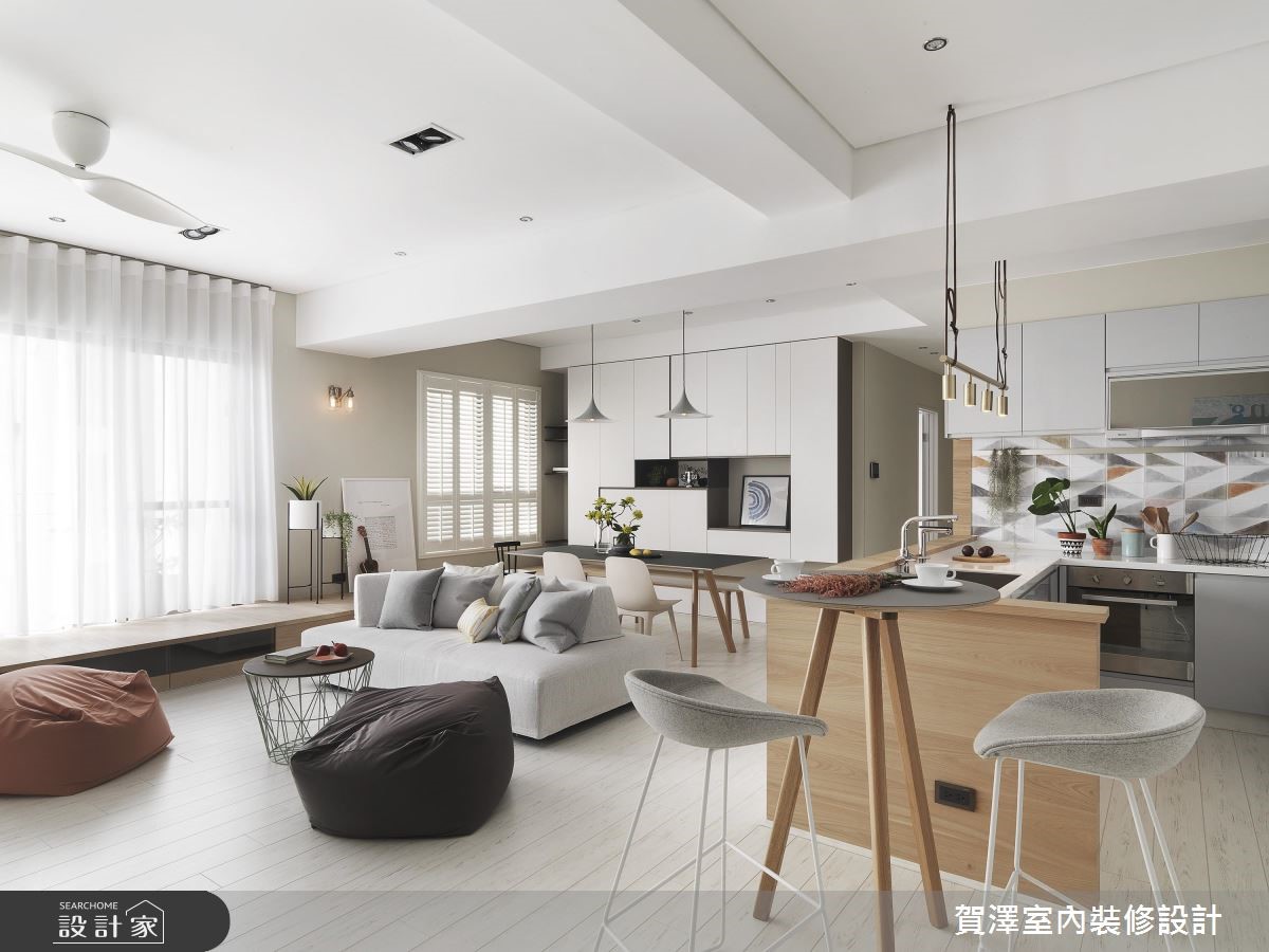 近年来,清新的北欧风渐渐成为许多屋主的心头好,经常带孩子去露营、喜欢衝浪的男屋主,以及爱下厨做菜的女主人,他们一家3口的北欧风新家,利用大面积的纯白色调、木质等元素,营造出自然、清爽的生活面貌。【纯净无瑕的浪漫空间】家中有不少露营配备,再加上有衝浪兴趣的男主人,也需要吊挂衝浪板的空间;而热爱烹饪的女屋主则是收集各式的铸铁锅和杯盘,考量整体动线和风格下,在玄关处打造一处隐藏的储藏室,男主人出发衝浪时,就不必大费周章搬移衝浪板。利用低度的沙发、家具界定领域,让空间、採光更加宽敞舒适,也增进了家人之间的生活互动,为小家庭打造出清爽自在的居家空间。另外在厨房设备柜也有储物间的设计,满足了锅具、器皿的厨房收纳需求。
