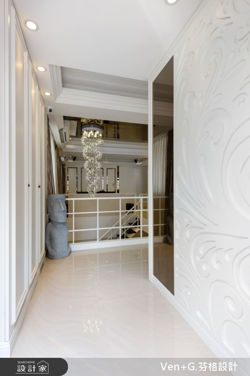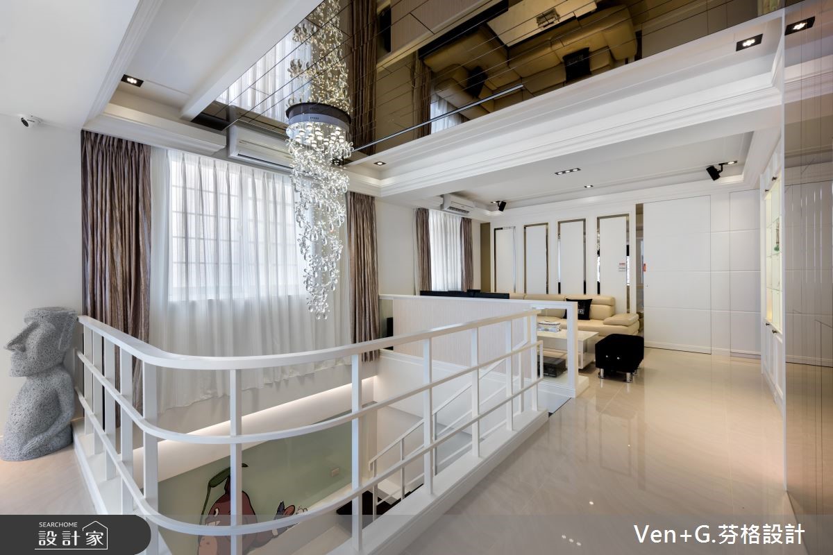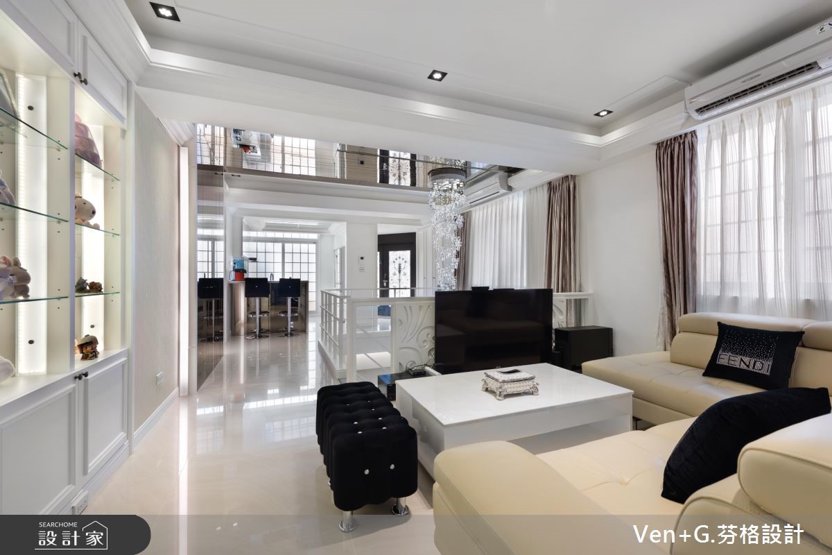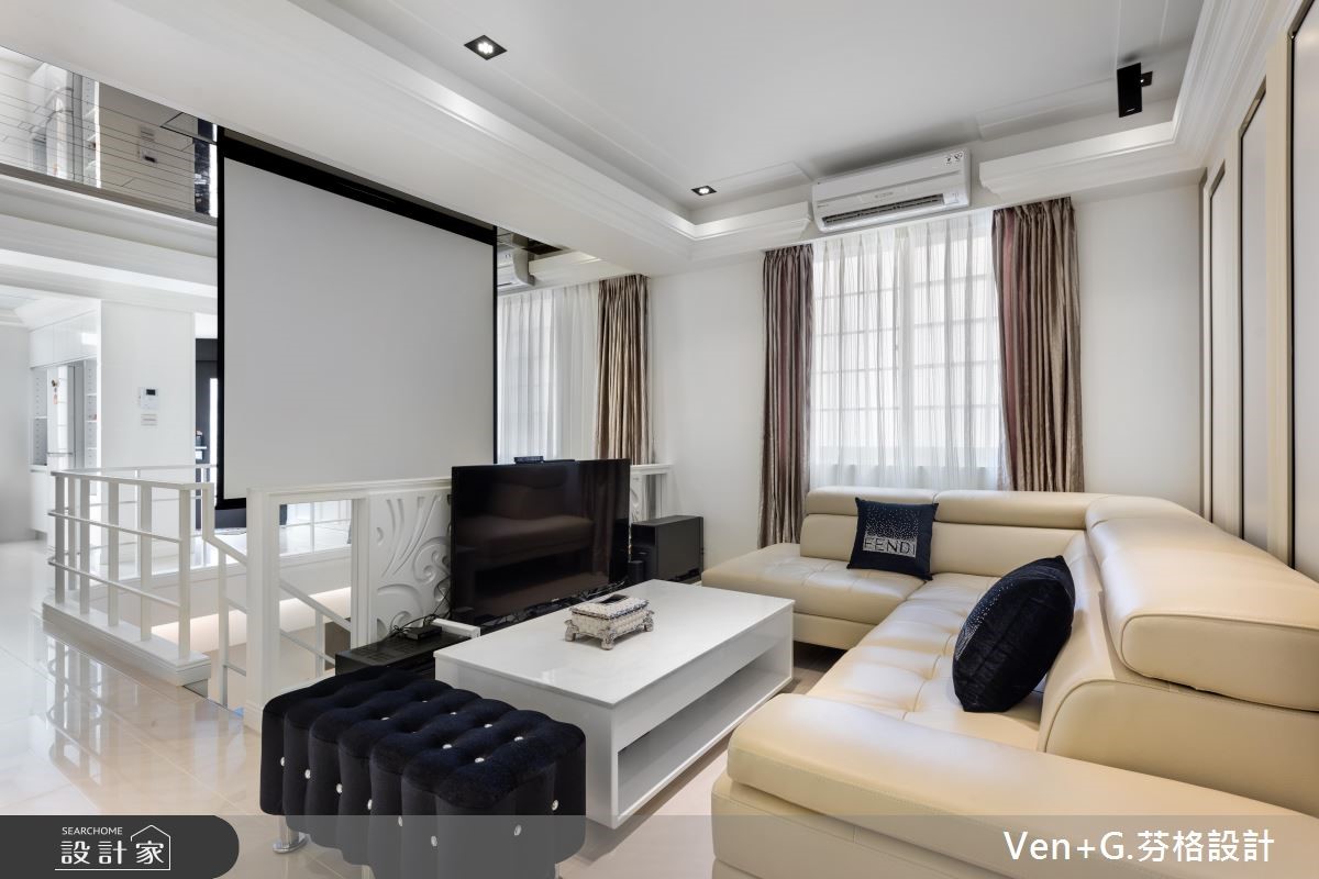 超过40年的73平方米老屋,除了漏水、壁癌与采光不足的问题外,更有着房屋倾斜的结构隐忧;因此设计师透过精细的基础工程解决老屋问题,并补强结构,为居住安全立基,并进一步利用双面采光改善采光与通风问题,为屋主打造梦想好宅。【打破隔断限制,创造开阔空间】设计师以奢华风格为主轴,打开整体空间视野,营造宛如百平风范的精品氛围;全室以纯白色调为基底放大视觉感受,利用天井概念串连一楼与地下室,并考虑级距与深宽定制铁梯,充分引入光线,打破阴湿幽暗的印象,让单层空间向下延伸成为气派复式楼。为了打造开阔的无压空间,设计师抹除制式的电视墙面,结合下拉式投影布幕,满足家庭剧院需求,并加入天花镜面放大视觉感;主卧床头则利用菱格纹绷布,搭配粉蓝色壁面以及线板装饰,型塑富有高雅格调的奢华风格。