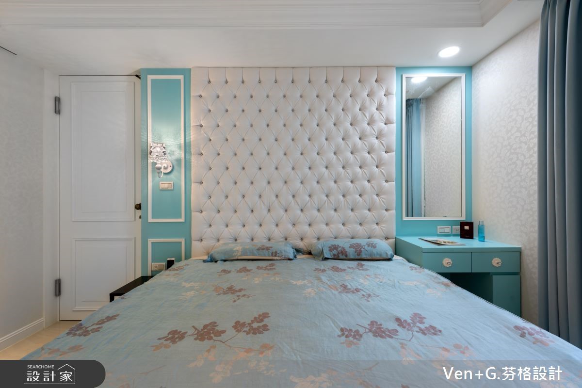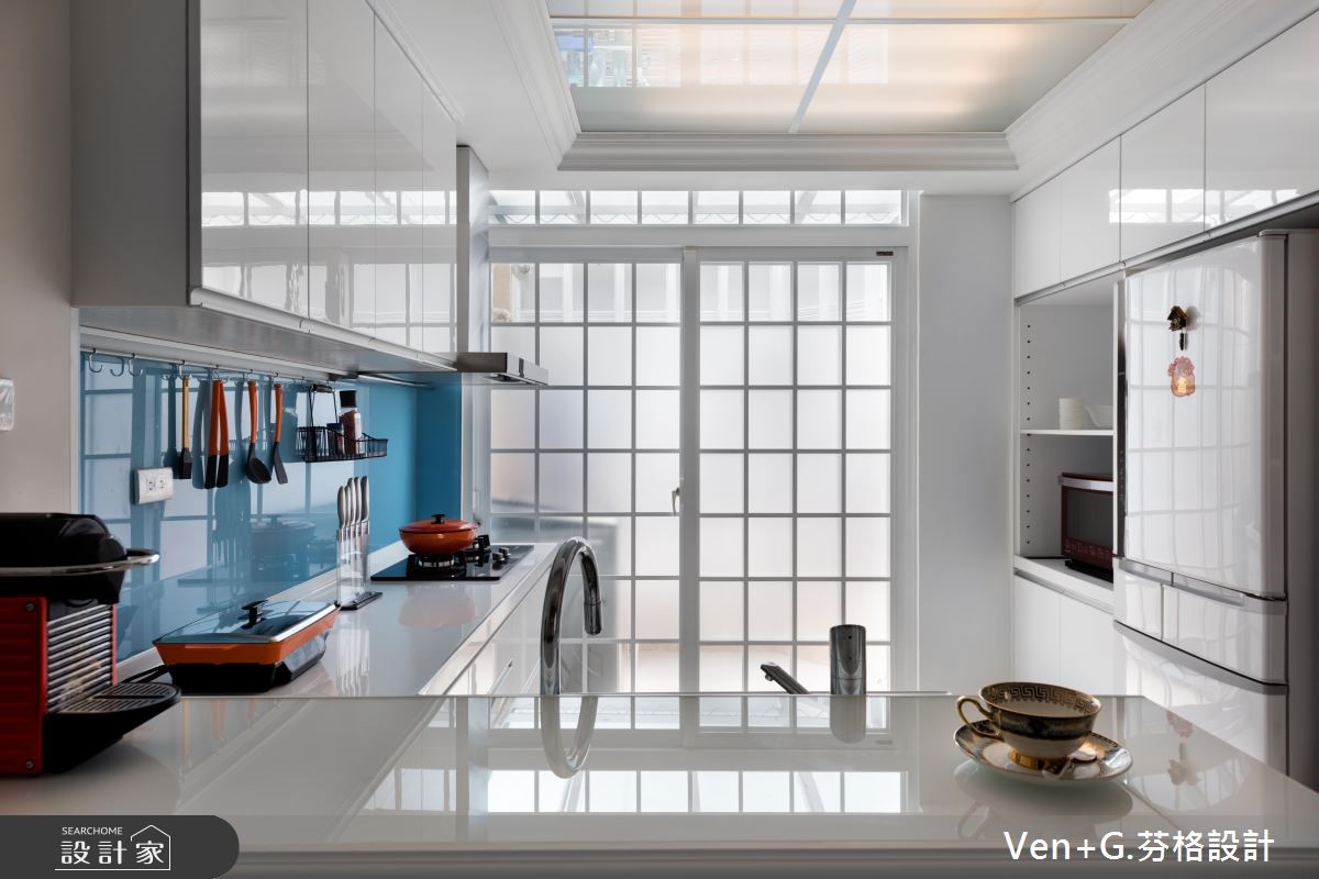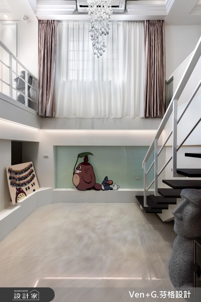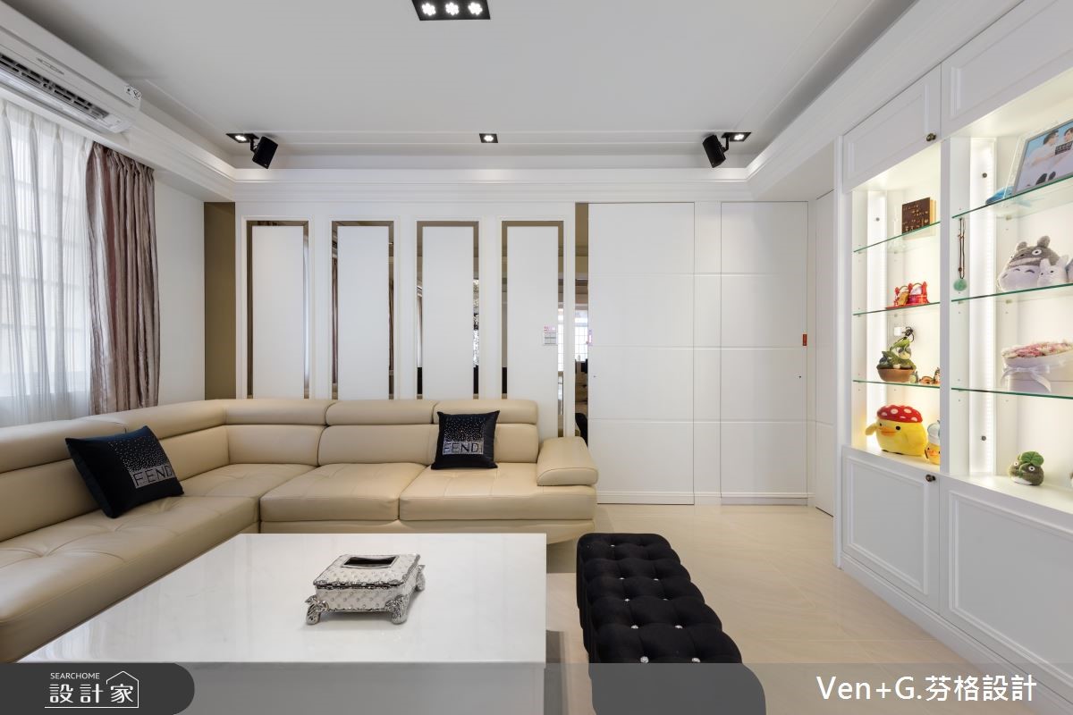 超过40年的73平方米老屋,除了漏水、壁癌与采光不足的问题外,更有着房屋倾斜的结构隐忧;因此设计师透过精细的基础工程解决老屋问题,并补强结构,为居住安全立基,并进一步利用双面采光改善采光与通风问题,为屋主打造梦想好宅。【打破隔断限制,创造开阔空间】设计师以奢华风格为主轴,打开整体空间视野,营造宛如百平风范的精品氛围;全室以纯白色调为基底放大视觉感受,利用天井概念串连一楼与地下室,并考虑级距与深宽定制铁梯,充分引入光线,打破阴湿幽暗的印象,让单层空间向下延伸成为气派复式楼。为了打造开阔的无压空间,设计师抹除制式的电视墙面,结合下拉式投影布幕,满足家庭剧院需求,并加入天花镜面放大视觉感;主卧床头则利用菱格纹绷布,搭配粉蓝色壁面以及线板装饰,型塑富有高雅格调的奢华风格。