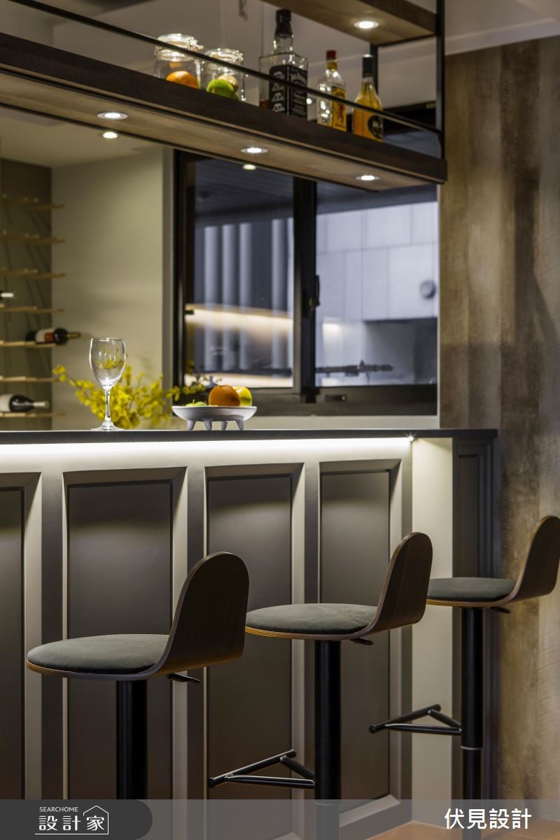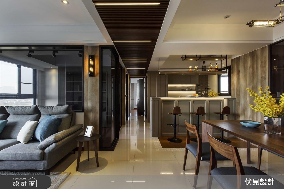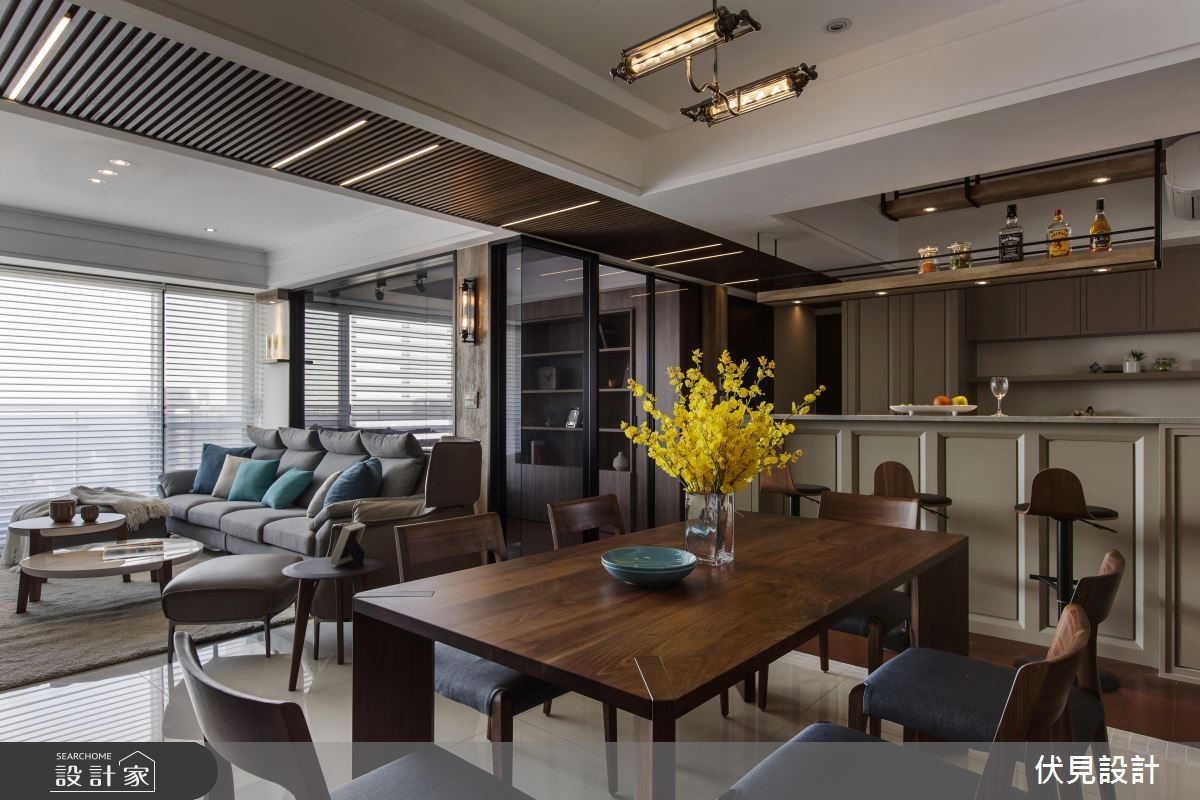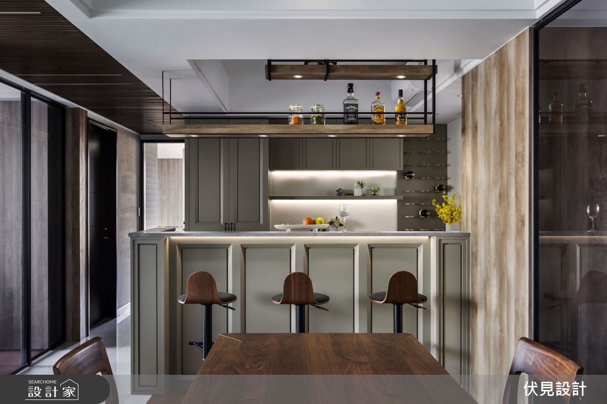 这间新婚宅,男主人为美国人,而女屋主则是台湾人。为了契合两个人的成长背景,设计师让空间采用美式风定调,并融合女主人喜爱的现代简约元素,以居家设计作为对新婚夫妻的祝福。【粗犷木质,展现个性风范】公共空间以灰色烤漆搭配简约线条,呈现简单俐落的轻美式风格,且刻意以较为鲜明的木皮纹路,展现出粗犷中带有温润的质感。走道天花上则选用细致的柚木格栅,并衔接至客厅的展示柜,做出鲜明的动线指引。空间藉由大面积窗户、柔纱窗帘导引采光,且书房刻意采用清玻璃隔断,促成采光、视线的流动。餐厨区则呈开放式设计,於吧台上方加入铁件展示吊架、加入实用机能,亦利用冲孔板跟木棒,在吧台后方位置规画红酒展示架,满足男主人的藏酒置放。