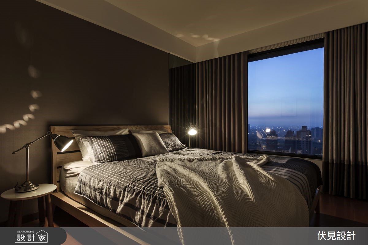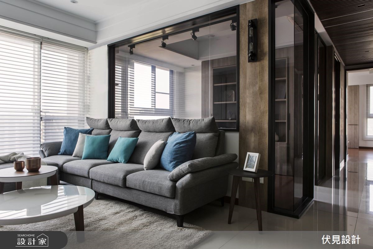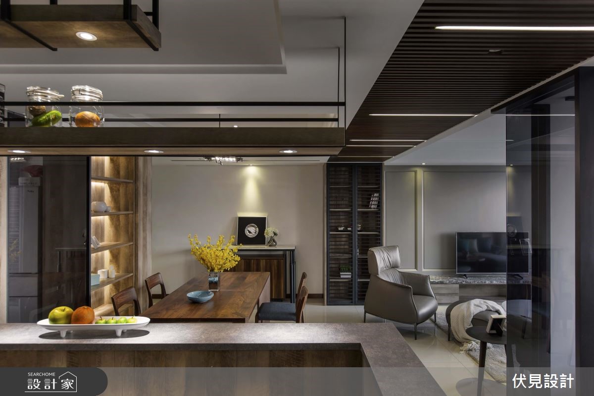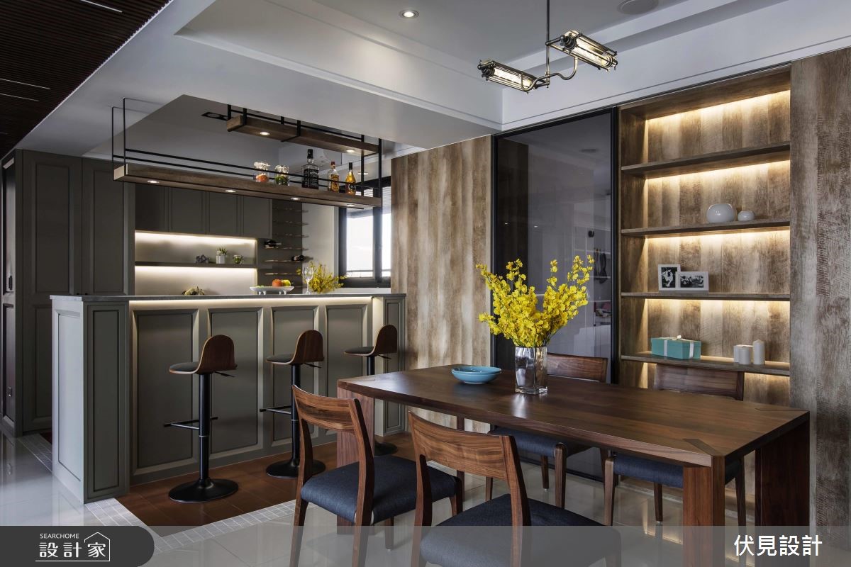 这间新婚宅,男主人为美国人,而女屋主则是台湾人。为了契合两个人的成长背景,设计师让空间采用美式风定调,并融合女主人喜爱的现代简约元素,以居家设计作为对新婚夫妻的祝福。【粗犷木质,展现个性风范】公共空间以灰色烤漆搭配简约线条,呈现简单俐落的轻美式风格,且刻意以较为鲜明的木皮纹路,展现出粗犷中带有温润的质感。走道天花上则选用细致的柚木格栅,并衔接至客厅的展示柜,做出鲜明的动线指引。空间藉由大面积窗户、柔纱窗帘导引采光,且书房刻意采用清玻璃隔断,促成采光、视线的流动。餐厨区则呈开放式设计,於吧台上方加入铁件展示吊架、加入实用机能,亦利用冲孔板跟木棒,在吧台后方位置规画红酒展示架,满足男主人的藏酒置放。
