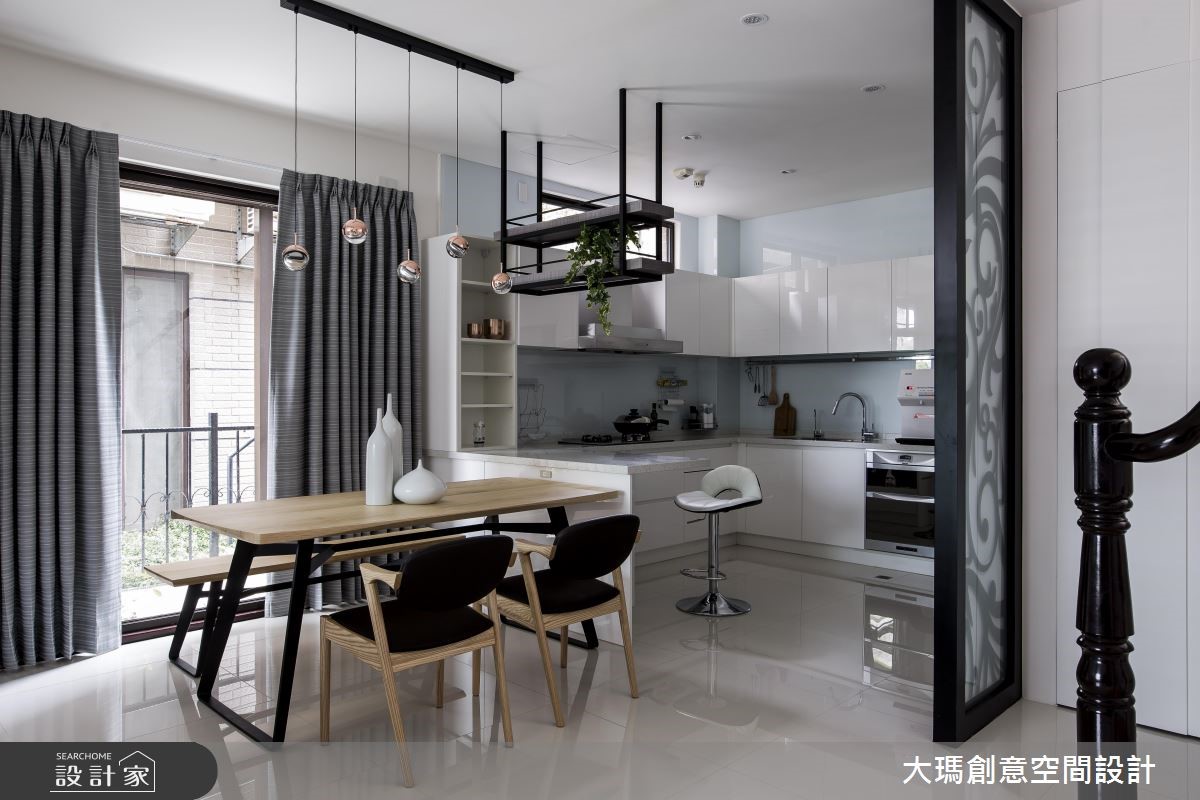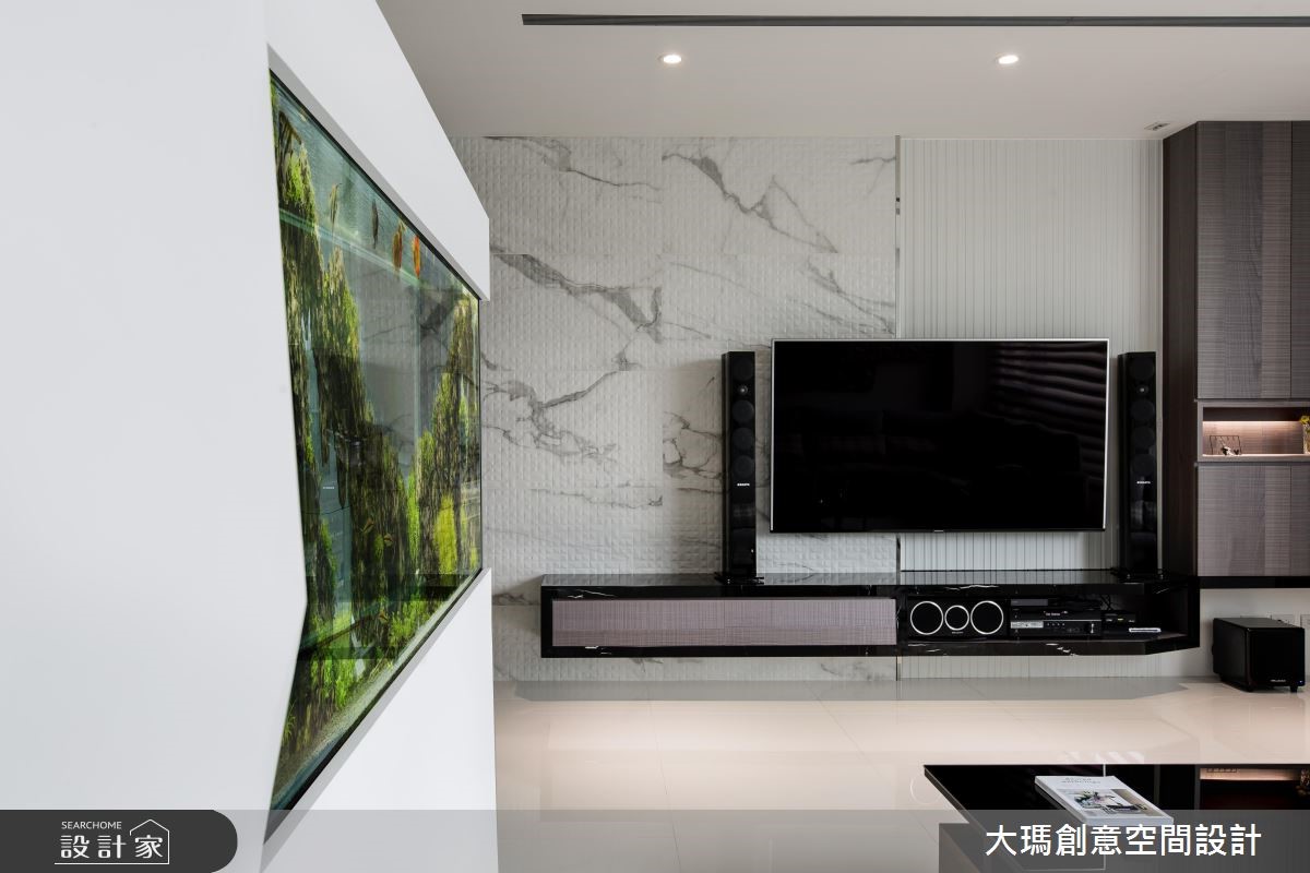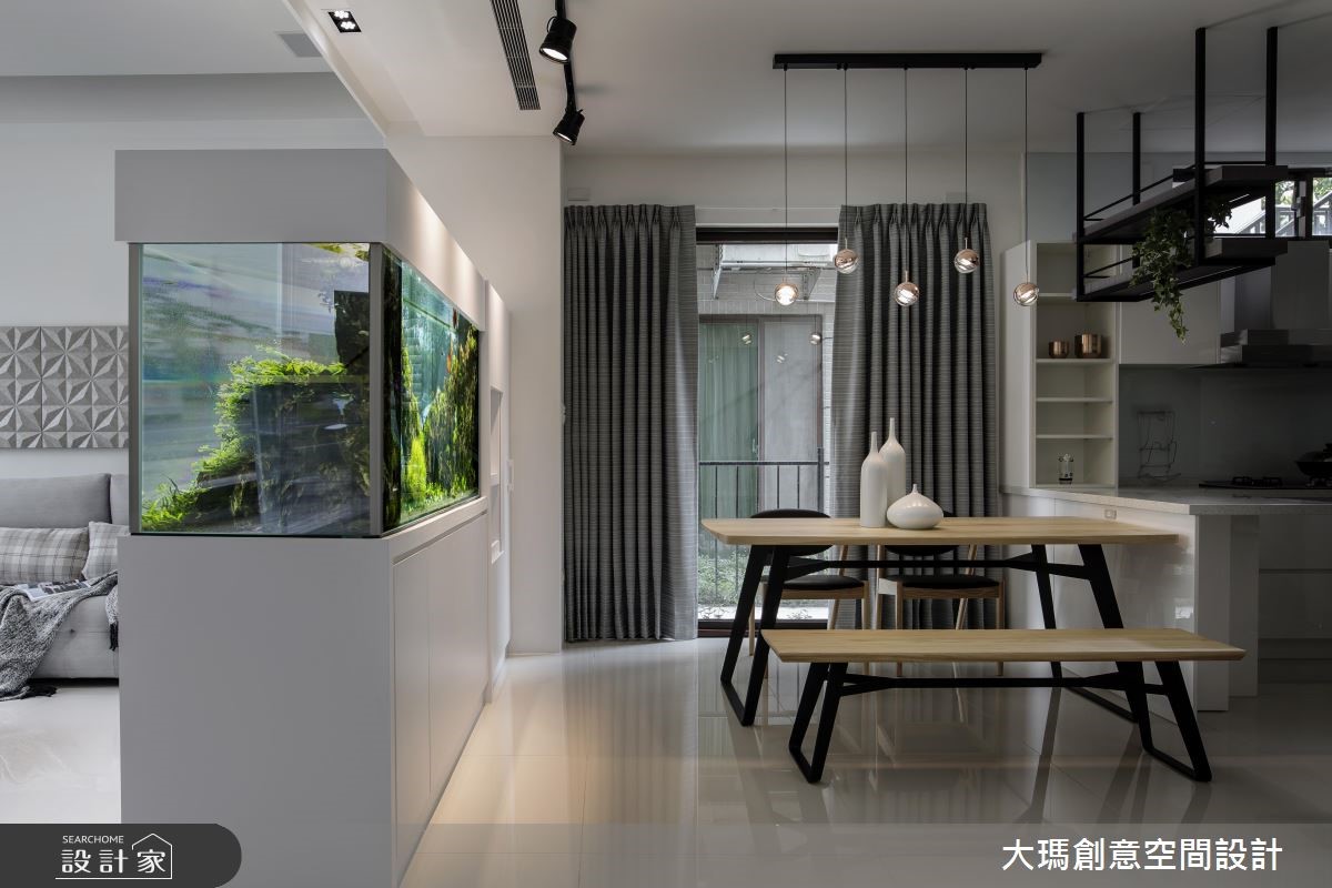 身为科技产业的屋主,面对繁忙的工作,回到家渴望能卸下繁琐的事物,与家人共享天伦之乐。因此透过大量的白色饰底,以简约风格铺陈出空间氛围,透过水族箱与半高墙体界定出客、餐厅,并将大自然的生命力引入室内。【隔断不做满,让光线穿透更明亮】干净、无刻意装修的客厅里,背墙以灰色造型饰板堆叠,增添些许设计新意;电视墙以大理石拼接,从直条纹到自然纹理的石材呈现,刻划出丰富的层次感,随着自然光的洗礼,让空间更显开阔、舒心。阶梯旁以半高墙体围塑出餐厅,并赋予双面机能,面向客厅的位子嵌入水族箱,背面则结合收纳柜,满足收纳需求且达到区域划分的功能。而餐厨区则利用淡雅的原木餐桌椅结合黑色铁件,勾勒出渐层的视觉美感。