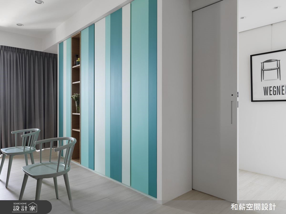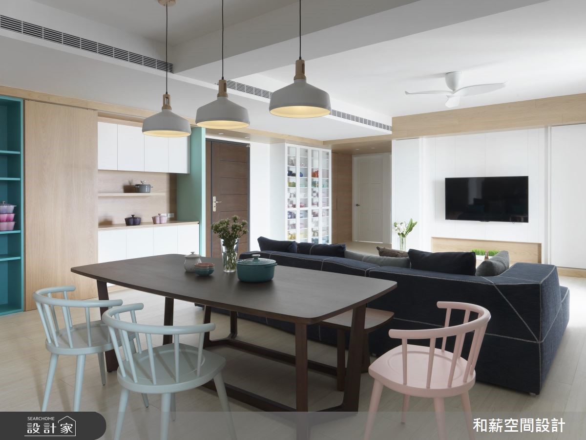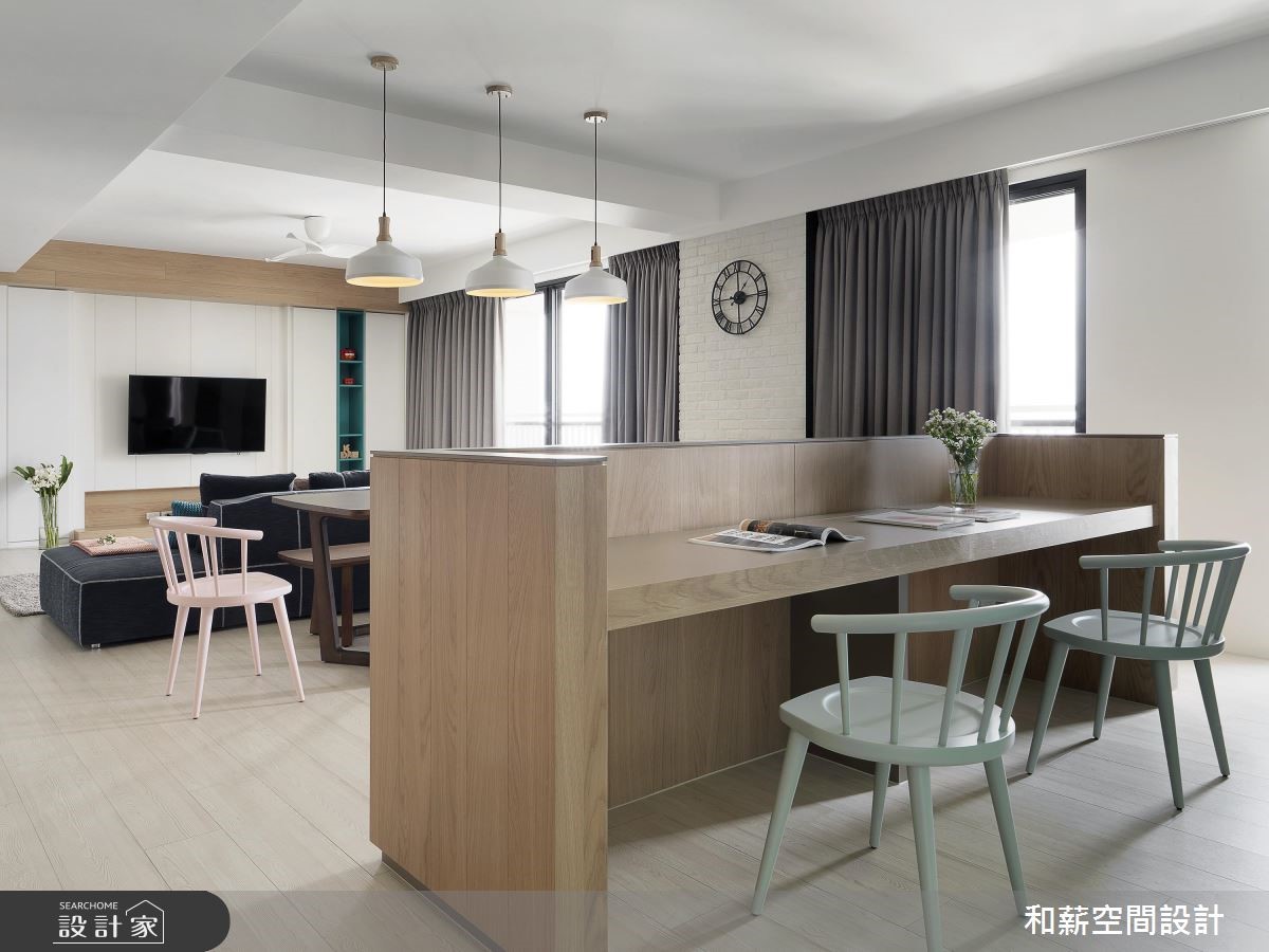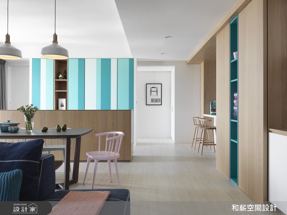 这户二手房中,设计师以北欧风格定调,并将原有一室隔断拆除,透过客厅、餐厅、书房、厨房的开放整合,提供开阔的公共领域视野,搭配北欧风的清新感,打造出亲子同乐的生活场景。【渐层蓝色,空间注入活力】公共区域内,将橱柜沿着墙面安排,并给予跳色主题,透过白色、浅色木作、蓝绿色等相互融合,构成清新的色彩美学,创造森林般的室内想象。同时公共领域采用开放设计,将书房纳入厅区,保留光线、视线的通透,并让书房后方的渐层蓝绿书柜成为空间的视觉焦点。餐厨区除了规划闲适的开放吧台,亦以木作包复柱体与天花,框塑出温润的用餐氛围。并悬吊三盏造型栗子灯,带出可爱的童趣。卧室内,则在床头加入充分机能,,搭佐隐约的光源照明,在大地色、白色的合宜比例之中,开启舒适情境。