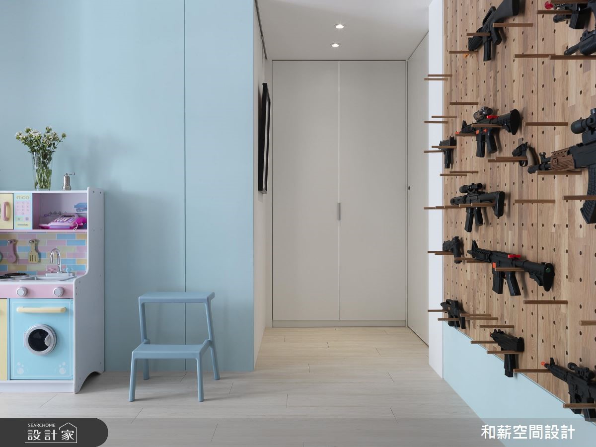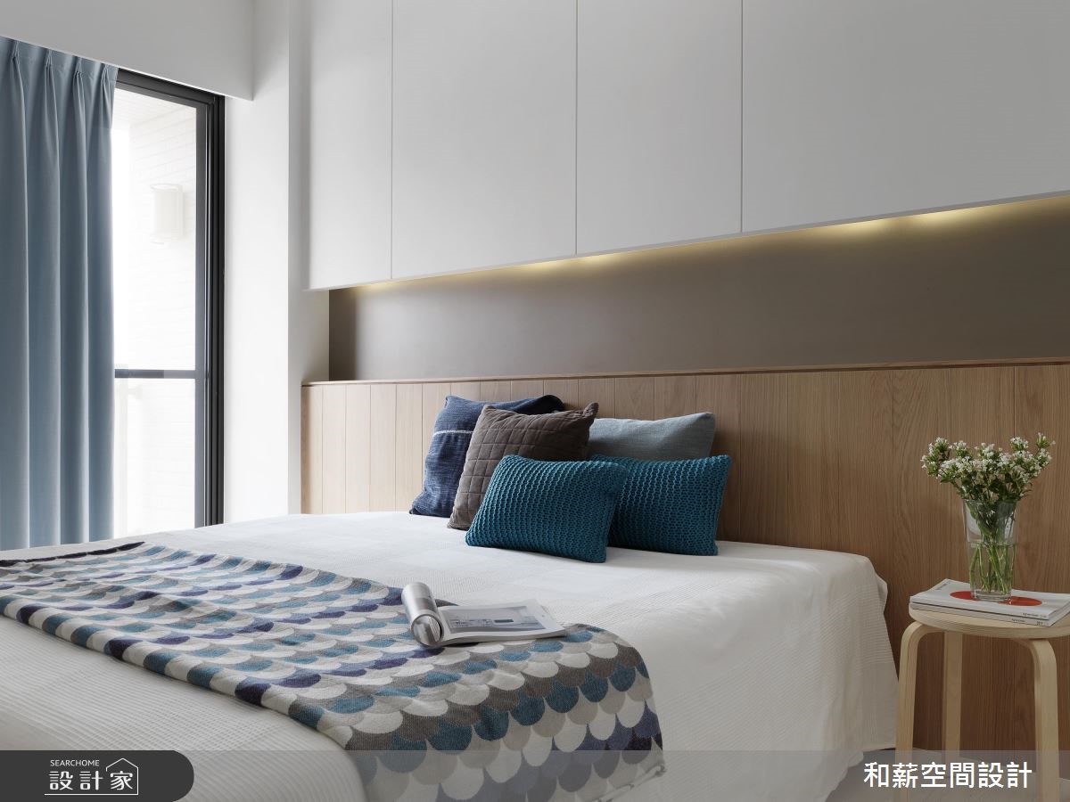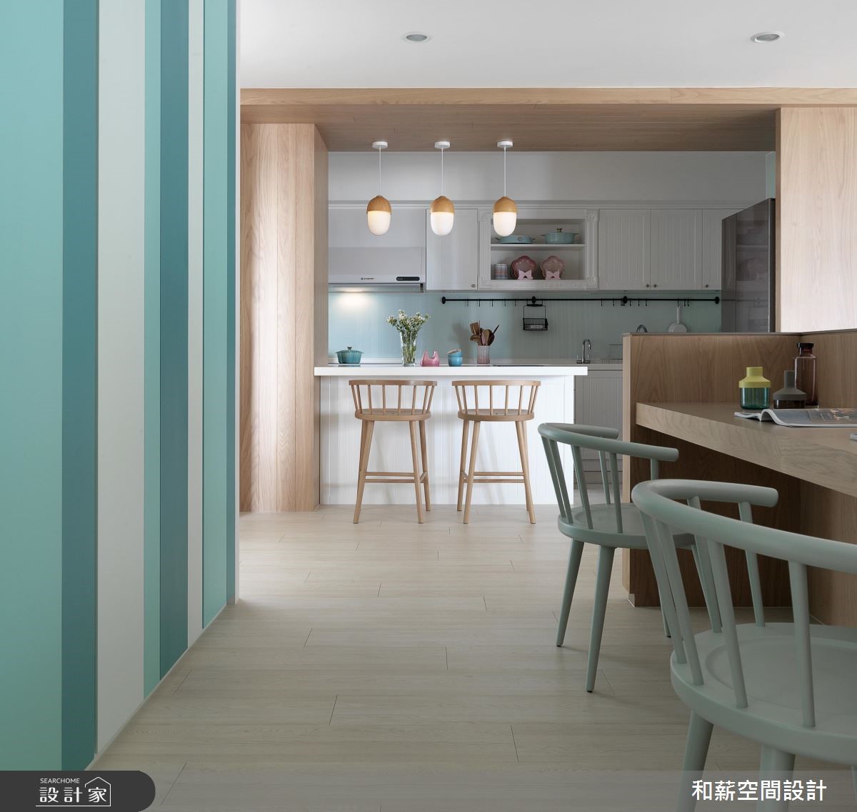 这户二手房中,设计师以北欧风格定调,并将原有一室隔断拆除,透过客厅、餐厅、书房、厨房的开放整合,提供开阔的公共领域视野,搭配北欧风的清新感,打造出亲子同乐的生活场景。【渐层蓝色,空间注入活力】公共区域内,将橱柜沿着墙面安排,并给予跳色主题,透过白色、浅色木作、蓝绿色等相互融合,构成清新的色彩美学,创造森林般的室内想象。同时公共领域采用开放设计,将书房纳入厅区,保留光线、视线的通透,并让书房后方的渐层蓝绿书柜成为空间的视觉焦点。餐厨区除了规划闲适的开放吧台,亦以木作包复柱体与天花,框塑出温润的用餐氛围。并悬吊三盏造型栗子灯,带出可爱的童趣。卧室内,则在床头加入充分机能,,搭佐隐约的光源照明,在大地色、白色的合宜比例之中,开启舒适情境。