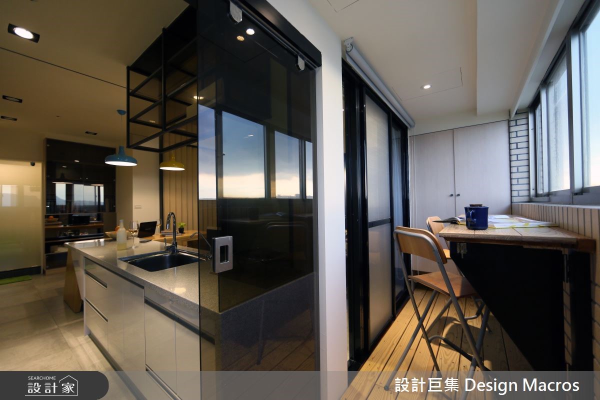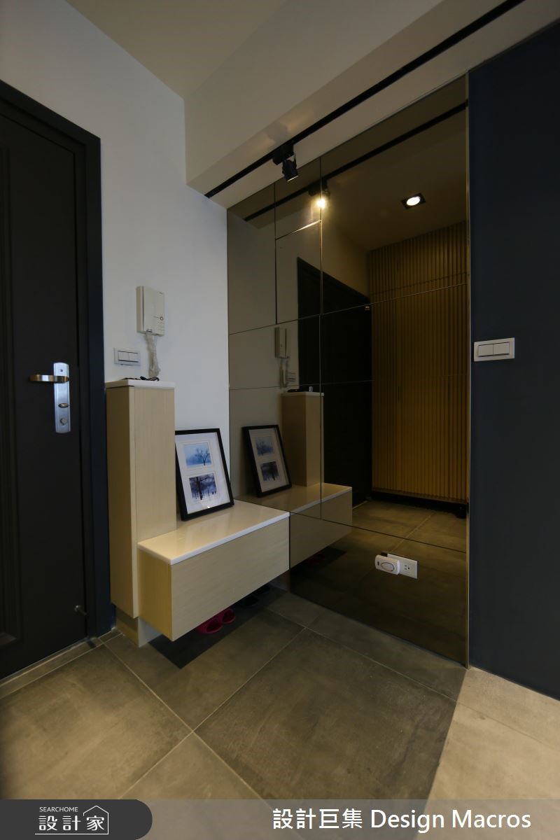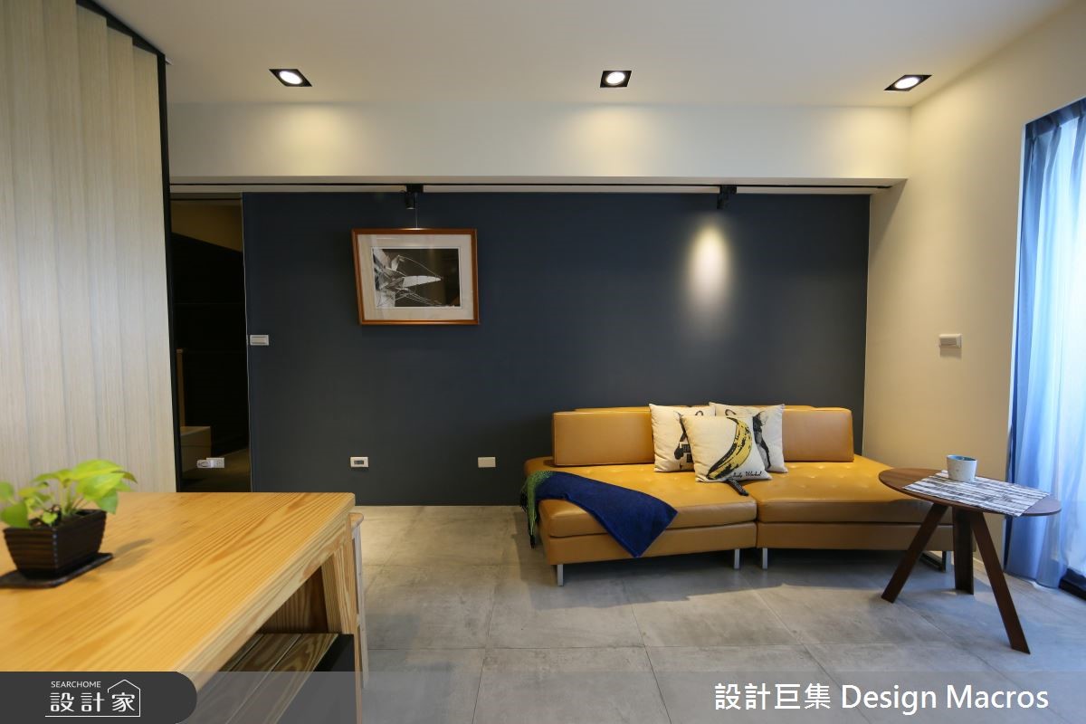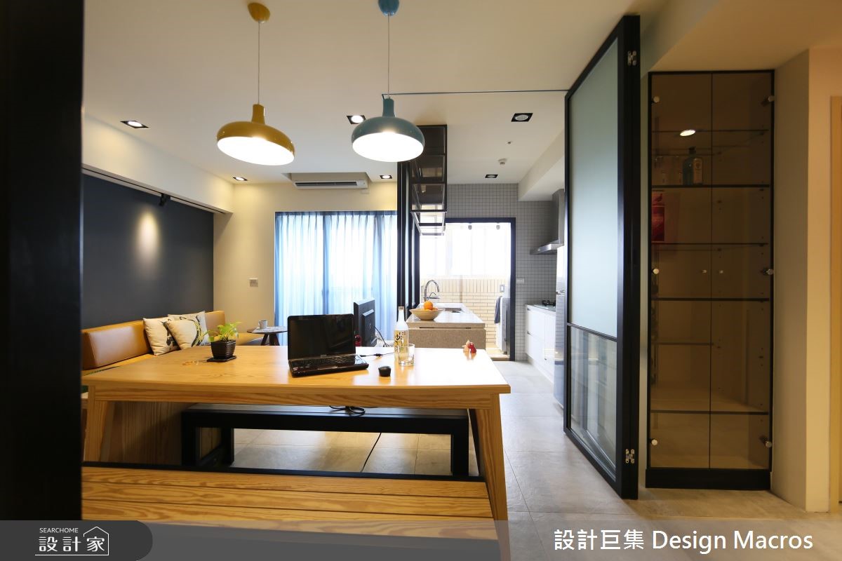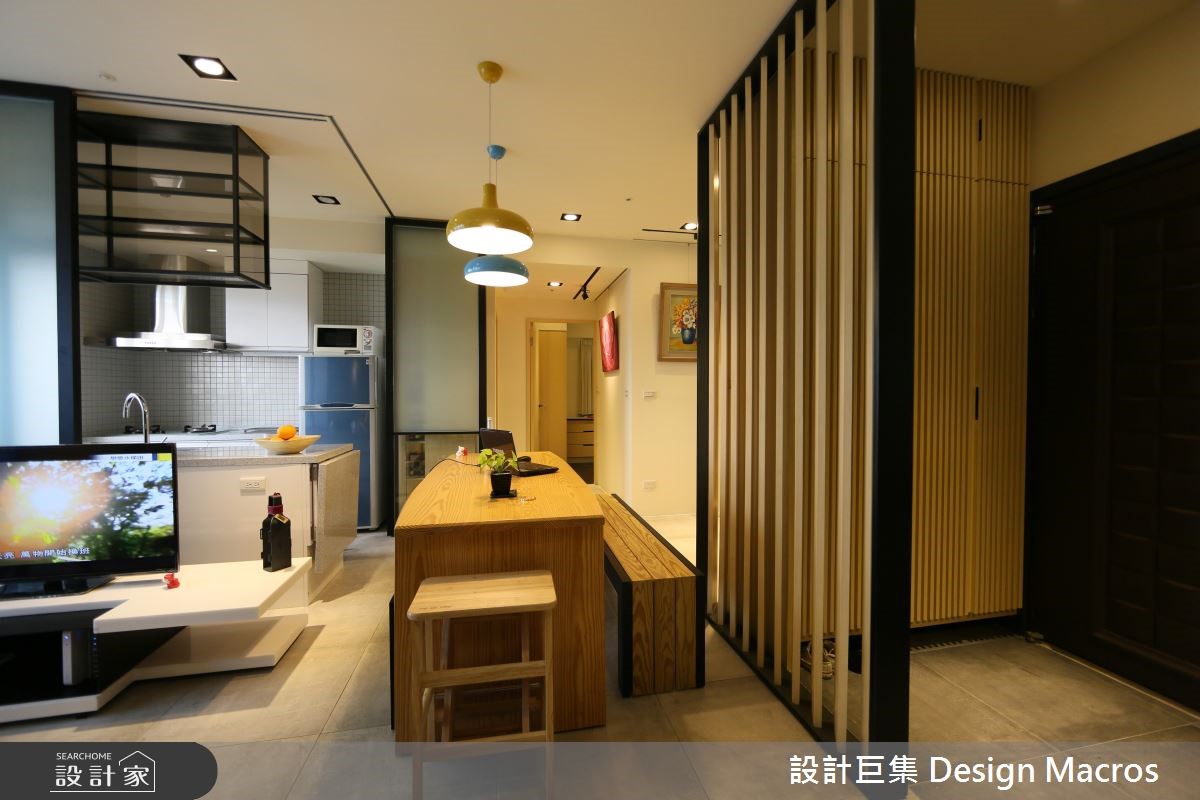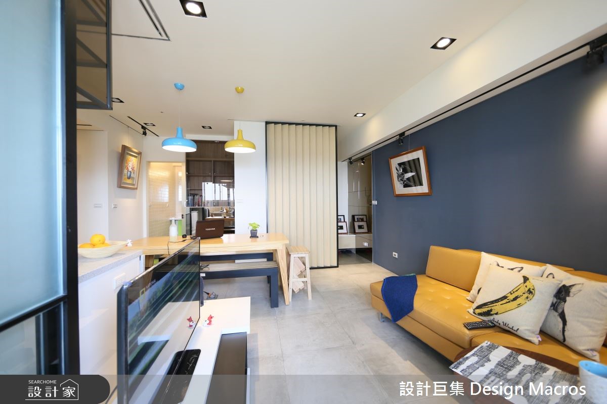 94平方米的空间,屋主是位喜爱简约温馨风格的单身女性,希望将位居高楼层的20年老屋翻新,打造单身女郎专属的质感宅。【善用畸零空间,满足收纳需求】玄关处以活动合板格栅屏风划分领域,搭配茶镜达到视觉放大效果,加上柜体与物台,打造利落的收纳动线。有鉴于人口需求简单,将厨房改为透光折迭拉门的半开放设计,并结合吧台与酒柜,打造符合单身贵族的生活习性,更取消原先的和室规划,转为两间居室所用。为了要符合女主人对收纳与多元机能的需求,设计师利用柜体取代客浴、与餐厅间的隔断墙,卧房则善用床底空间,满足日常收纳。而在色彩搭配上,则利用黄、蓝色调,彰显了屋主理性中带点幽默的个性层次。
