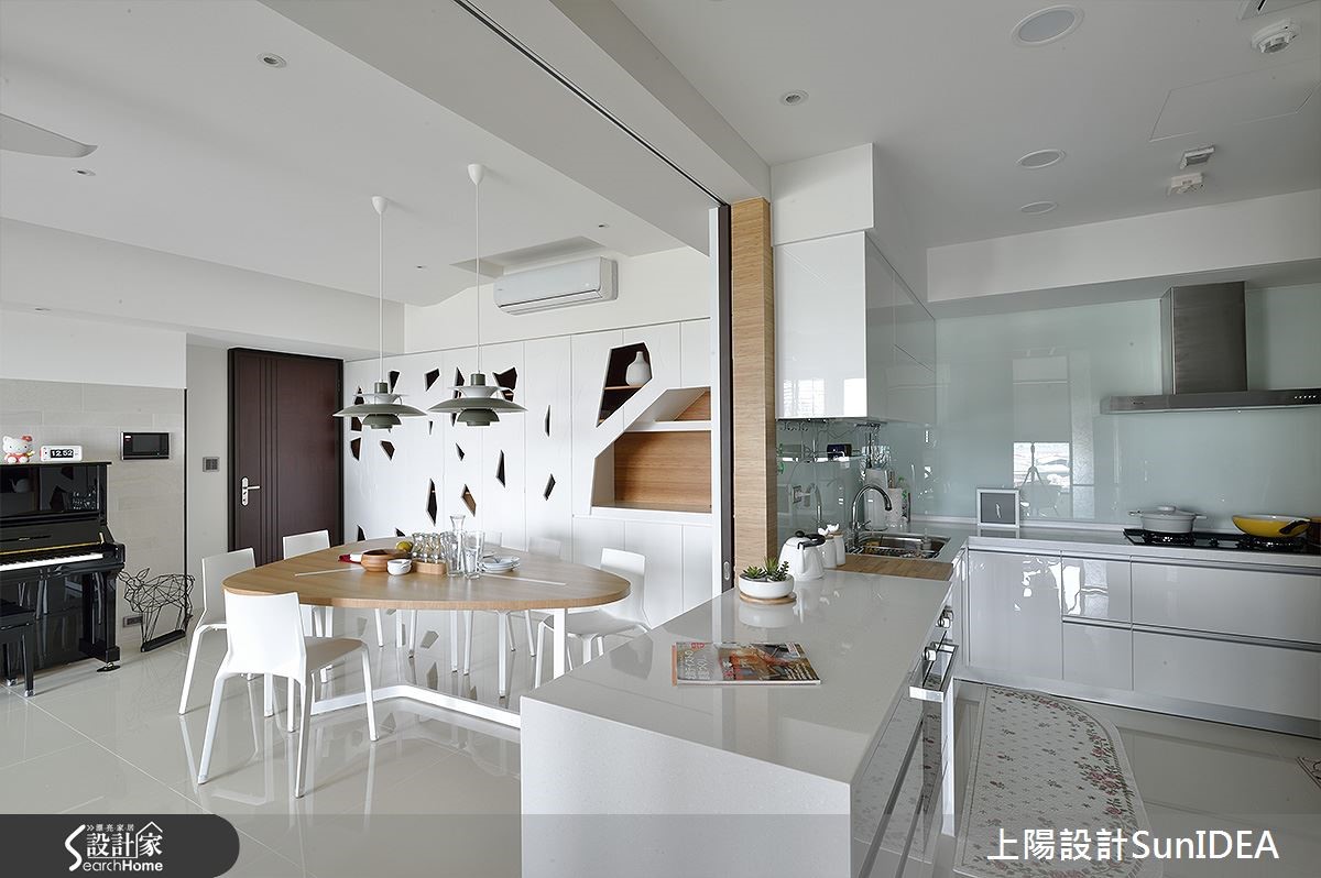设计师为149平方米居家带入纯白色调及木作元素,勾勒出温馨的空间氛围;并将规划重点放在公共空间,让一家4口拥有互动度极高的可能性。现在,与小编一起来看看吧!【木作元素,营造温润居家氛围】整个居家空间运用了大量的木作元素,从一进门开始,即打造几何镂空悬柜,并沿着墙面延伸至用餐区域,包覆L型吧台区,再搭配玻璃推拉门,一同成为与半开放厨房之间的场域界定。除此之外,通往各房间的廊道天花,也利用木梁创造层次感,为现代风环境带来新意,更与客、餐厅的木质壁面相互链结。【轻浅用色,反映光线明亮空间】公共领域一方面利用木作的温润特质,同时也结合纯白光感,打造现代空间,进而营造宽阔的温馨氛围。而细节上,除了以白色为底,设计师未规划玄关屏隔,因此一进门即可感受开放空间与光的结合,体验光线透过木百叶窗棂射入纯白客厅的明亮感受。【日式简约气息,打造舒眠卧室】延续整体设计基调,主卧室规划白色衣柜、原木色调的木地板,营造出日式简约风格,进而提供减压舒眠的氛围。其次,推开床尾的隐形门即是更衣室,除了规划收纳柜格,并打造化妆台,满足女主人的使用需求。上阳设计善用充足的光线,搭配开放格局,满足家人互动的需求;而且特别的是,将建材与几何镂空设计结合,在柜体门片上展现宛如森林般的剪影,更为公领域带来活泼的视觉律动。