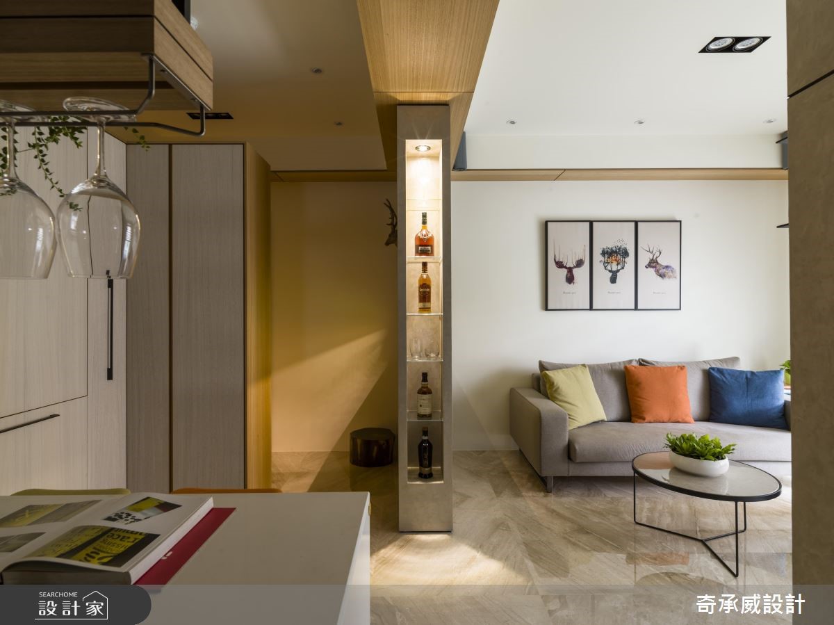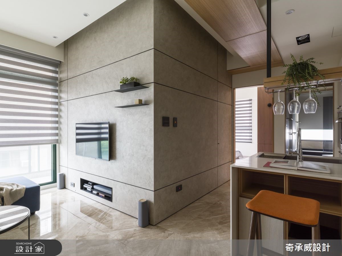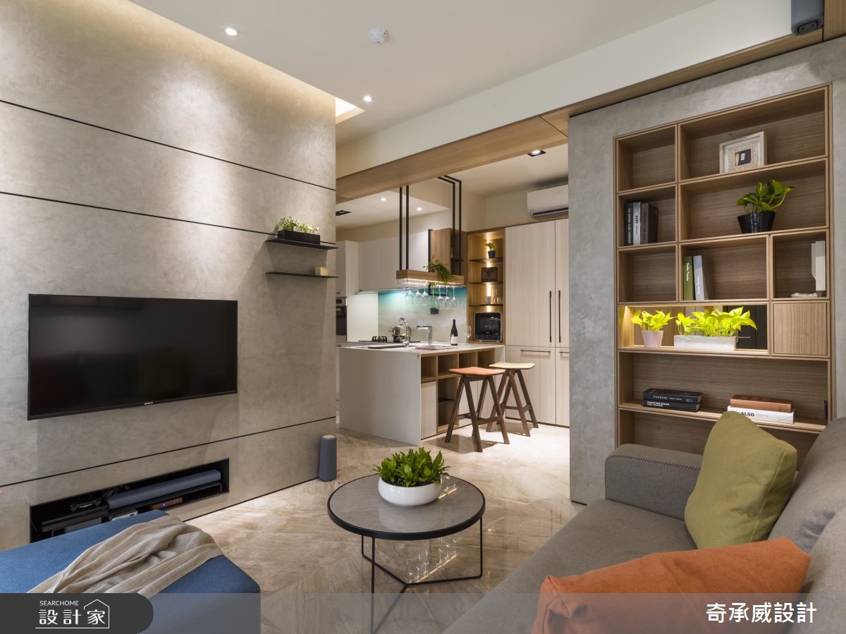 以简约现代风作为空间基底,并透过自然元素妆点一室,木作展示层架则满足收纳机能,同时酝酿人文美学,丰盈室内风貌;妥善的空间规划,让小空间依旧机能满点,设计没有极限。【全然放松、惬意舒适的气息】踏进玄关区,一面具备屏风机能的墙体,巧妙界定内外领域,鹿角装饰与中央镂空的绿意植栽,让人随即全然放松,感受惬意的气息;太阳光穿透公共领域的玻璃落地窗,洒落在帝诺大理石铺陈的地坪,映照一室洁净明亮。【原木质感与光源,调和居家氛围】无刻意装修的空间,天花板以木纹贴覆大梁,消弭突兀结构体,与原木质感展示柜、家具相互呼应,伴随光源酝酿,调和家屋氛围;并藉由朴实灰打造电视墙,以壁面没入天花板的方式,加上立面沟缝比例切割,让空间更延伸。【L形动线,形塑流畅行走脉络】沿着电视墙侧边,来到餐厨领域,还可直抵卧室空间,L形动线规划让领域切换一气呵成;中岛与厨具同样以L形摆设,沿着大梁下方打造收纳机能,不仅满足实用需求,更替公共领域争取更多空间,形塑宽敞、流畅的行走动线。