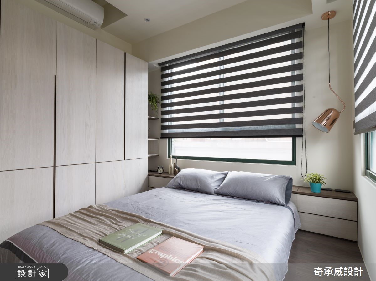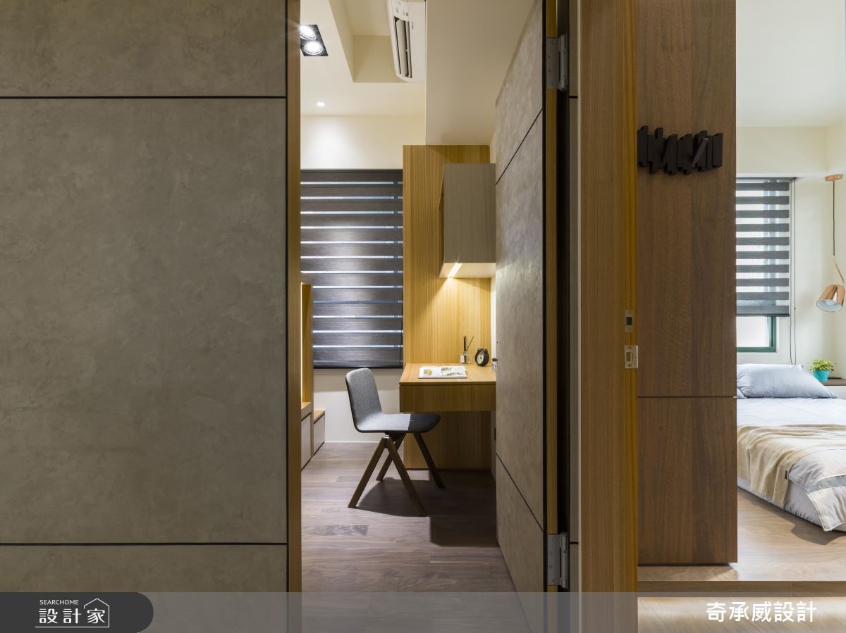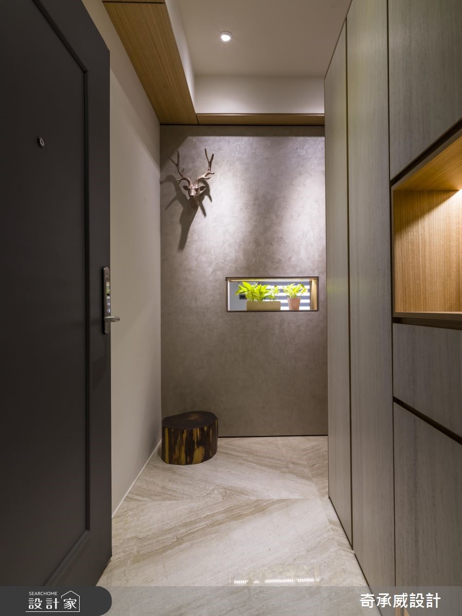 以简约现代风作为空间基底,并透过自然元素妆点一室,木作展示层架则满足收纳机能,同时酝酿人文美学,丰盈室内风貌;妥善的空间规划,让小空间依旧机能满点,设计没有极限。【全然放松、惬意舒适的气息】踏进玄关区,一面具备屏风机能的墙体,巧妙界定内外领域,鹿角装饰与中央镂空的绿意植栽,让人随即全然放松,感受惬意的气息;太阳光穿透公共领域的玻璃落地窗,洒落在帝诺大理石铺陈的地坪,映照一室洁净明亮。【原木质感与光源,调和居家氛围】无刻意装修的空间,天花板以木纹贴覆大梁,消弭突兀结构体,与原木质感展示柜、家具相互呼应,伴随光源酝酿,调和家屋氛围;并藉由朴实灰打造电视墙,以壁面没入天花板的方式,加上立面沟缝比例切割,让空间更延伸。【L形动线,形塑流畅行走脉络】沿着电视墙侧边,来到餐厨领域,还可直抵卧室空间,L形动线规划让领域切换一气呵成;中岛与厨具同样以L形摆设,沿着大梁下方打造收纳机能,不仅满足实用需求,更替公共领域争取更多空间,形塑宽敞、流畅的行走动线。
