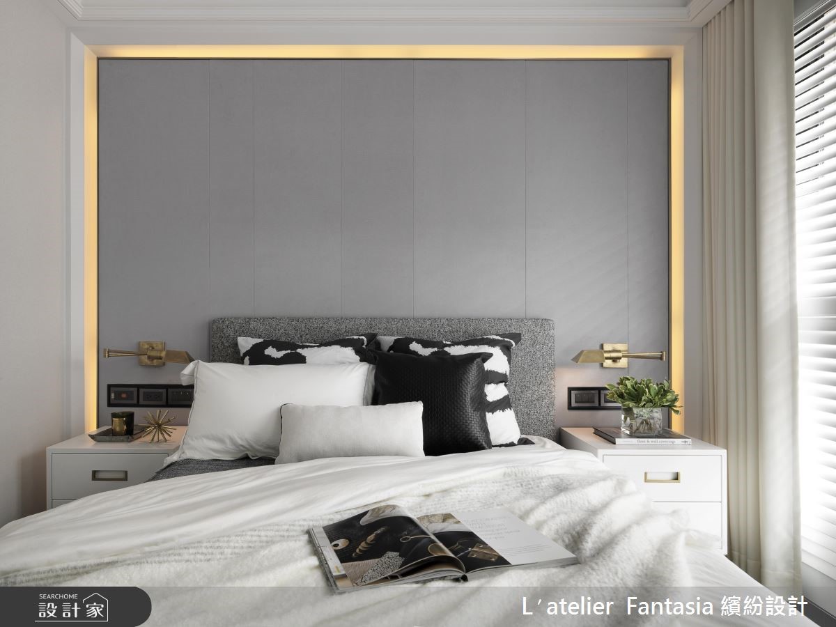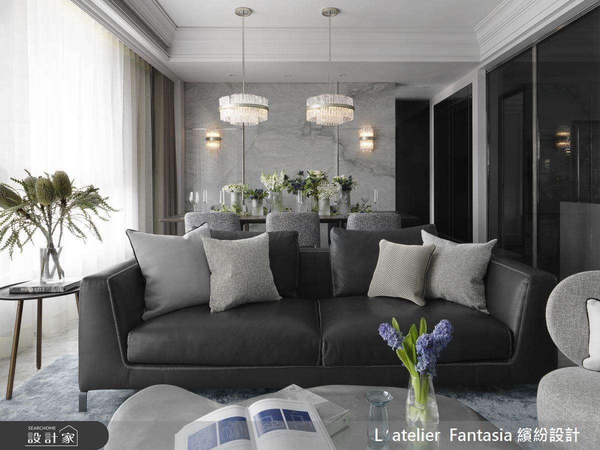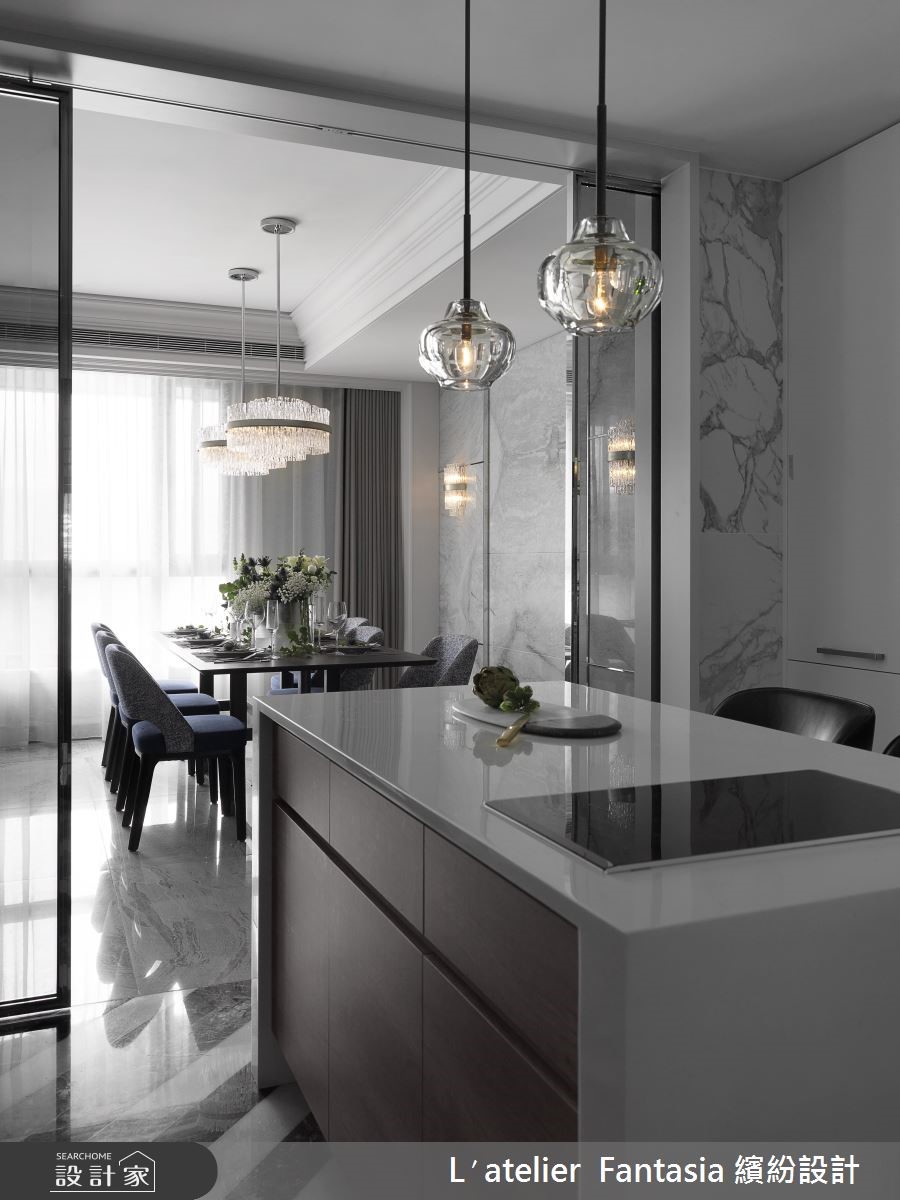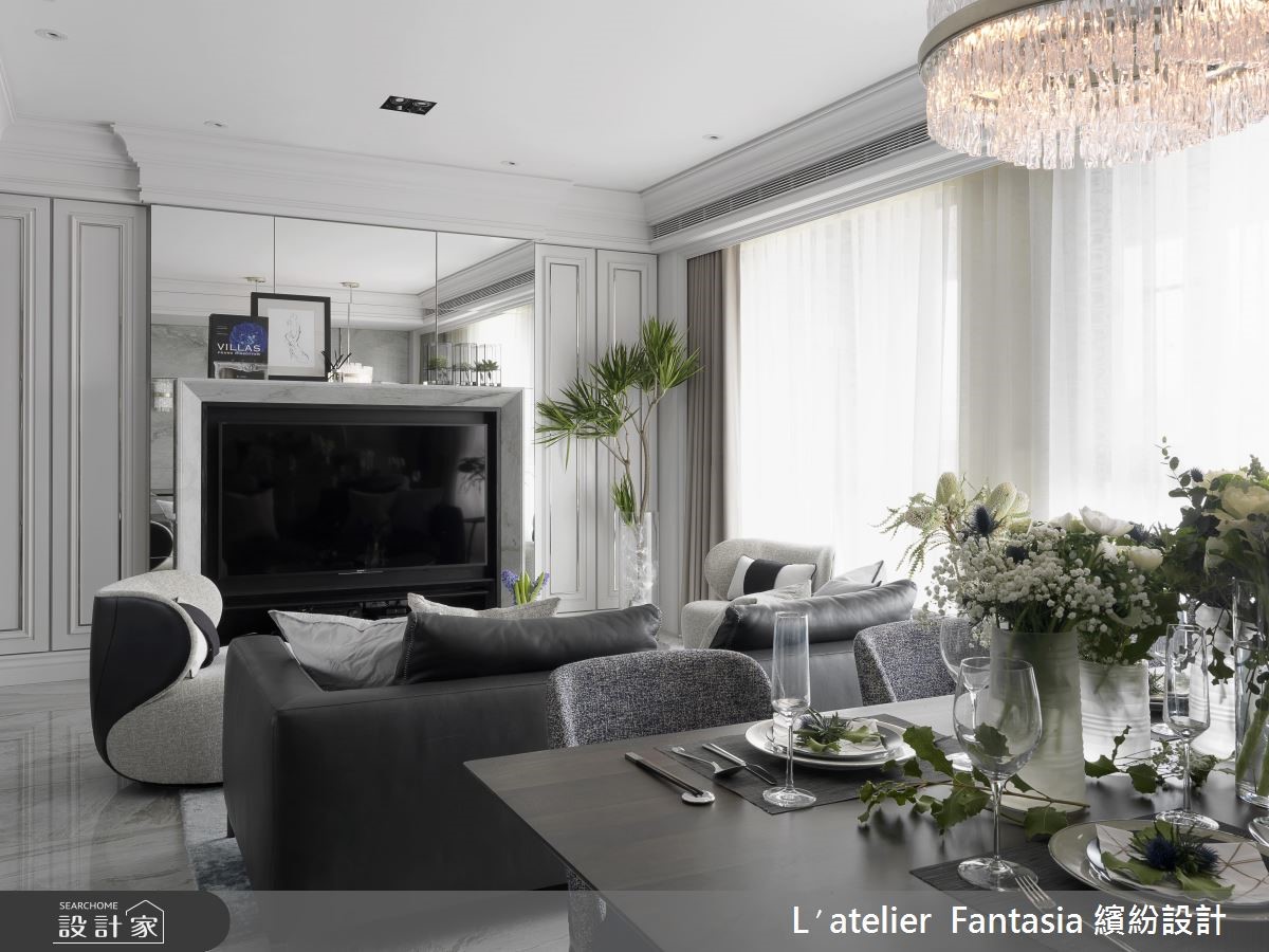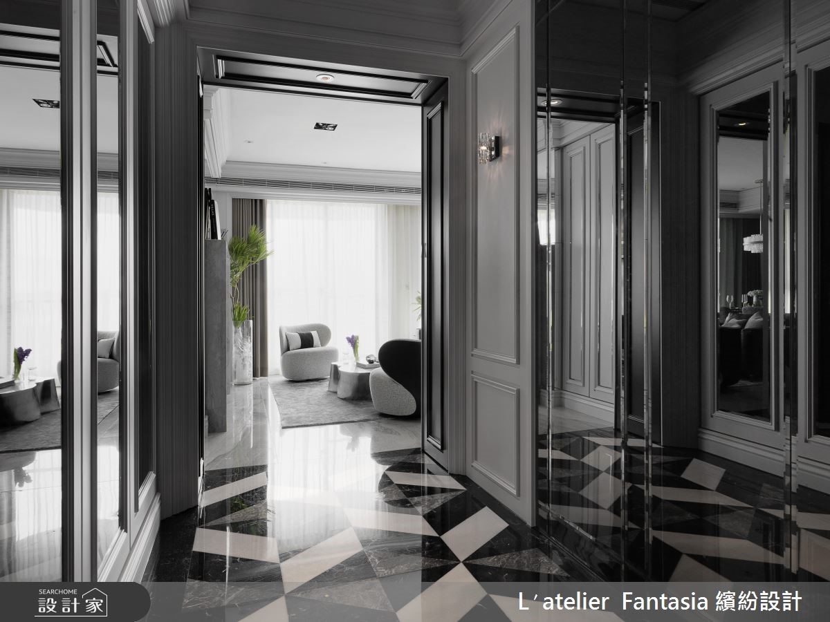 142平米的空间必须容纳三代五口人的所有生活所需,缤纷设计无论公、私领域都依照屋主全家人的喜好与风格量身定制,让新古典宅邸兼具时尚精品质感。 【利用沉稳色系,混搭质感居家】玄关以大量镜面佐以拼花地坪,予人简练中不失华丽的贵族格调,公领域将客厅与餐厅前后配置,电视墙以精致的线板柜门结合镜面,餐厅背墙则以大着云丝肌理的大理石材质达成现代与古典间的平衡。就色彩搭配而言,从入门处至公共空间,无论是摆件、家具或建材,皆以比例秾纤合度的黑、白、灰三色构筑,当中更精巧的利用水晶灯饰与大量翠绿植栽点缀,完成沉稳气派且精致度十足的居家风景。【厨房结合中岛,完整烹饪动线】独立厨房以灰镜串连与餐厅的动线,并在厨房中央放置附有烹调功能的中岛吧台,更别出心裁的利用三色石材拼贴出人字拼地坪。私领域依据需求量身订制,长辈房以温柔色调搭配线板、水晶灯打造温馨质感兼具的舒眠空间。