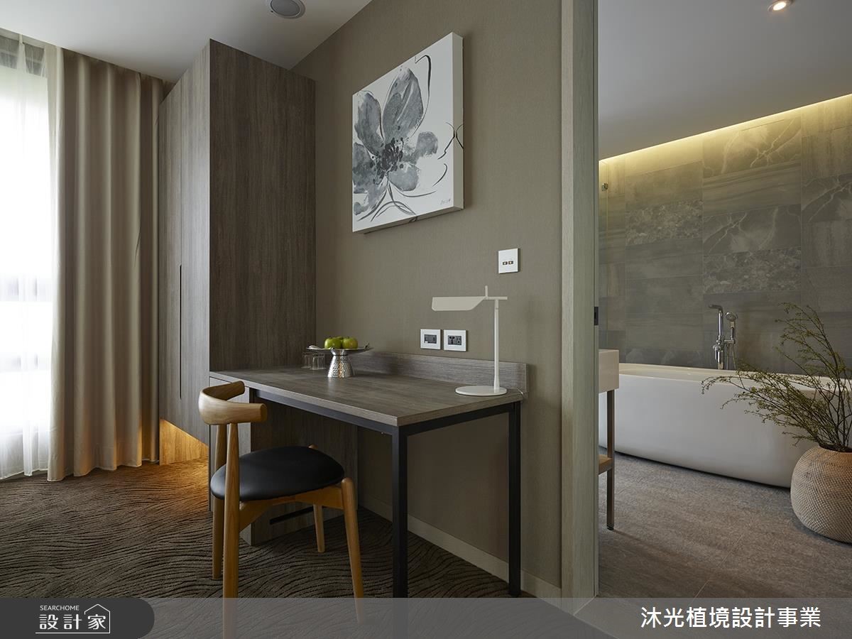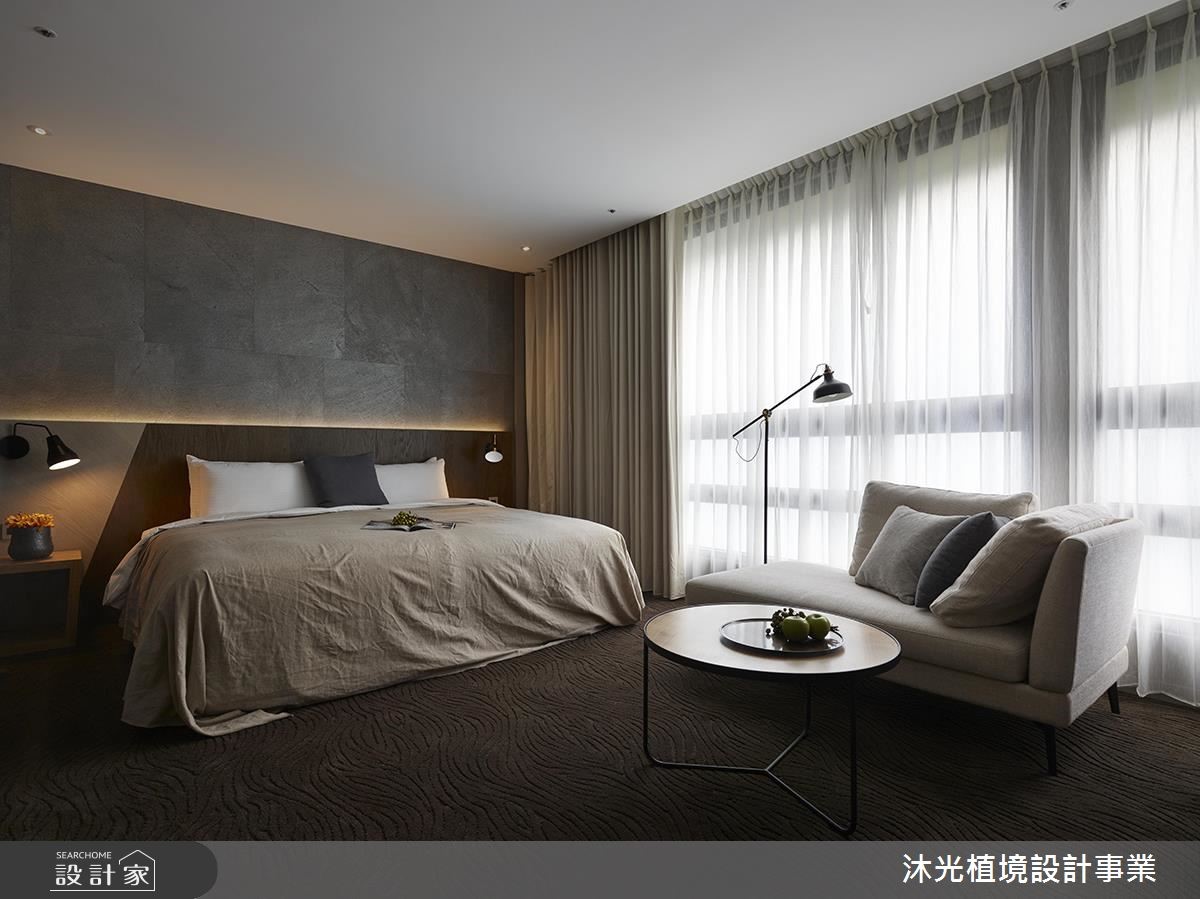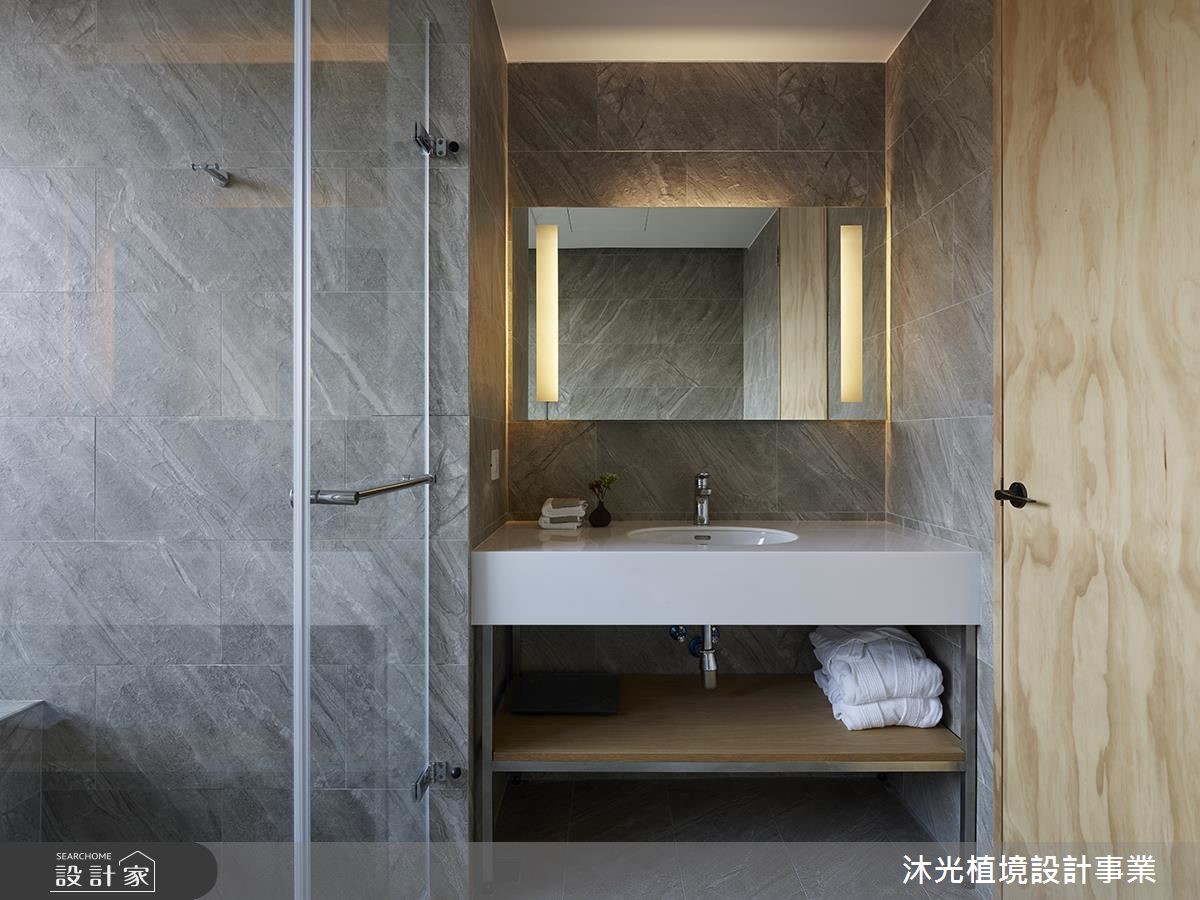 温润的木纹游走在空间里,交织出26平方米的快捷酒店,让短暂歇息的旅人,徜徉在惬意、自然的气息里,替下一段旅程继续充电。【温润材质,为空间增添自然气息】设计师以自然休闲风为主调,无论是采用大量的浅色木材质铺陈壁面、柜体,搭配自然日光的洒落,调和出温润、舒适的宜人气息;或是利用岩石般的壁面衔接深色木纹,创造出沉稳、静谧的休憩氛围,皆散发一股安定、闲适的感受。整体设计透过木、石、水三种具森林感的元素,并结合环保的概念,舍弃过多不必要的装修与收纳柜,让室内能够开放、通透,即使置身仅26平方米的空间里,也能享有舒心、宽敞之意。