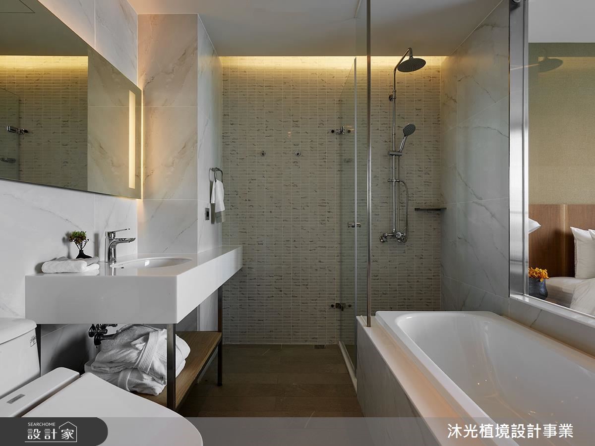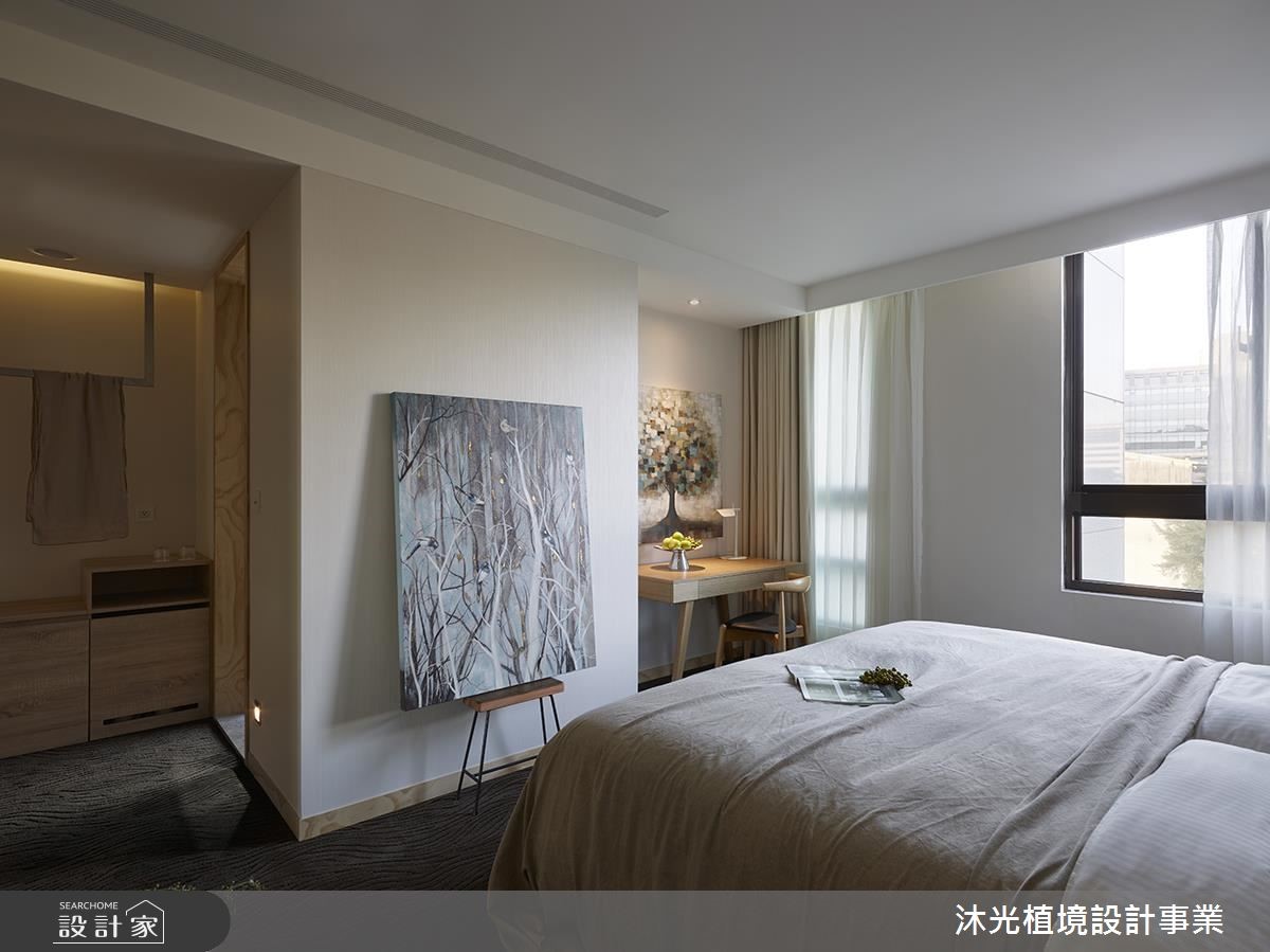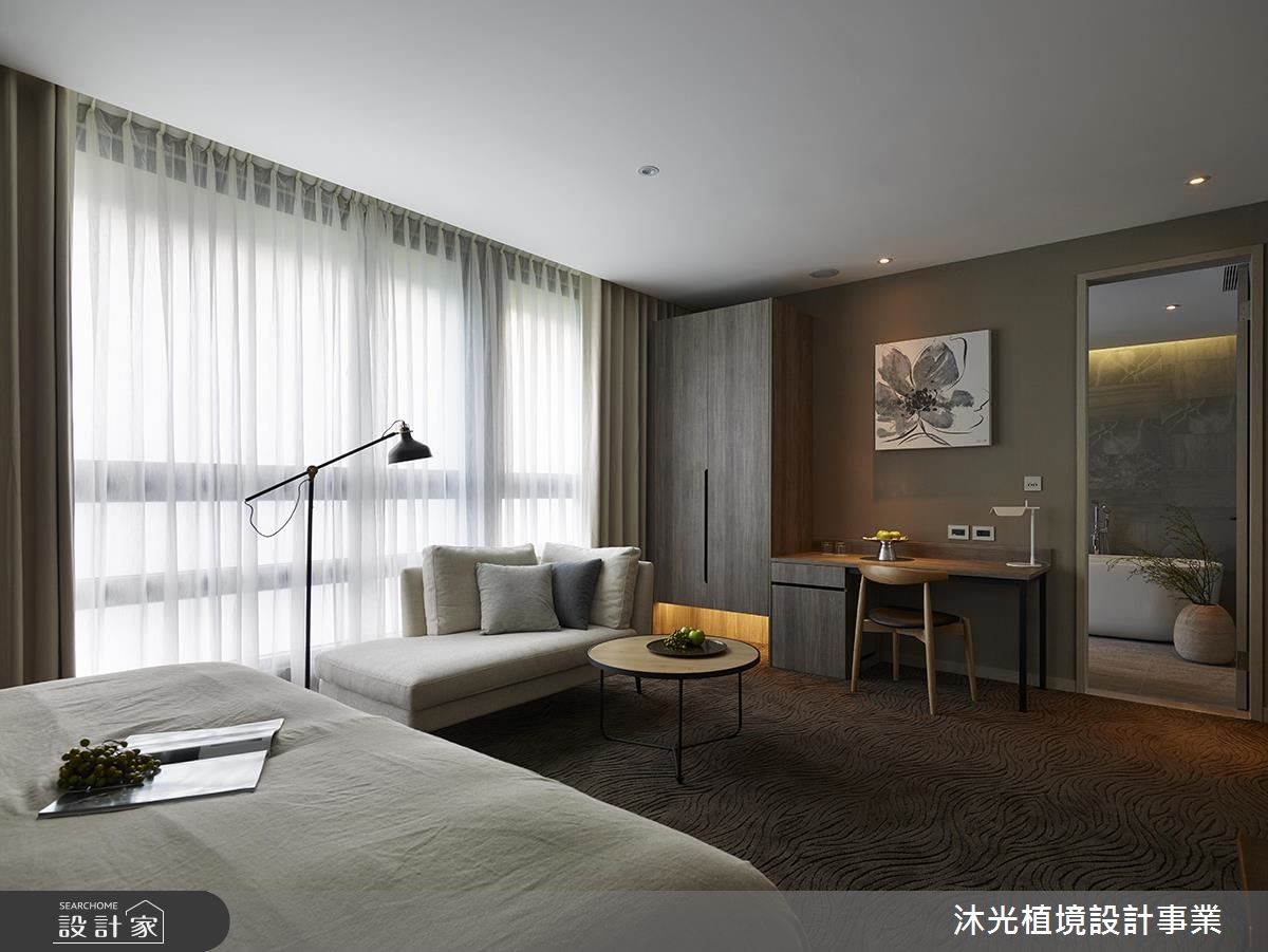 温润的木纹游走在空间里,交织出26平方米的快捷酒店,让短暂歇息的旅人,徜徉在惬意、自然的气息里,替下一段旅程继续充电。【温润材质,为空间增添自然气息】设计师以自然休闲风为主调,无论是采用大量的浅色木材质铺陈壁面、柜体,搭配自然日光的洒落,调和出温润、舒适的宜人气息;或是利用岩石般的壁面衔接深色木纹,创造出沉稳、静谧的休憩氛围,皆散发一股安定、闲适的感受。整体设计透过木、石、水三种具森林感的元素,并结合环保的概念,舍弃过多不必要的装修与收纳柜,让室内能够开放、通透,即使置身仅26平方米的空间里,也能享有舒心、宽敞之意。