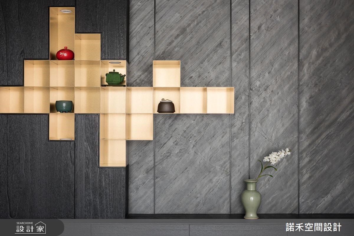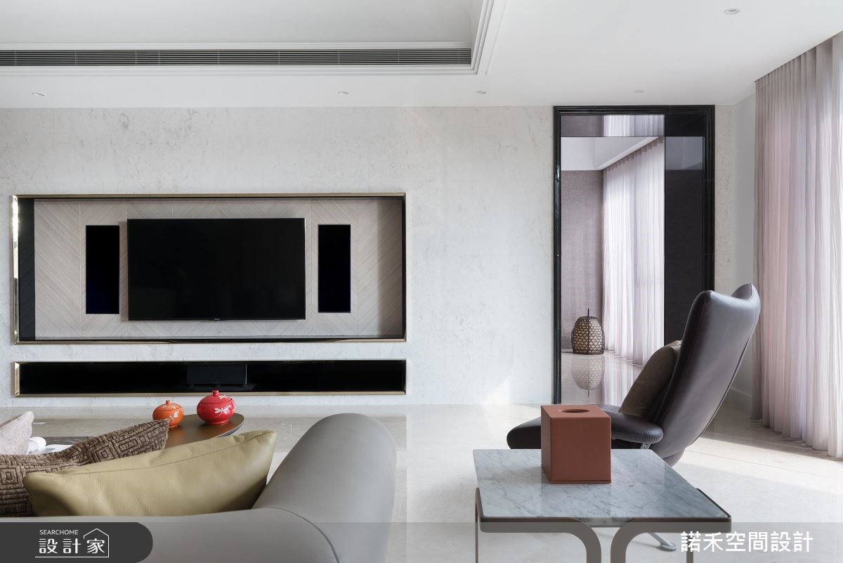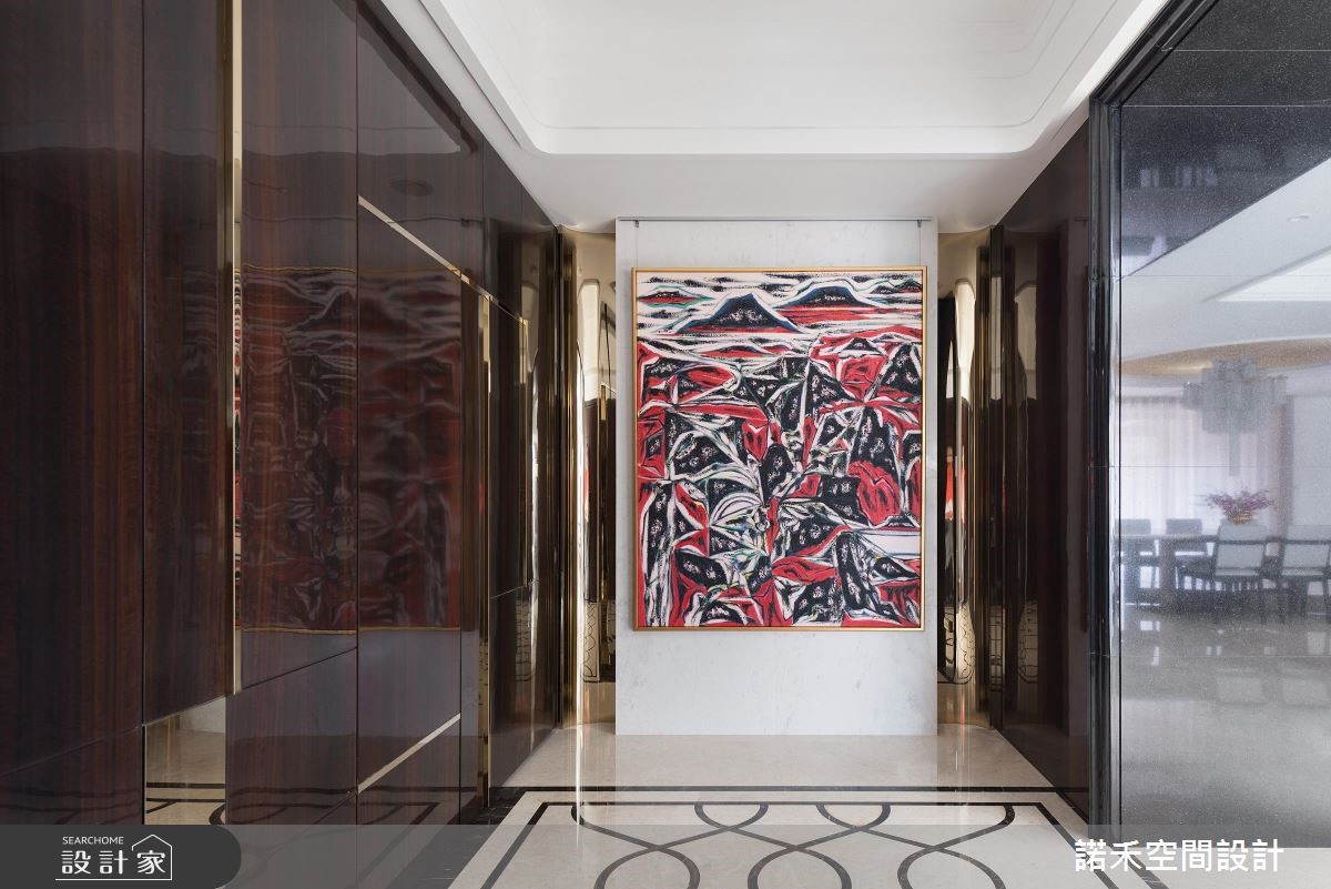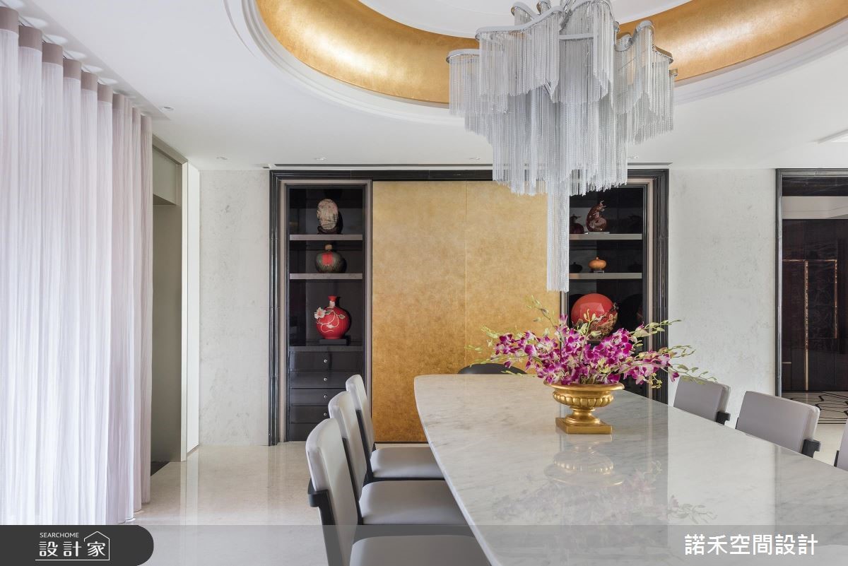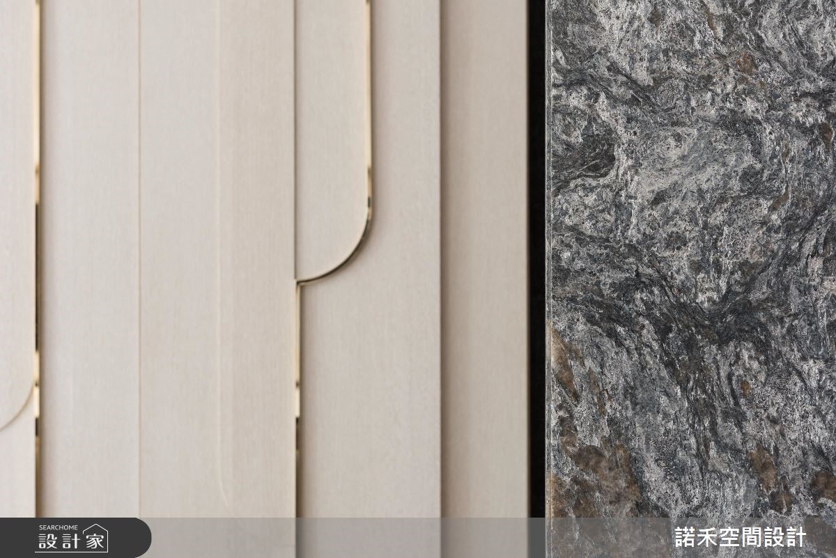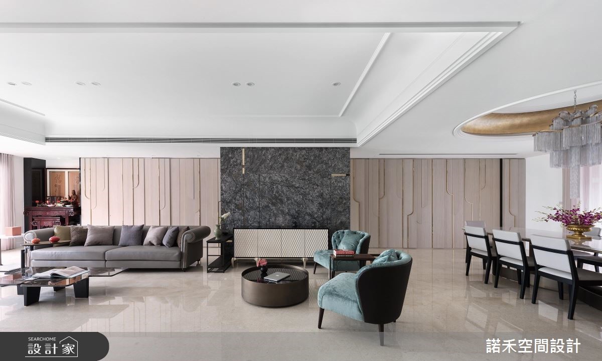 330平方米的混搭风居家,设计师将规划重点放在公共空间上,使用多元异材质搭接,佐以简洁的线条与细节修饰,传达出令人惊艳的新生活意境! 【多元材质,营造视觉丰富层次】独立的玄关动线,侧墙铺叙深色木皮钢烤,衬托聚焦的装饰画作,顺势将视野引导至轩敞大厅内;客厅则在沙发墙加入多元材质,以自然的浅色木质包覆化为墙面背景,搭配细致的金色修边,以及一道深灰大理石墙塑造对称画面。客、餐厅之间,运用天花板的高度与造型差异,作出领域分野,并在餐桌上方配置悬吊的艺术灯饰凝聚焦点,同时藉由珍藏艺品、雾面金、浅色石材等妆点立面,导引丰富的层次,型塑自成一格的精致感。主卧内,则在床头加入细腻而经典的布艺,搭配白色线板的勾勒贯穿,织就唯美的美式新古典气息,而梳妆台、窗边飘窗、百叶窗等元素,更充分酝酿了整体的人文设计品味!