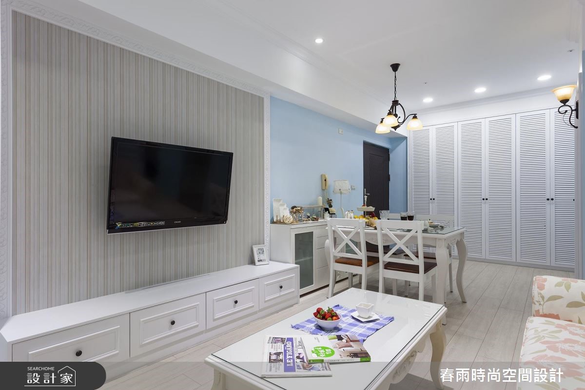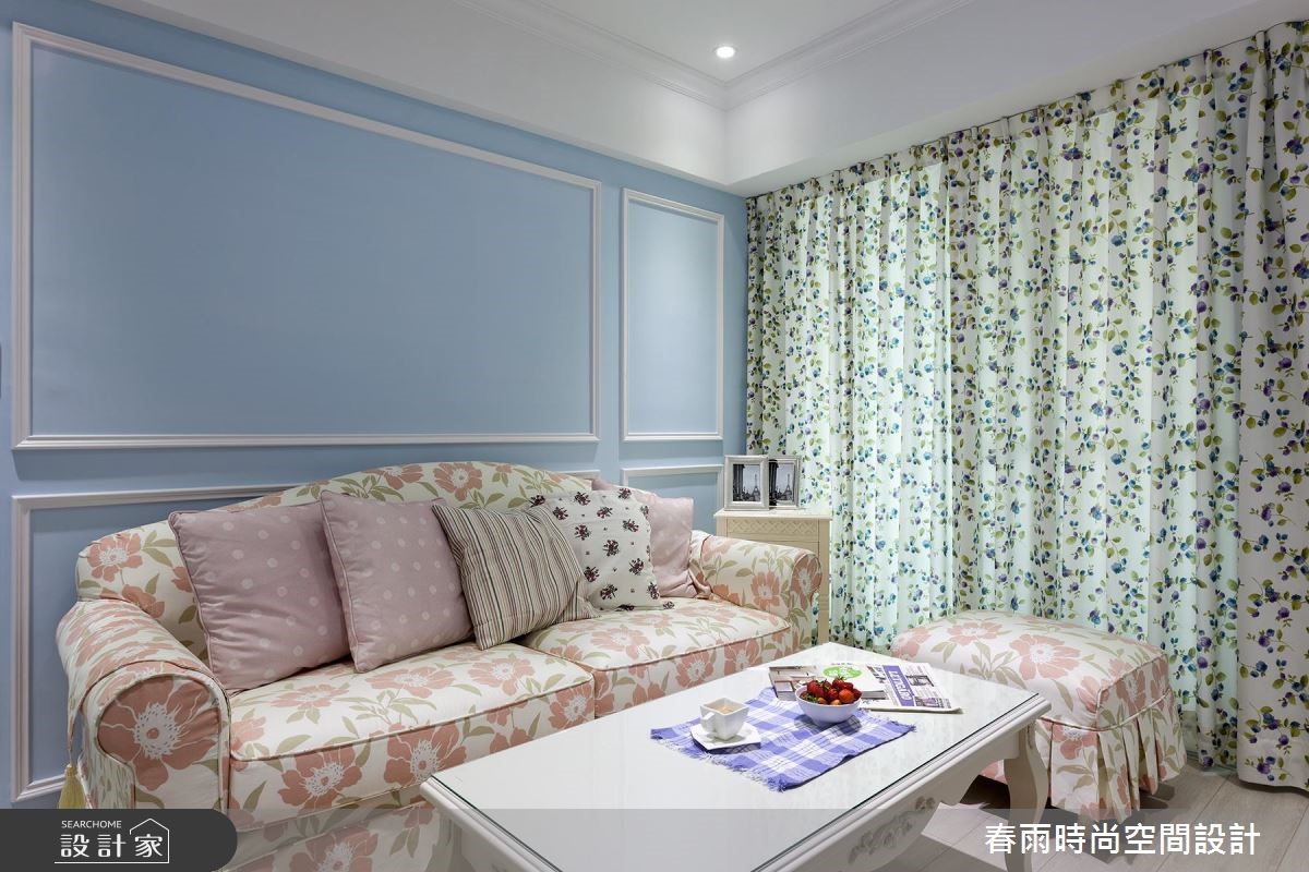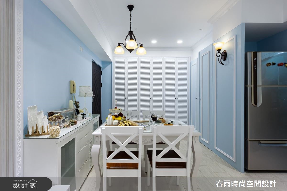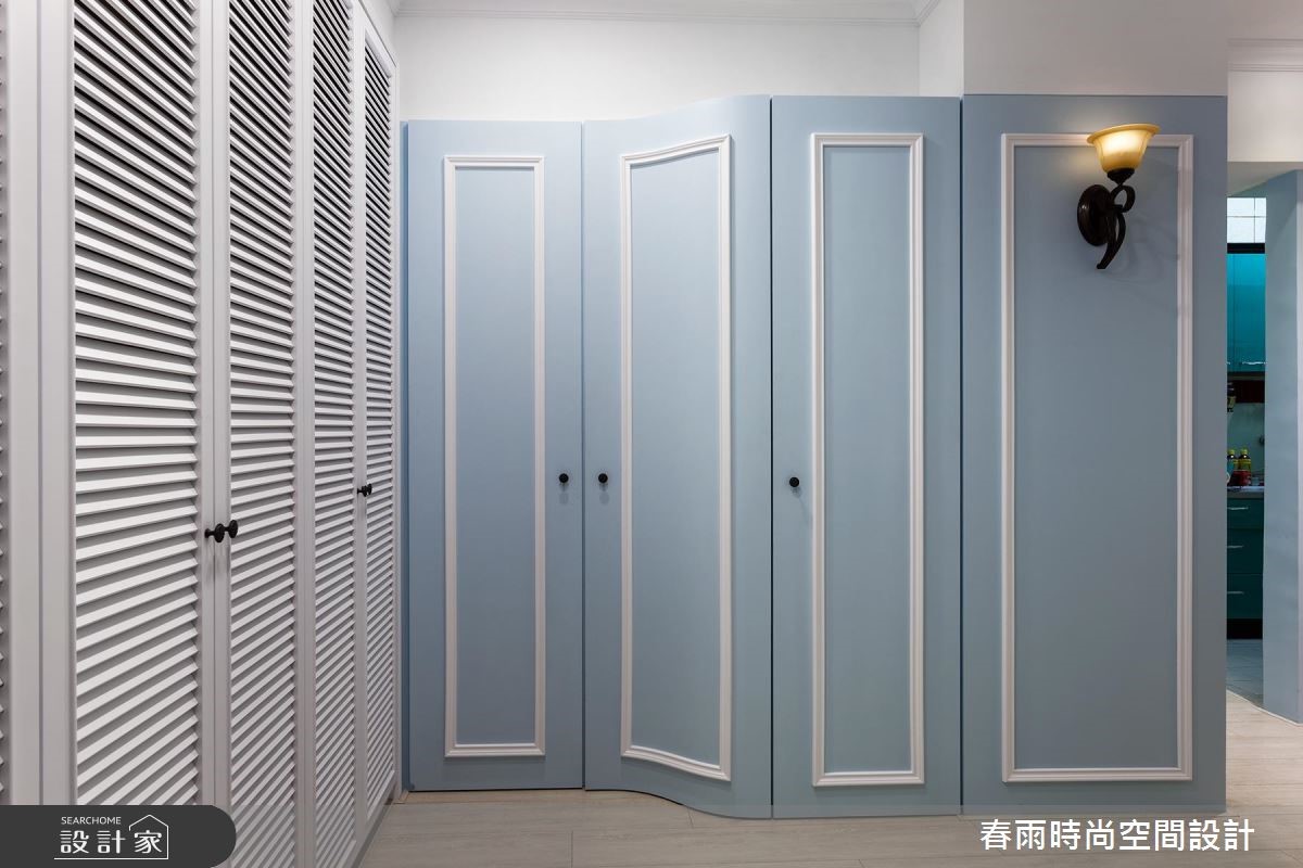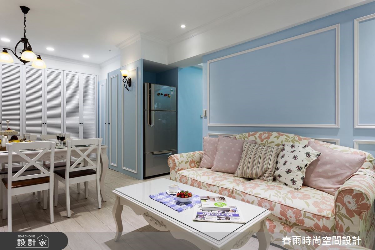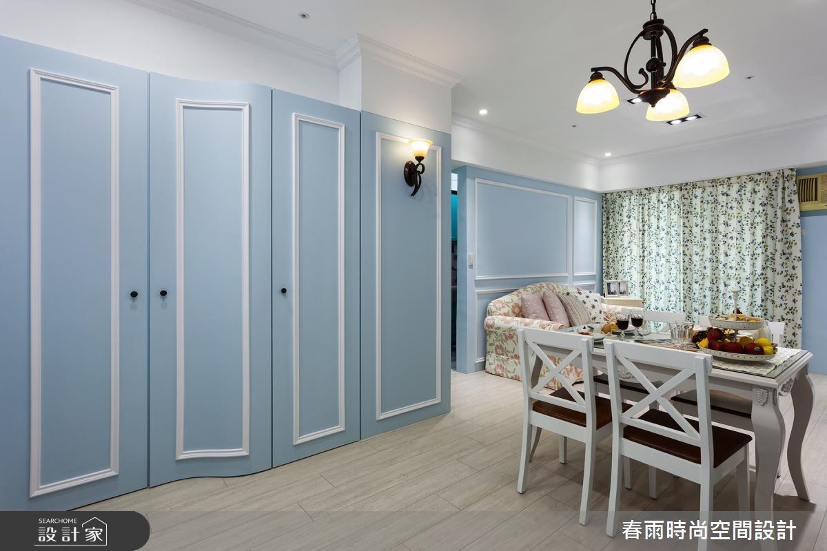 母女一起共享69平方米的老屋空间,透过春雨设计发挥收纳、美观兼具的专业,将重点放在公共空间,专门为女性量身打造乡村宅,展现细腻温柔的空间感受。【运用色彩精准描绘乡村元素】入门处以L型收纳柜收整屋主两人的鞋量与大型生活、家电用品,同时巧妙运用水蓝色柜面,修饰畸零角落、扩增收纳。由于人口单纯,以四人餐桌与餐柜框设开放式餐厅区域,同时成为玄关与客厅的交接处。本案着重风格营造,因此从入门开始,就以百叶柜门作为乡村风格定调,向内延伸,入口简约的婴儿蓝线板柜门及沙发背墙与同色调的淡雅油漆相互呼应,达成和谐的温柔景象。而针对软装选择,皆采用碎花样式的沙发及窗帘,以直条壁纸平衡甜美感受。家具与家饰则采用附有圆脚的桌几和单椅,搭配造型铁件灯饰,让乡村风格更趋完整。