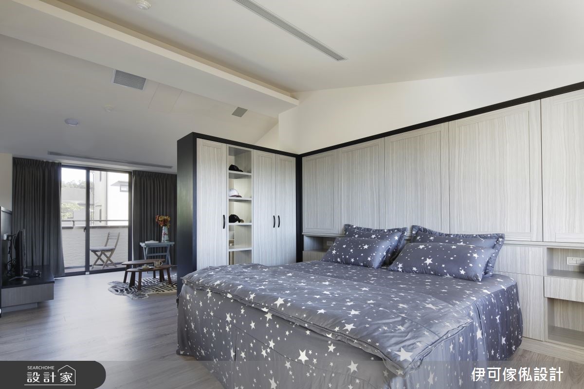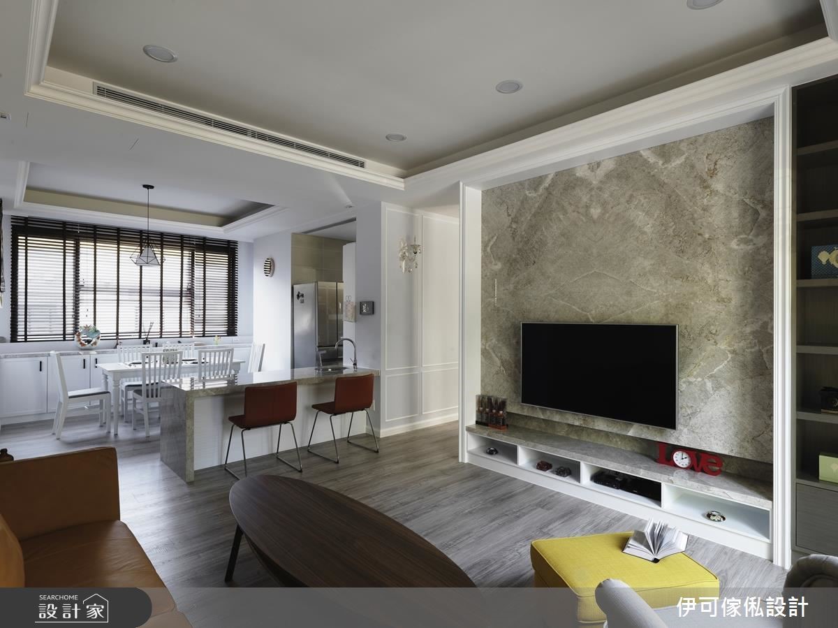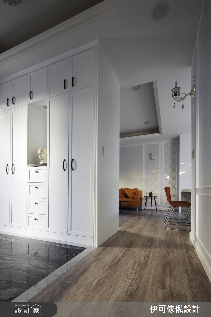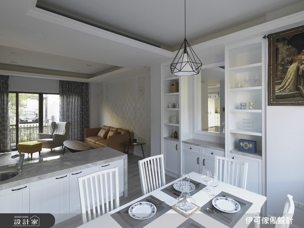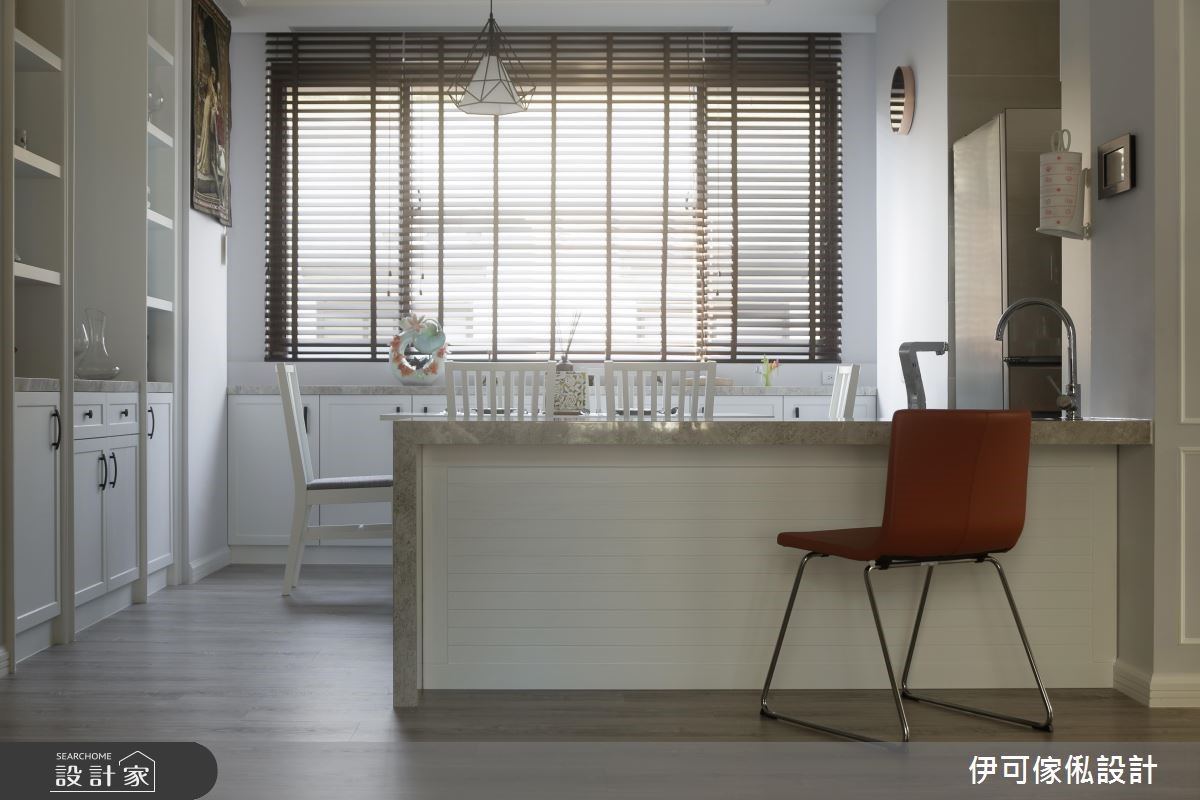 三层楼别墅,作为一家人的新生活场域,设计师不做过于繁复的整修,运用墙纸、水晶灯、线板等,重点式带入女主人喜爱的维多利亚元素,但不过度闪耀雕琢,且依循家族成员习性施作完善收纳机能,在低奢优雅的背景之下,描绘出一家人的天伦场景。【降低中岛台面,联系全家互动】公领域结合现代美式与维多利亚元素,避免繁复而压迫的设计,大面积的客厅落地窗则替室内纳入舒畅绿意;餐厅区呈现开放格局,且特别降低中岛台面,呈现与餐桌相符的高度,无论是料理、备餐、孩童写功课等都适用,联系一家人之间的紧密互动。【机能与风格兼具的私领域空间】私领域则各自依循家族成员意见,给予不同风格混搭,除了让明亮的采光条件分布于每个角落,每间居室更赋予实用的扎实机能,开启机能、风格兼具的生活型态;小孩房刻意采用衣柜型构界定,划出游戏与睡卧区,即便未来两个小孩分房,也能个别坐拥独立空间。