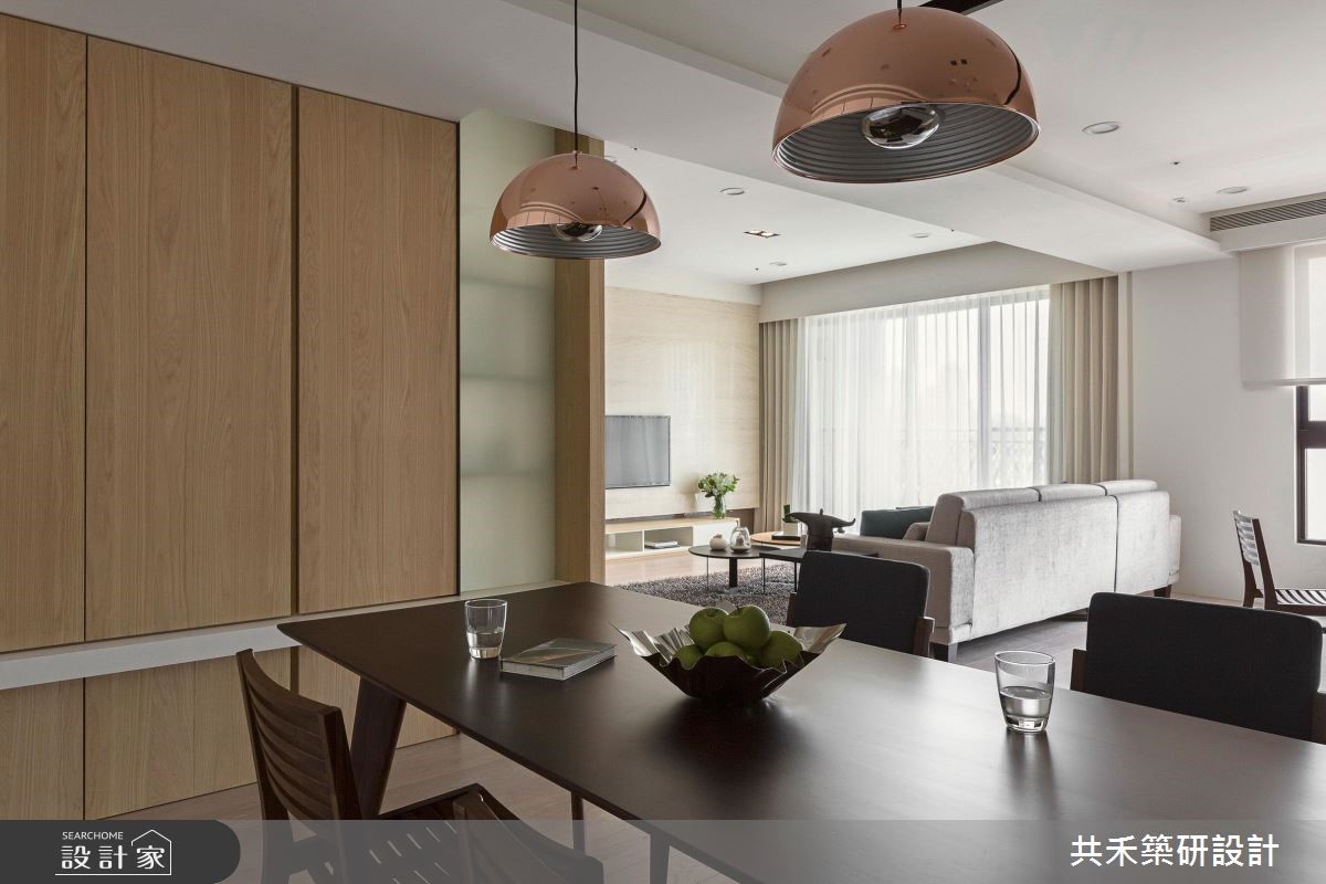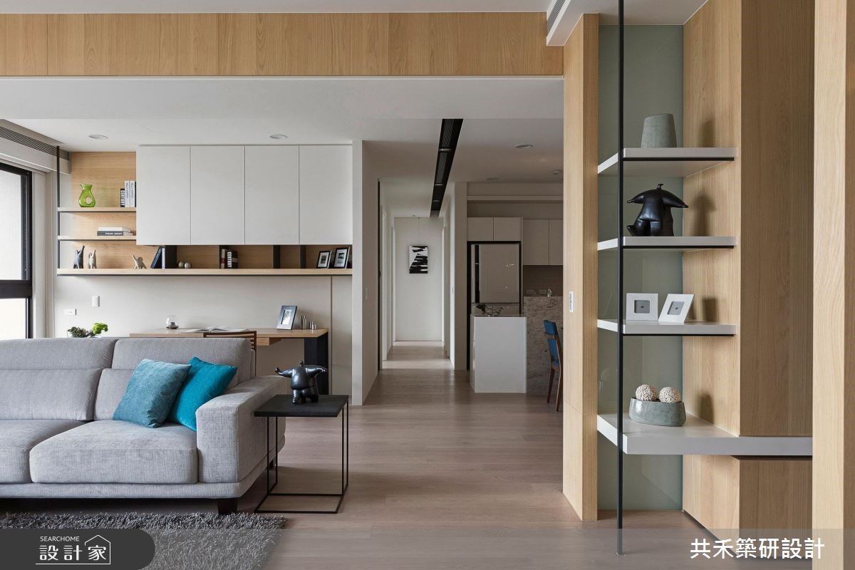 149平方米现代风居家中,设计师利用温润的木皮、沉稳的铁件、轻盈的白色烤漆,打造充满温暖感的氛围,同时进行格局变动,透过开放式书房与餐厨的规划,缔造宽敞明亮的公共视野,替一家人实现梦想生活。【局部玻璃隔断,维系空间情感】客厅区采以浅色木化石铺陈电视墙,搭配铁件线条的勾勒,并衔接木皮矮柜,呈现雅致大器的主墙风范;同时用木皮修饰大梁压迫,也分布出开放的书房与餐厅,串联公领域,建构互动十足的生活情境。书房墙面规划造型书架,营造视觉焦点,落实美型收纳的意义;餐厨区则与玄关共用一道墙,藉着大面积木皮凝聚温润气息,并局部使用玻璃,适度导引采光流动,成为屋主与亲友相聚的好处所。主卧设计整道干净温暖的电视墙,旁侧可通往更衣室,门片选用铁件搭配白膜玻璃,运用异材质的巧搭,让立面在简约之中不乏丰富层次。次卧在床头加入条纹墙纸,塑造墙面的设计感。