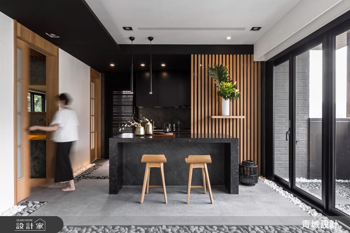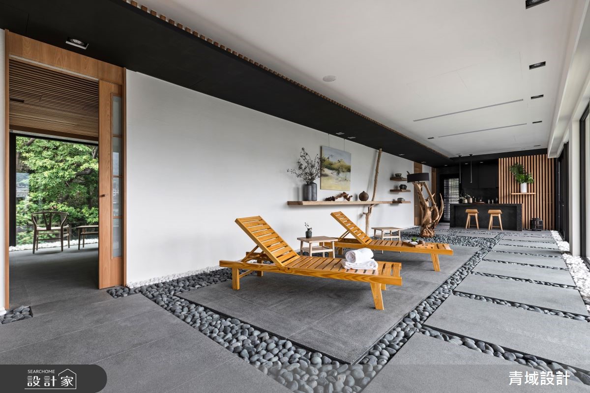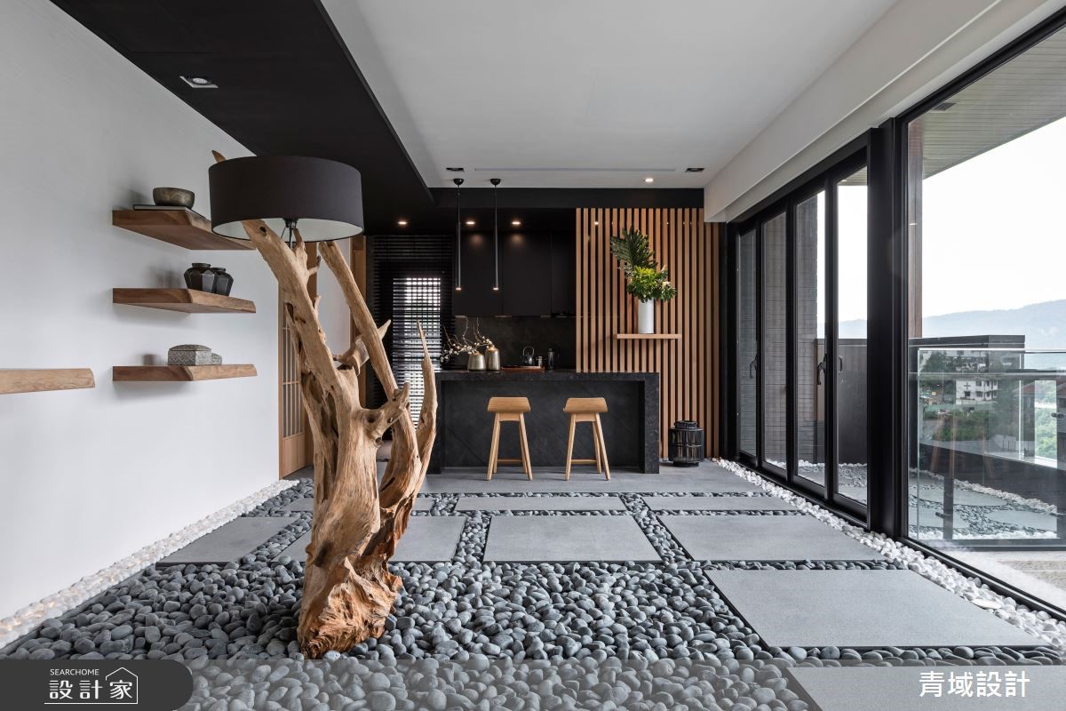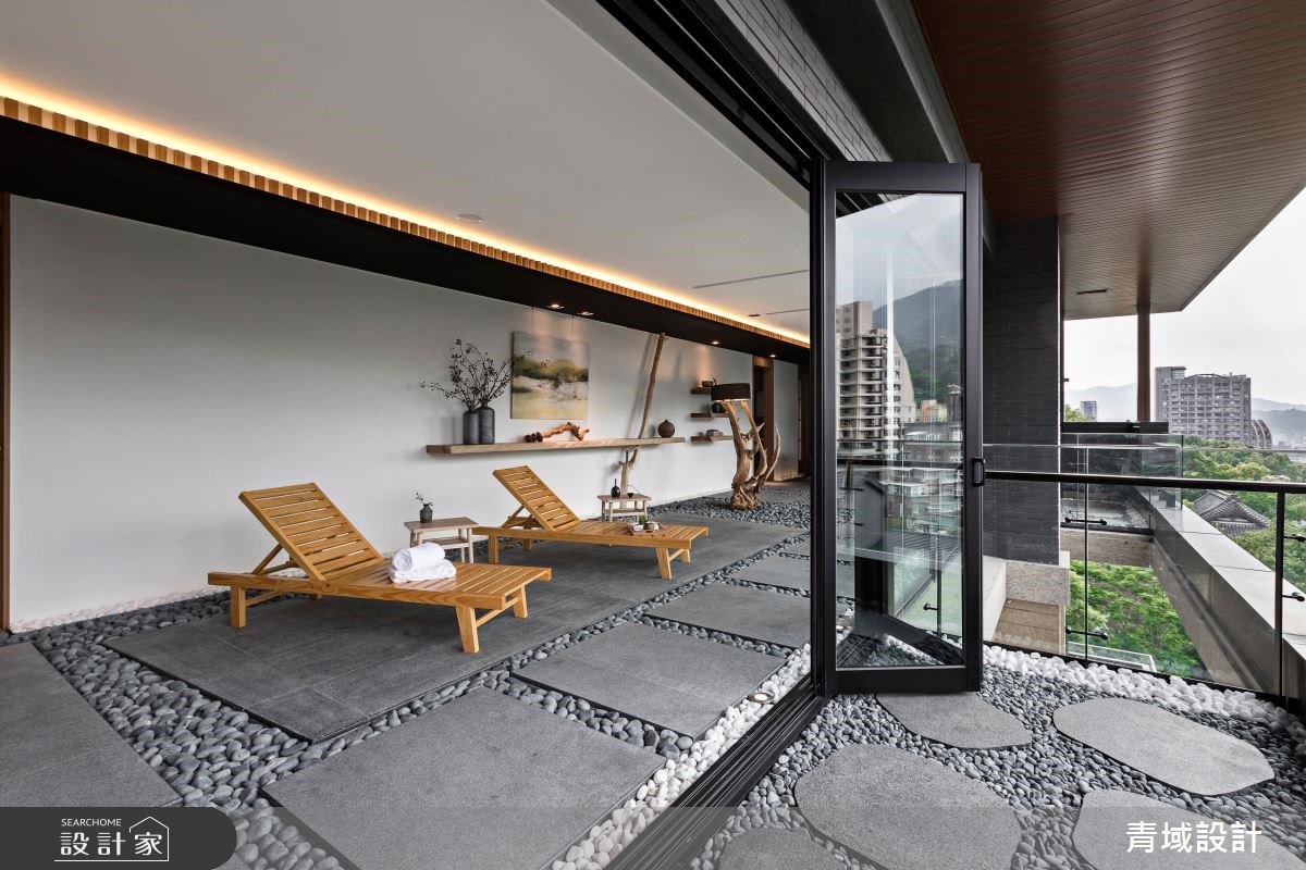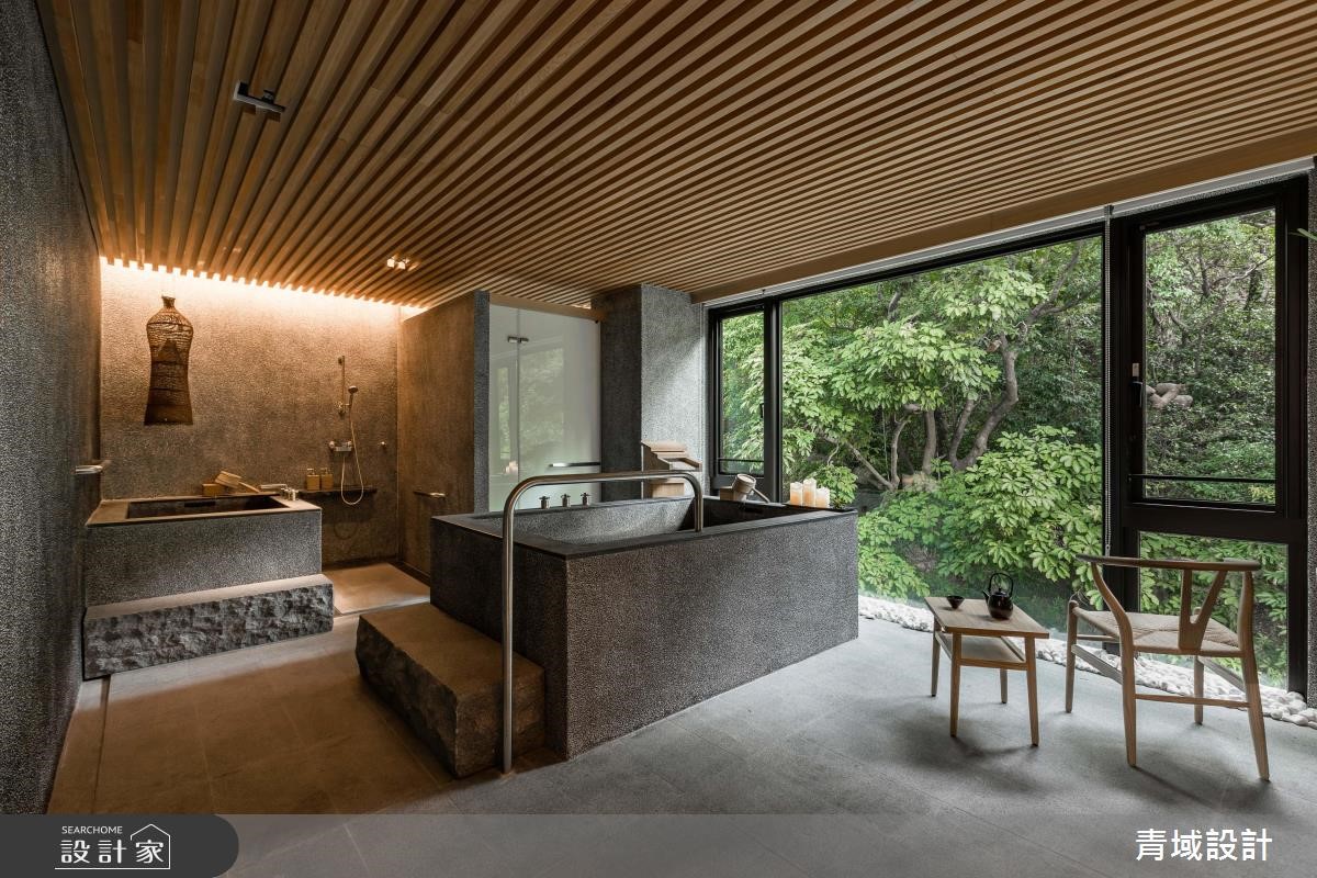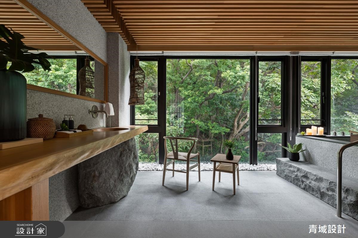132平米的空间,拥有面对绿景瀑布的地理条件,业主期待能将此优势发挥到淋漓尽致,青域设计为汤屋注入浓郁的日式风格,内外合一、禅意十足。【自然材质营造浓厚日式禅风】132平米汤屋走精品路线,仅有两个汤屋、一处面山景的休憩阳台以及开放厨房。在建材的选择上,以贴近自然的石、木材质为主,营造地道的日式禅风。并将180度的满眼绿意保留给汤屋,以大面积开窗引景入室,天花则沿轴线装设细密的格栅,搭配推拉门,提纯日式氛围。【以卵石与枯木融合室内化景色】汤屋内部分为更衣、沐浴与盥洗区域,地坪以卵石框设,并在墙上与浴缸周边铺设抿石子建材,洗手台则以原木搭配原石洗手槽,增添粗犷风味。开放观景台地坪以卵石填满石板空隙,更以枯木造景营造古典山水气息,成为串连厨房的接壤点。