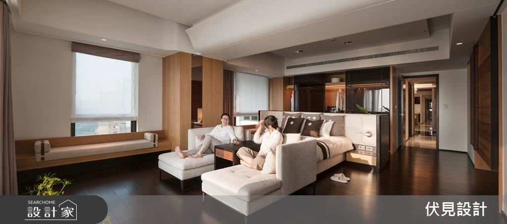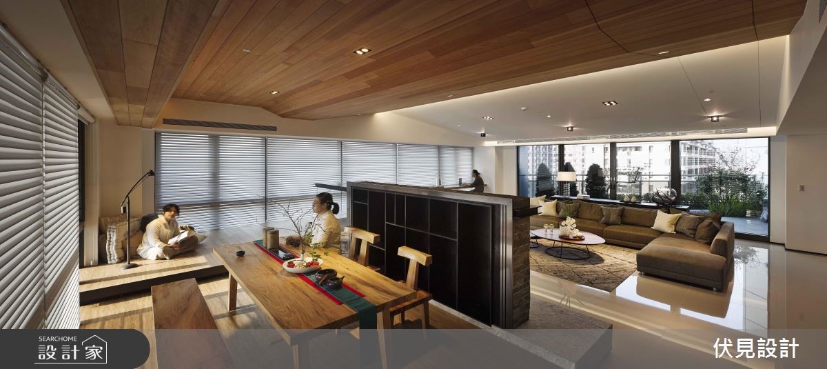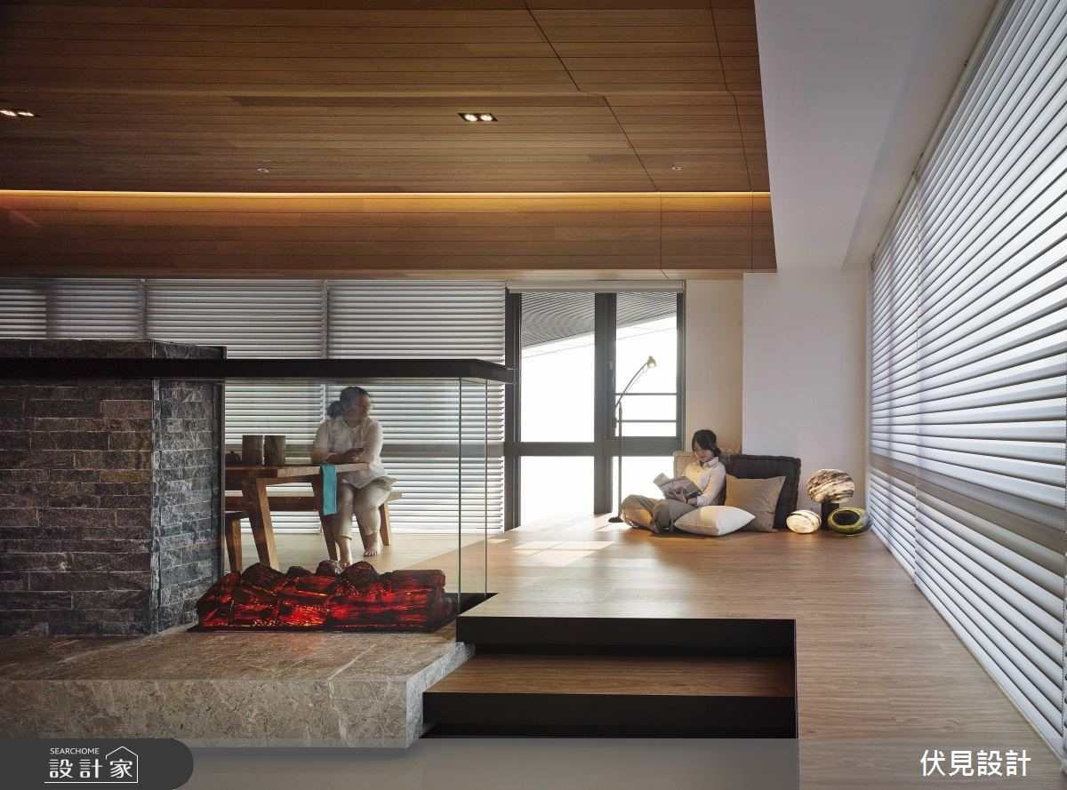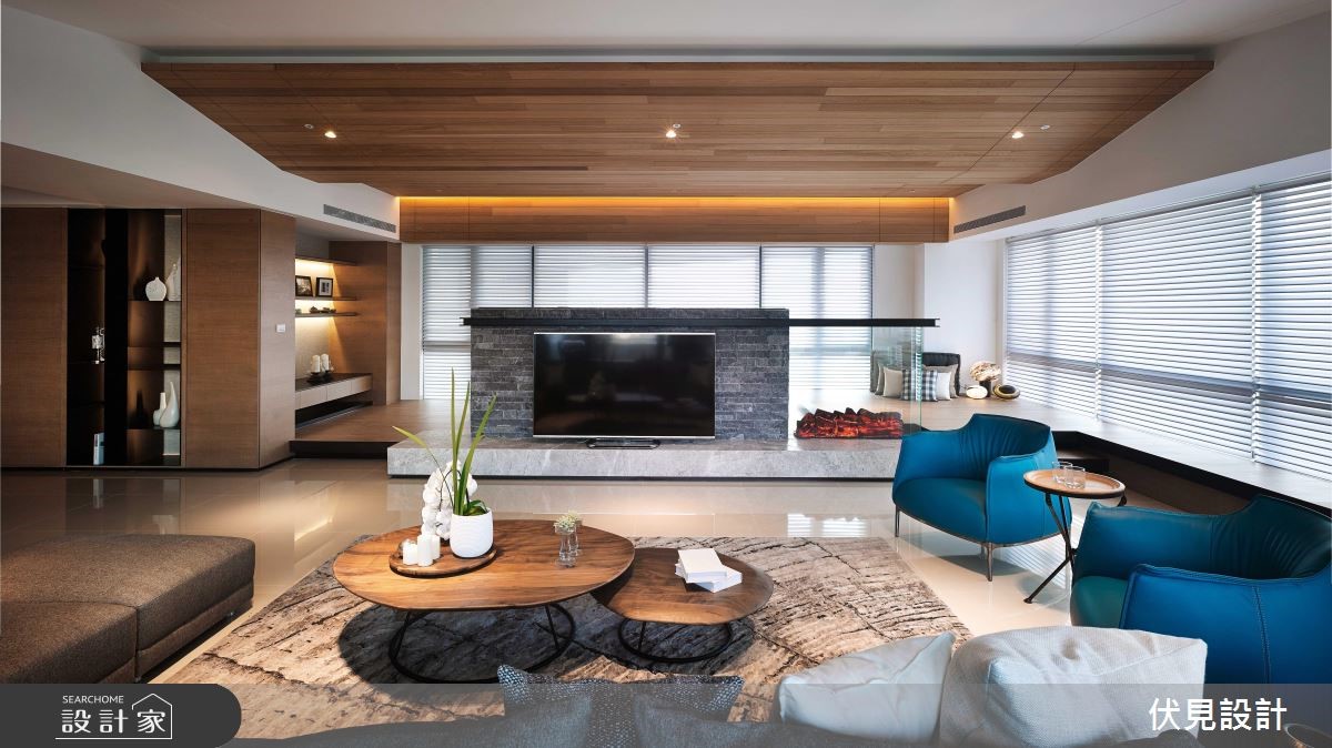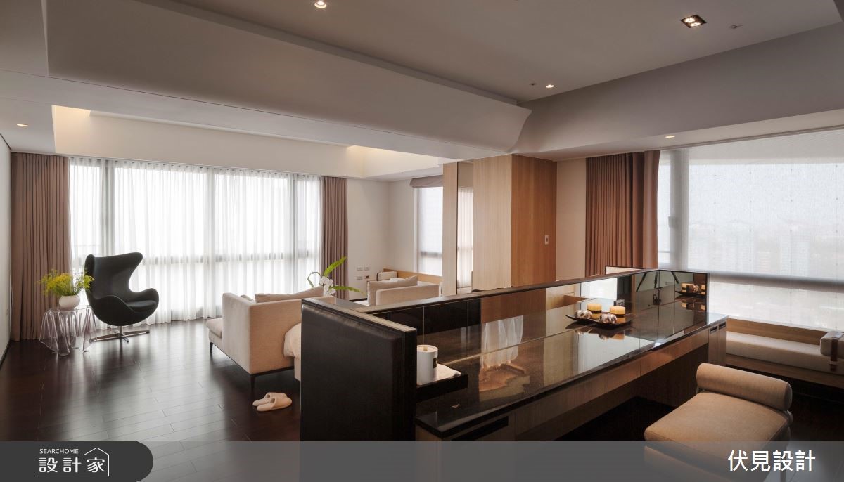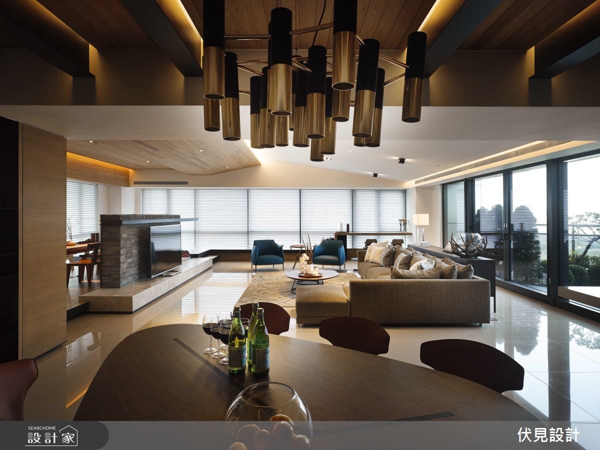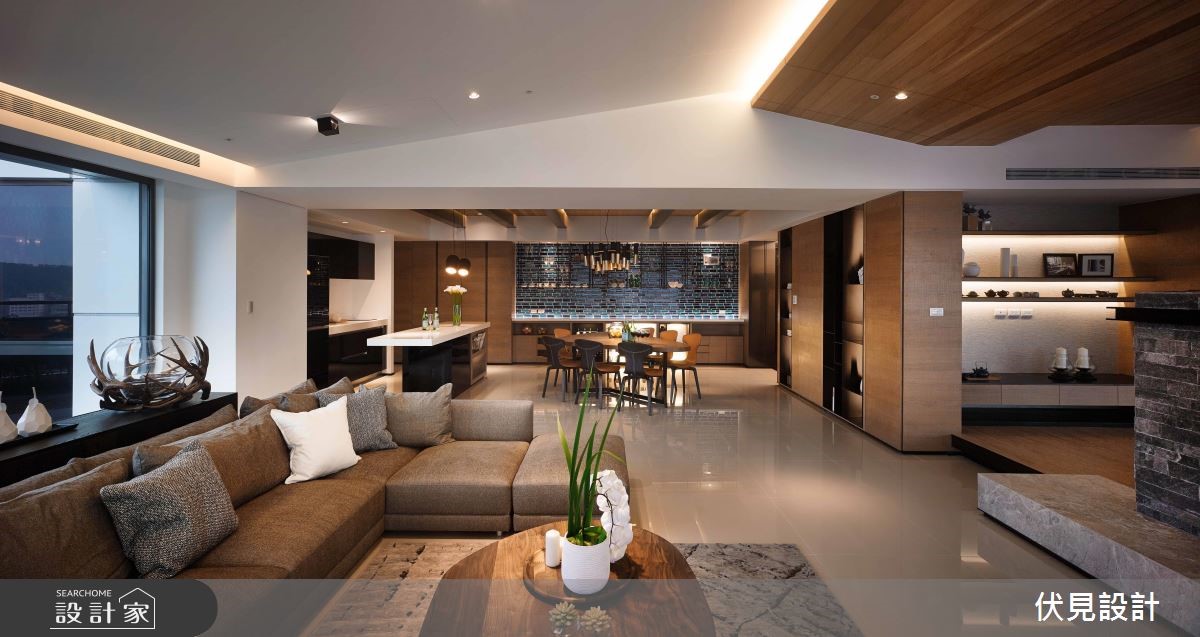 超过400平方米的大宅拥有超优良采光。伏见设计利用房屋优势,以全开放设计串连公共区域,并注入大量休閒元素,打造道地的海岛度假风情。【波浪形天花,视觉更显趣味】公共空间巧妙利用梁柱与造型天花板作为开放空间的区域划分,并将客厅与书房安排采光处,随时能享受山景。客厅天花向上倾斜,与书房波浪状的木制天花衔接,形成富有律动的视觉意象。结合壁炉机能的双面电视矮墙更身兼收纳机能。书房特地架高地面,让阅读、休閒更加多维;辅以木地板的温润特性,让人忍不住驻足停留。餐厨空间上方设置木梁,搭配吊灯与大面积造型砖墙,异国风情立现。除了使用大量的木元素营造自然气息,更以鲜豔、温暖的色彩点缀家饰,营造度假休閒风情。