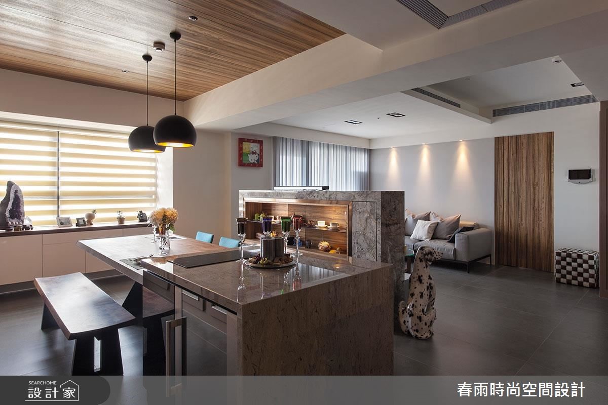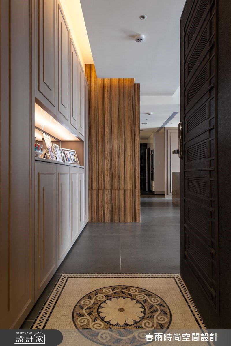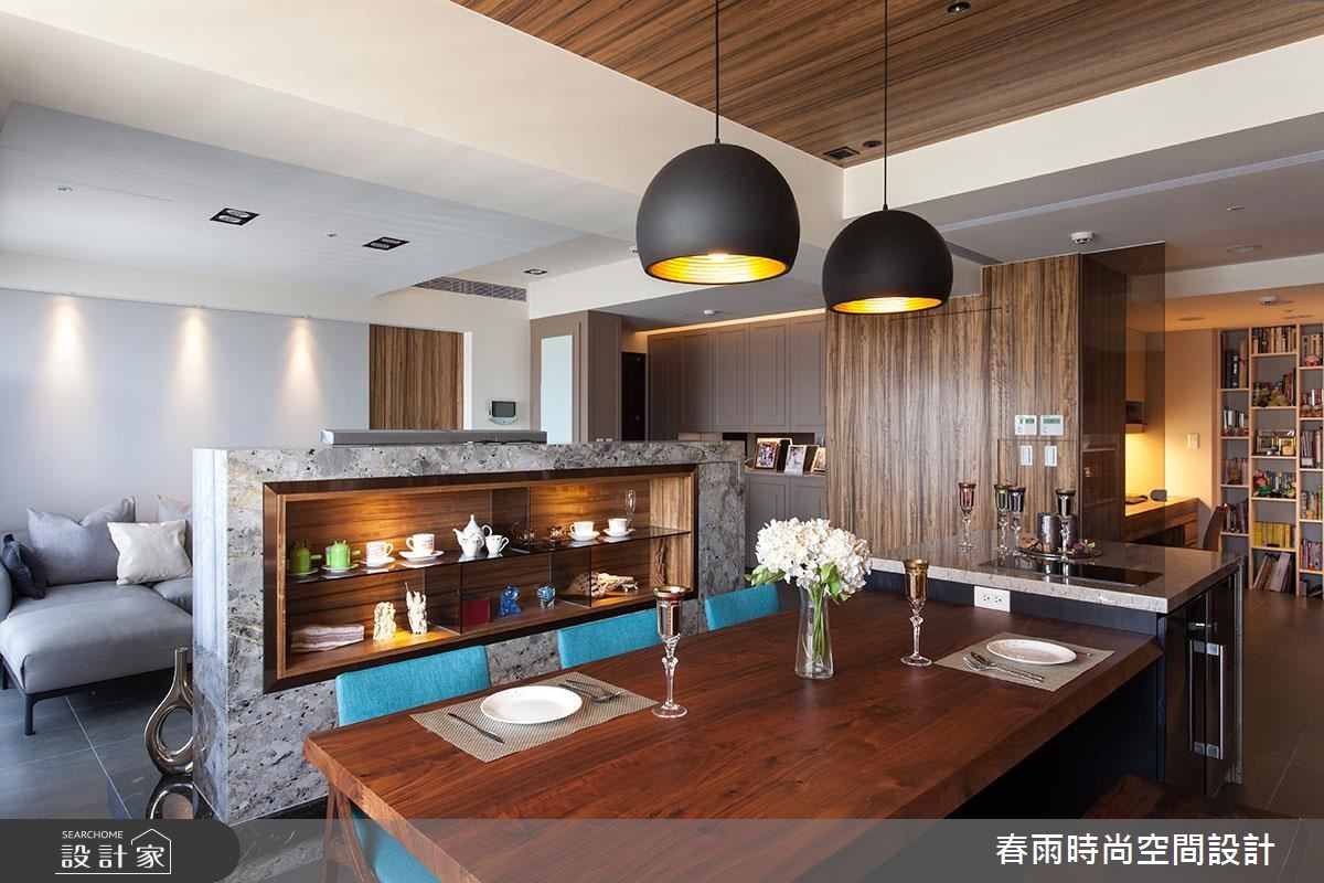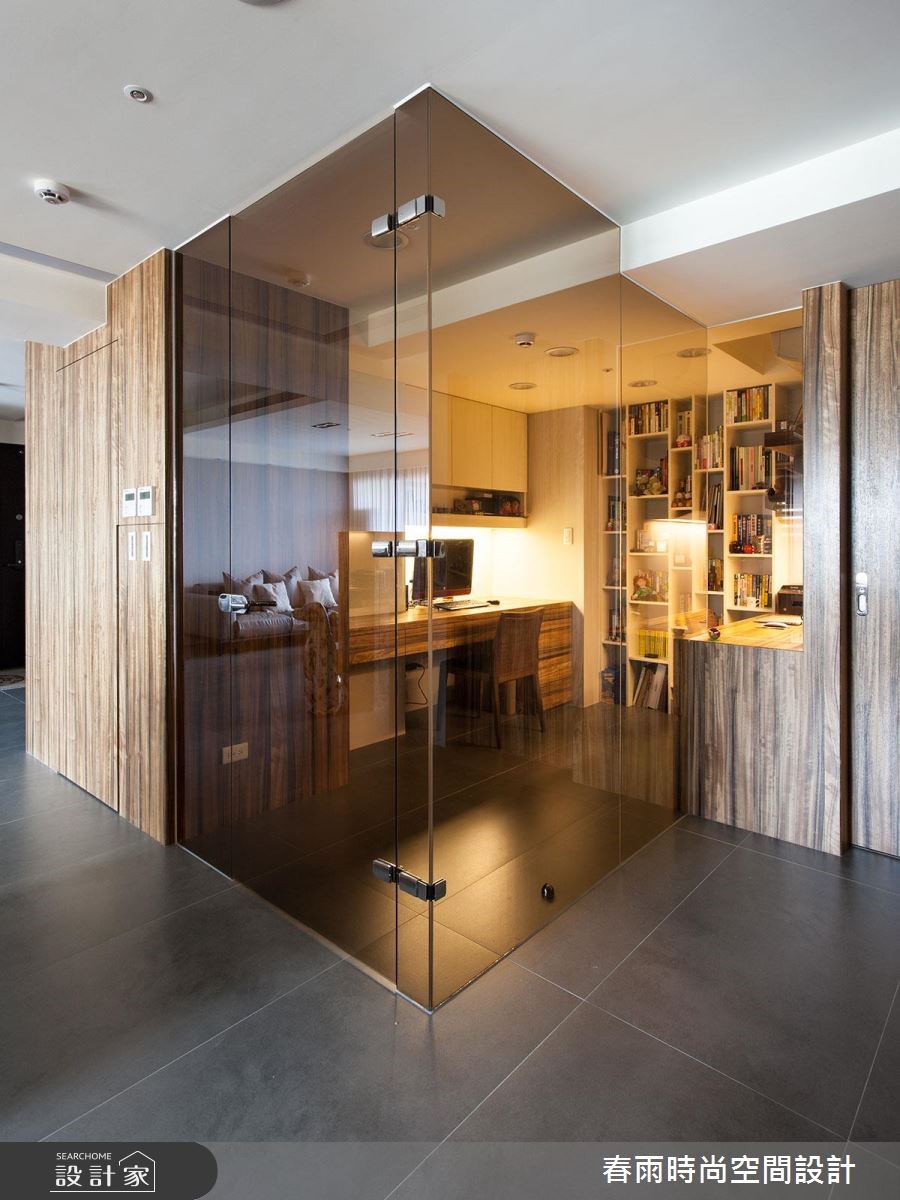 132平方米的现代风居宅,虽曾在预售阶段进行客变调整(客户变更;建设公司在施工阶段依照屋主需求,预先提供变更格局、设备等服务),却不是屋主期待中的模样,因此春雨设计重新调整客厅、餐厅和书房,降低电视墙高度,加上茶玻隔断,打造明亮宽敞的空间。 【藤色漆面,注入浪漫气息】设计师在细节里融入了女主人喜爱的新古典风格,玄关鞋柜、餐厅主墙皆选用了温雅的藤色漆面处理,成为空间中典雅细致的风景,搭配浓郁的木作贴皮、深色地砖等元素,营造出属于现代风的沉稳大器。电视墙后方可做为用餐区的展示收纳,另一端也加上兼具餐柜功能的中岛设计,使轻食料理的准备更加便利。书房隔断则改以茶玻设计,让整个空间成为透亮而有隐私的玻璃盒子,具有放大空间的效果。内部搭配充沛的收纳设计,无论书籍或是文具用品,都能够整齐收储。