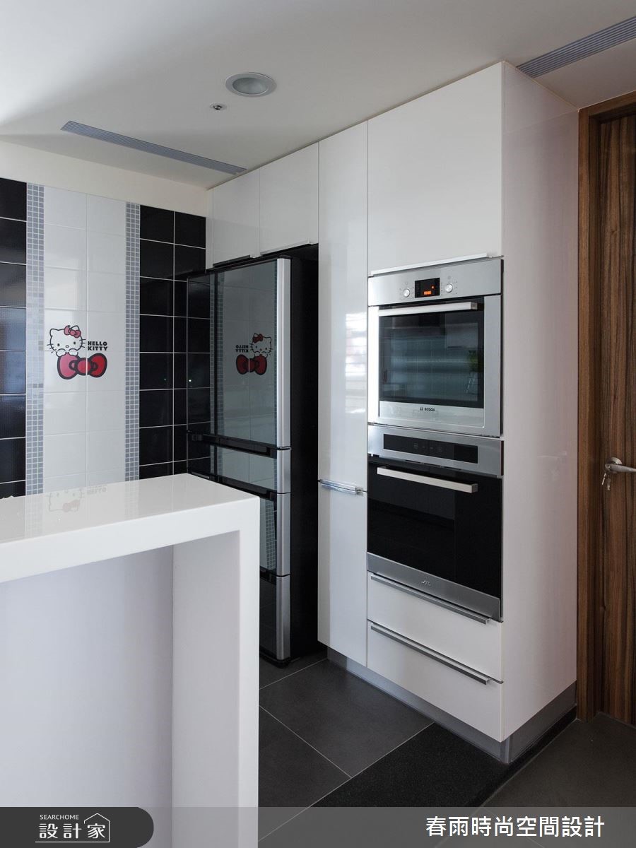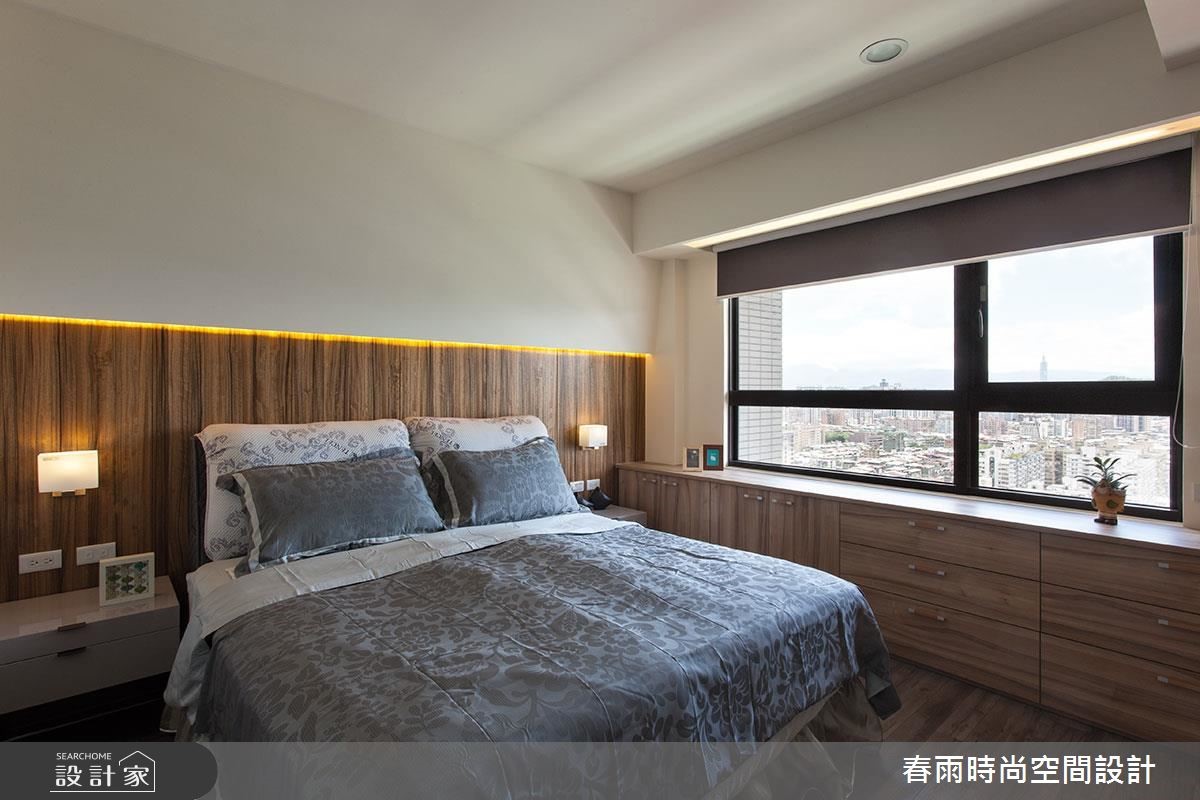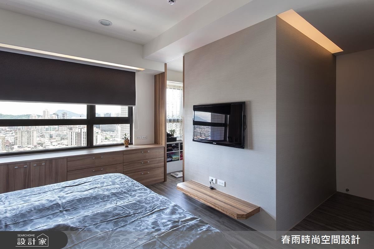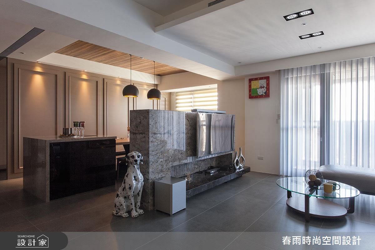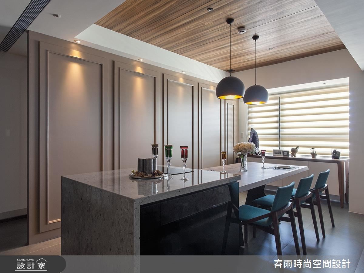132平方米的现代风居宅,虽曾在预售阶段进行客变调整(客户变更;建设公司在施工阶段依照屋主需求,预先提供变更格局、设备等服务),却不是屋主期待中的模样,因此春雨设计重新调整客厅、餐厅和书房,降低电视墙高度,加上茶玻隔断,打造明亮宽敞的空间。 【藤色漆面,注入浪漫气息】设计师在细节里融入了女主人喜爱的新古典风格,玄关鞋柜、餐厅主墙皆选用了温雅的藤色漆面处理,成为空间中典雅细致的风景,搭配浓郁的木作贴皮、深色地砖等元素,营造出属于现代风的沉稳大器。电视墙后方可做为用餐区的展示收纳,另一端也加上兼具餐柜功能的中岛设计,使轻食料理的准备更加便利。书房隔断则改以茶玻设计,让整个空间成为透亮而有隐私的玻璃盒子,具有放大空间的效果。内部搭配充沛的收纳设计,无论书籍或是文具用品,都能够整齐收储。