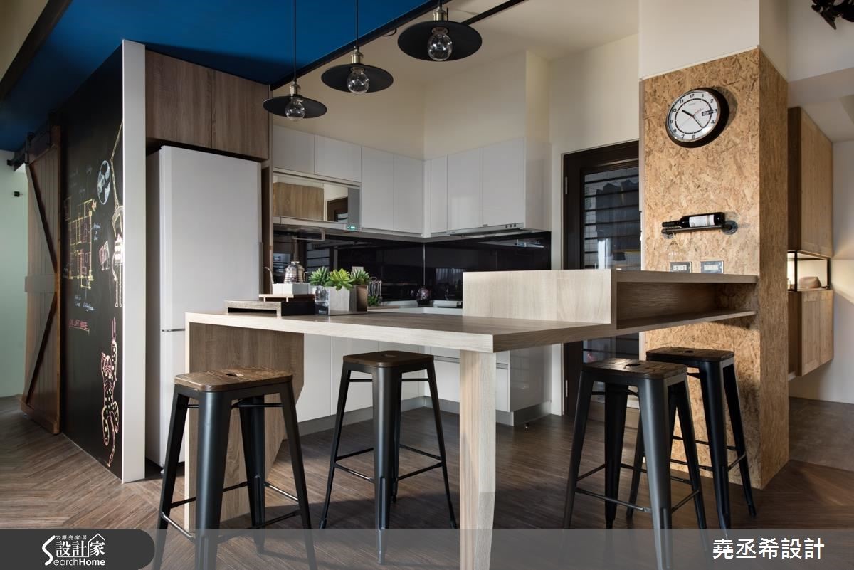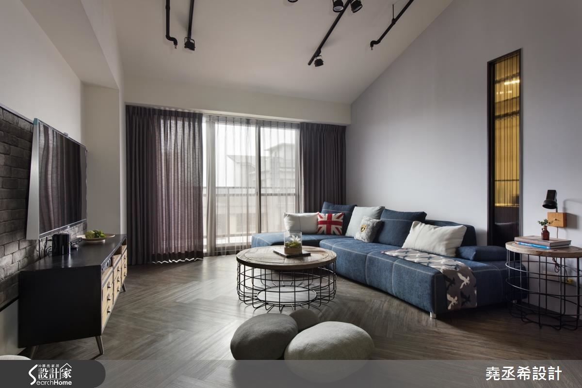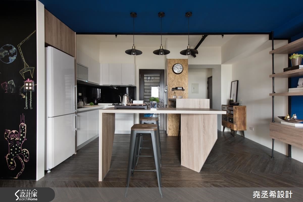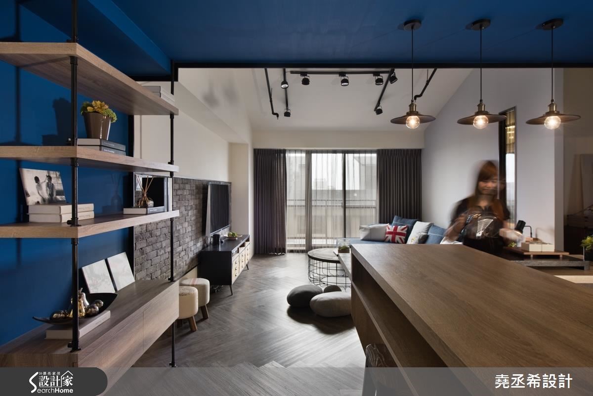 这是属于新婚夫妻的99平方米住宅,具有楼高4米7的开阔高度,以及颇有特色的斜屋顶。空间以前卫个性的工业风定调,却透过色调、织布材质保留清爽舒适的生活感。并在在书房上方额外增设阁楼跃层,当作未来小朋友的游戏区和客房使用。【经典湛蓝,造高冷个性】为了描摹出屋主喜爱的Loft样貌,设计师在室内注入砖墙、铁件、实木板,以及工业风单品等经典元素。地坪以人字拼法刻划经典美式魅力,而天花到墙面运用大面积的湛蓝,展现粗犷有型的工业调性,搭配沙发的灰、蓝绿色等色调,也让色彩变化更加丰富。厨房采用开放式设计,使空间更加宽阔自在;并舍弃传统的餐桌椅,改设L型多功能吧台,一次满足料理、用餐、电器厨具储物的需求。搭配铁制高脚椅和吊灯,营造出宛如工业风咖啡馆的情调。主卧则延续简约清爽的调性,增设更衣间完备收纳机能。