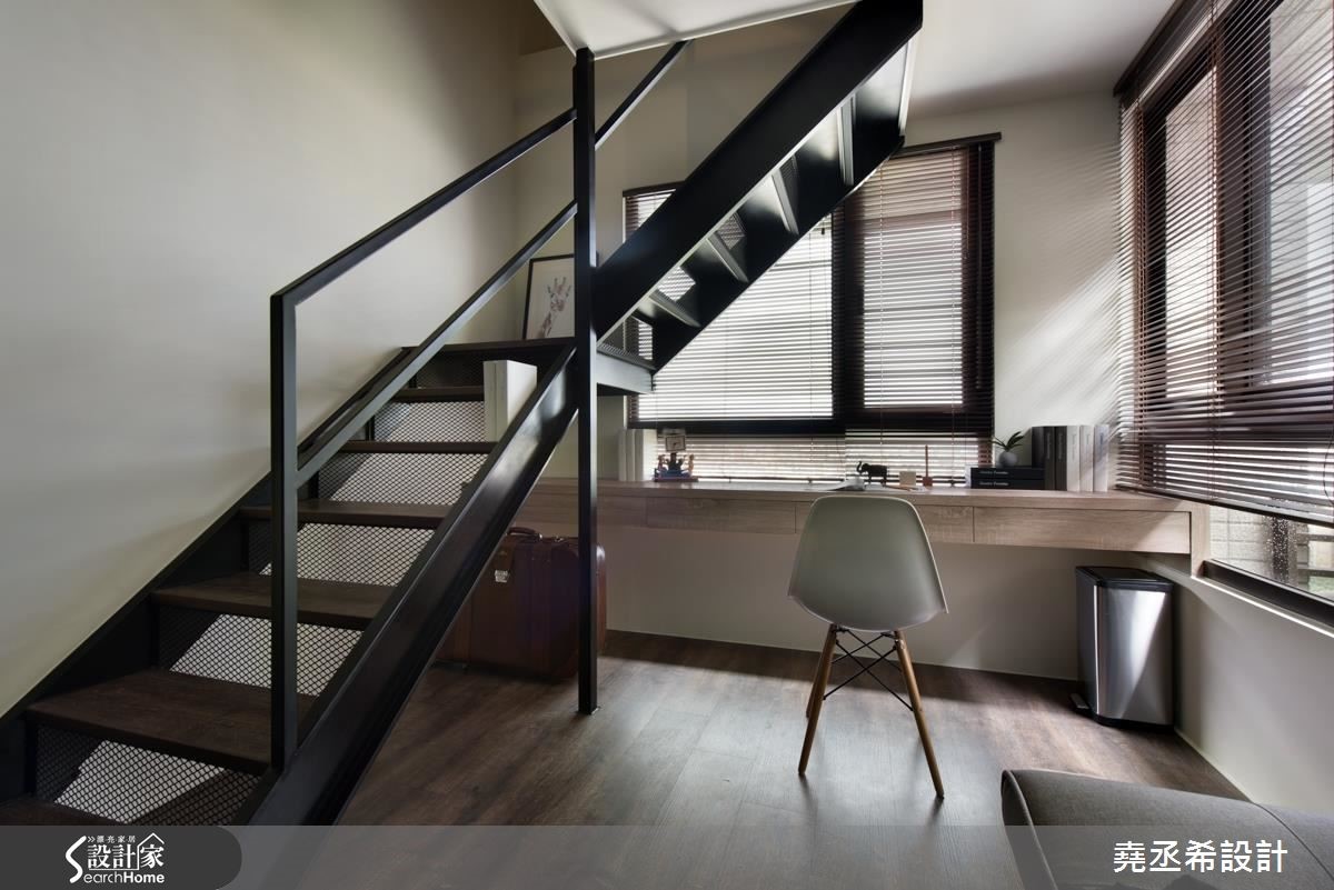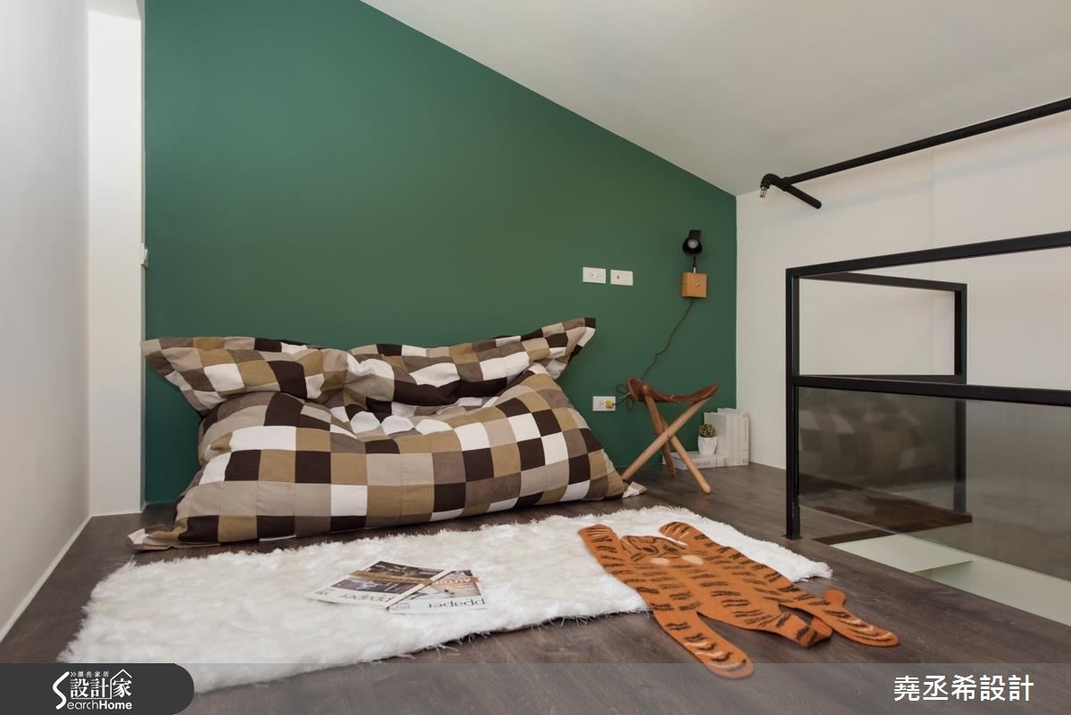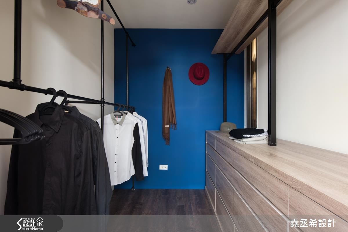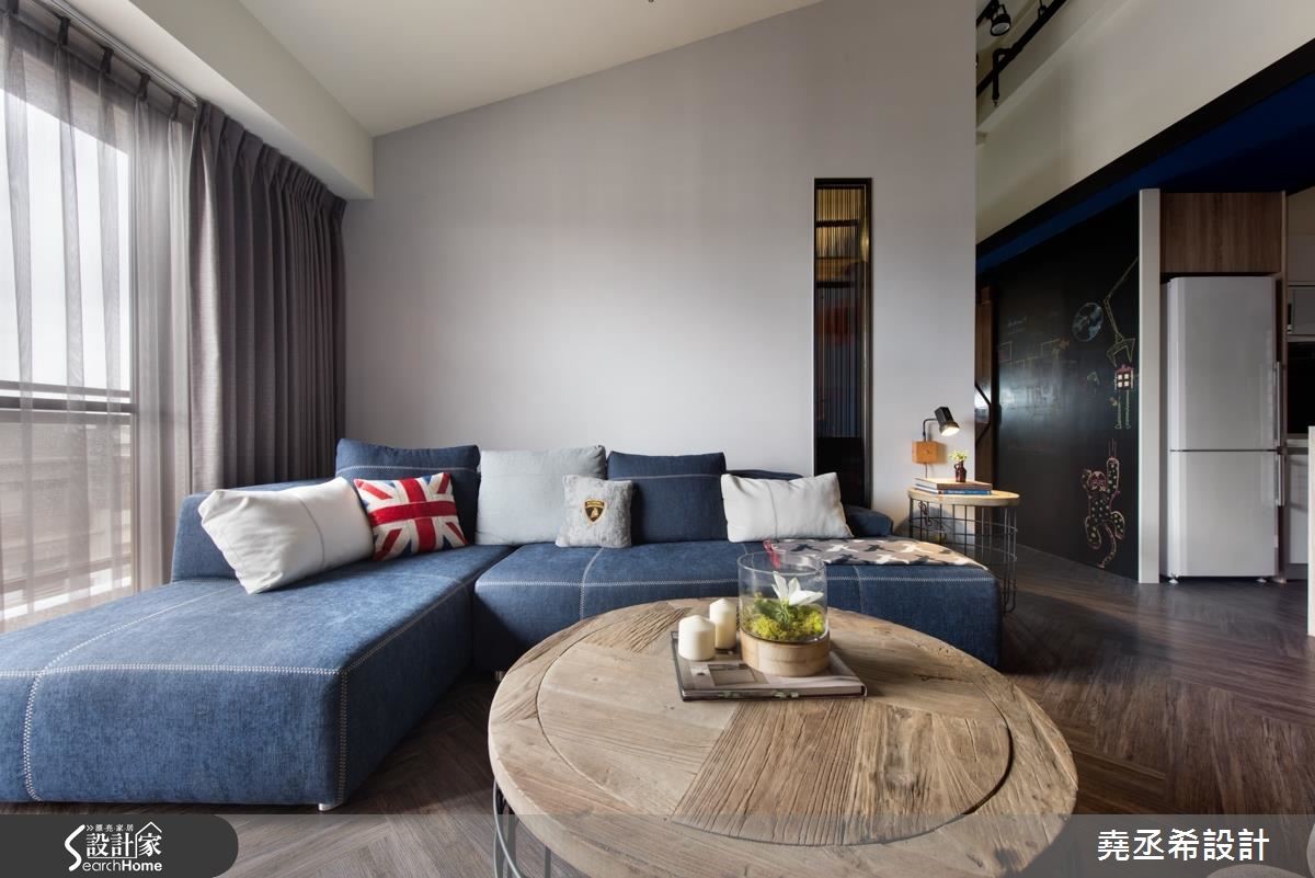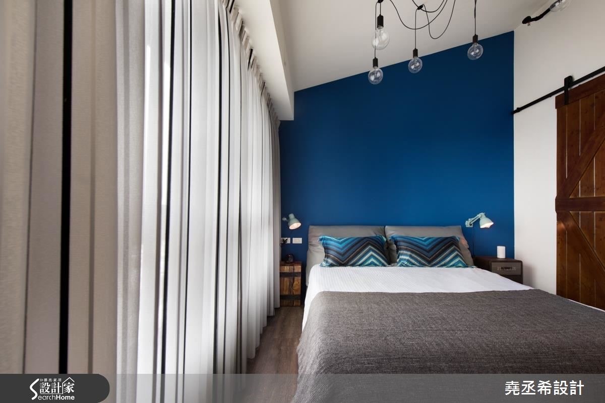 这是属于新婚夫妻的99平方米住宅,具有楼高4米7的开阔高度,以及颇有特色的斜屋顶。空间以前卫个性的工业风定调,却透过色调、织布材质保留清爽舒适的生活感。并在在书房上方额外增设阁楼跃层,当作未来小朋友的游戏区和客房使用。【经典湛蓝,造高冷个性】为了描摹出屋主喜爱的Loft样貌,设计师在室内注入砖墙、铁件、实木板,以及工业风单品等经典元素。地坪以人字拼法刻划经典美式魅力,而天花到墙面运用大面积的湛蓝,展现粗犷有型的工业调性,搭配沙发的灰、蓝绿色等色调,也让色彩变化更加丰富。厨房采用开放式设计,使空间更加宽阔自在;并舍弃传统的餐桌椅,改设L型多功能吧台,一次满足料理、用餐、电器厨具储物的需求。搭配铁制高脚椅和吊灯,营造出宛如工业风咖啡馆的情调。主卧则延续简约清爽的调性,增设更衣间完备收纳机能。