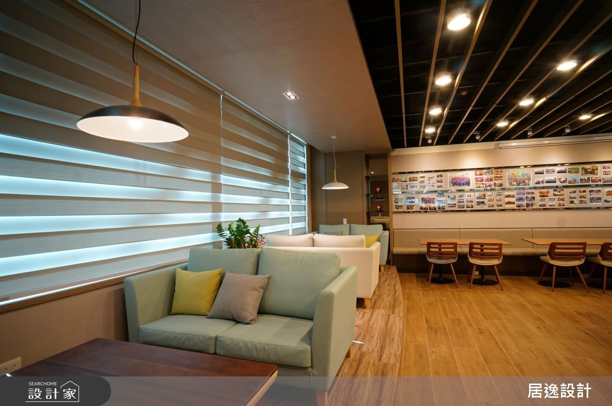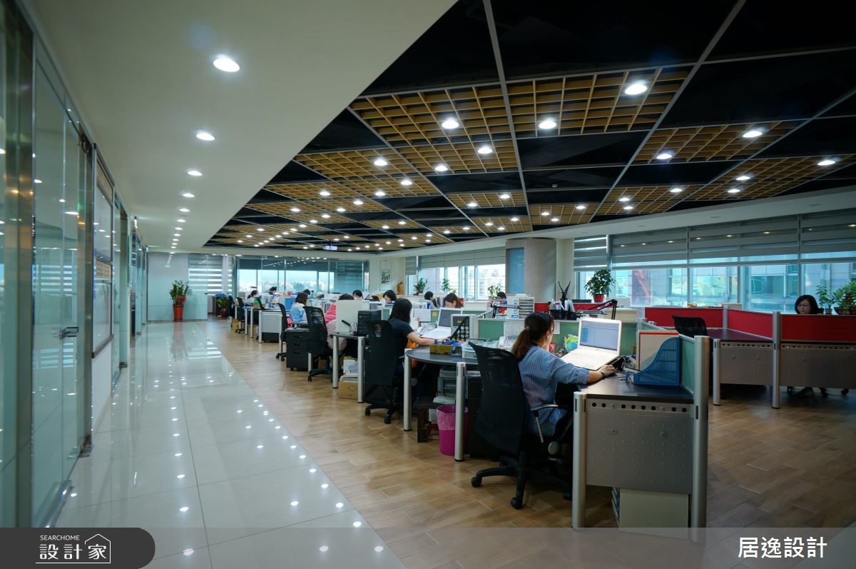 本案为现代风商业空间,设计师透过圆弧与直线的几何线条打造空间,运用线性的架构、灯光的妆点,搭配沉稳的深蓝色系,缔造理性逻辑却富有创意的空间表情。【温润木作暖化工作氛围】入口接待区以深蓝色作为背景,佐以俐落的柜台架构,展现沉稳气质并同步显现专业感,天花则以木作做出弧线造型,利用曲线导引动线,于柜台后方打造一个机能空间,顺势衔接后方的茶水吧台。来到会客区,可见到天花呈现简洁明快的线条,加上灯光的规划,整体饶富现代感与安定力量,两侧分别加入展示照片与书籍、奖项等,揭示着企业带给客户的服务内容,同时配置沙发与木桌椅等,可因应休憩、会晤、洽谈等多维主题。开放的员工办公空间,则运用地面材质差异划分行进动线,并设计独特的格状天花板造型,带出科技感与趣味创意,不仅让办公室不再冰冷沉闷,也达成延伸空间感的效果。
