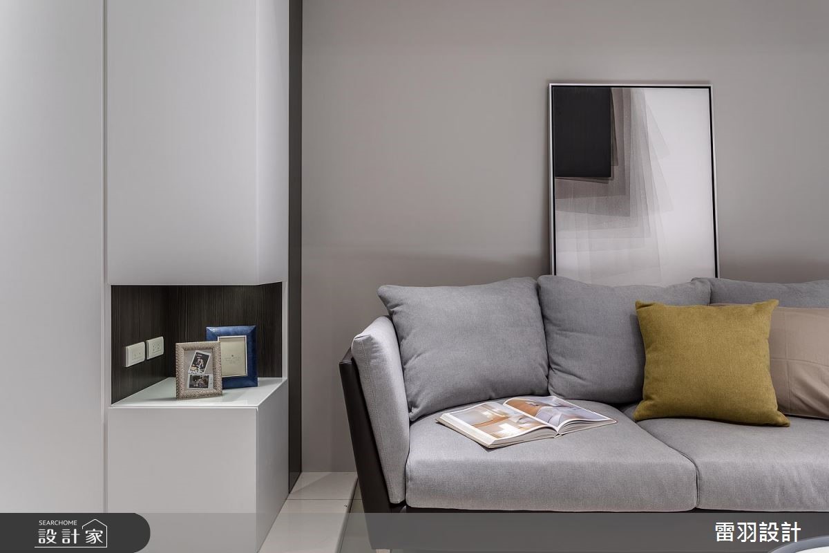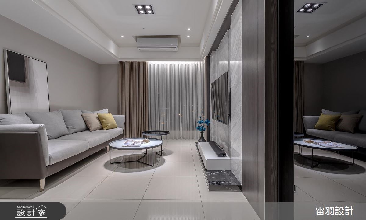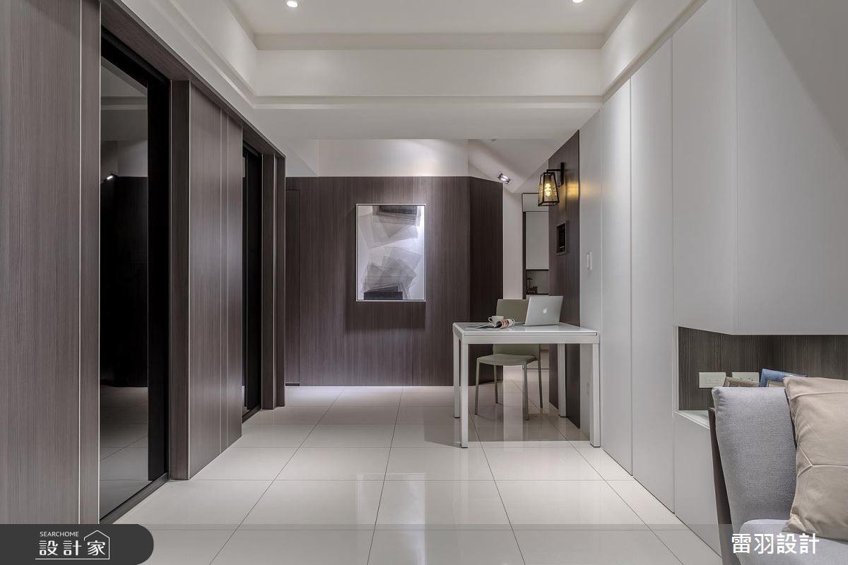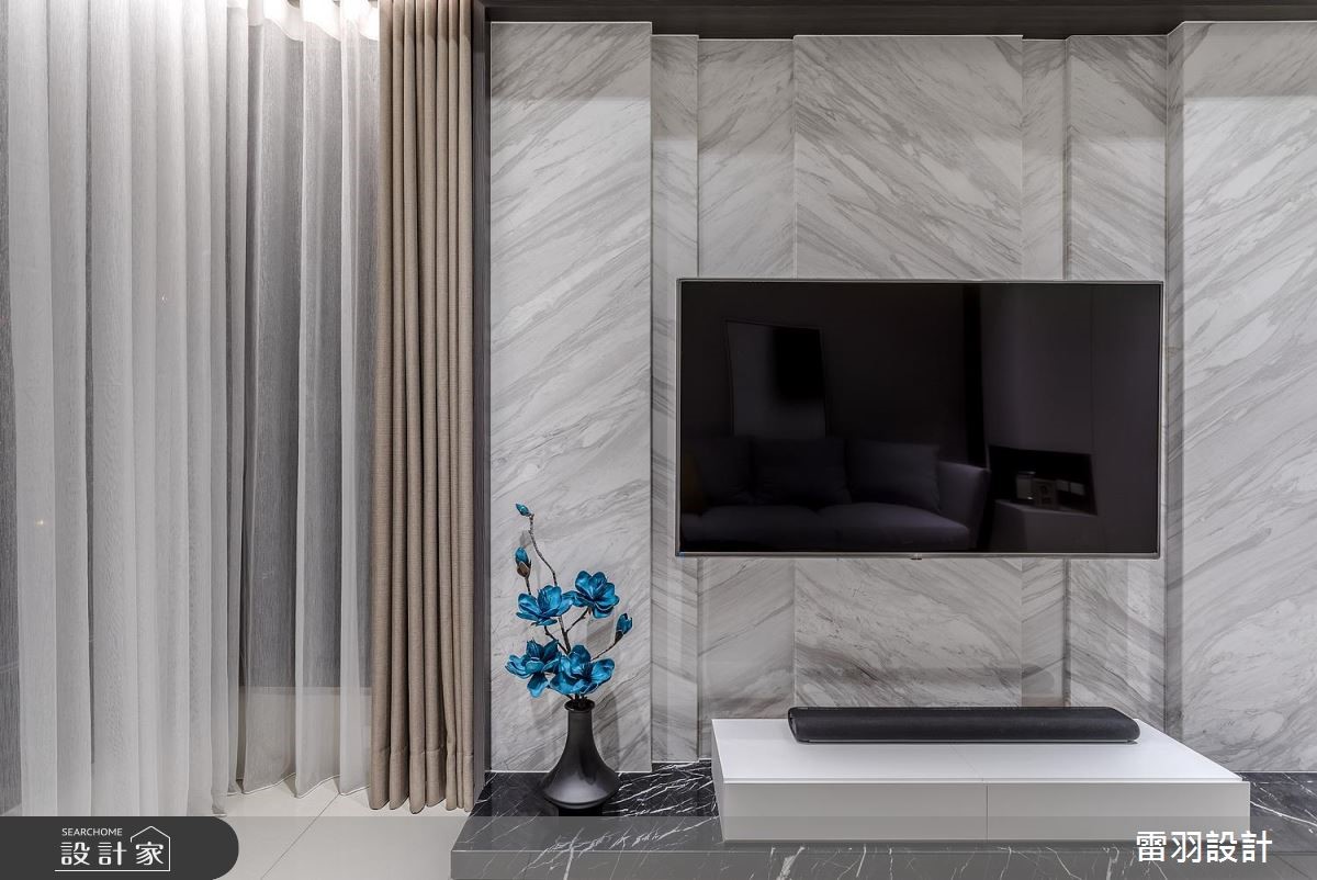 83平方米的现代风住宅,屋主为年轻的新婚夫妻,喜欢黑、白对比的高冷风格,并希望增加房间的收纳量。于是设计师藉由格局调整和隐性收纳设计,满足了两人期待的新家样貌。 【电视墙凹凸层次,呼应折线天花】走进室内,客厅以简洁为主调,电视墙采用银狐大理石铺陈,并搭配厚薄不一的设计,产生深浅的视觉律动;下方则搭配黑白根大理石,增添时尚大器的质感。天花板处利用斜面折角注入视觉上的趣味性,更消弭了垂直交错梁柱的突兀感。因原本主卧格局不大,为了增加主卧的收纳量,设计师缩小书房的空间,让卧室可以一次增加衣柜、化妆台面,以及手表、包包等配件的收纳展示区。同时为了遮掩床头上方的梁,运用木板修饰并刷白,搭配大地色系的墙面,形成宛如方框的趣味效果。