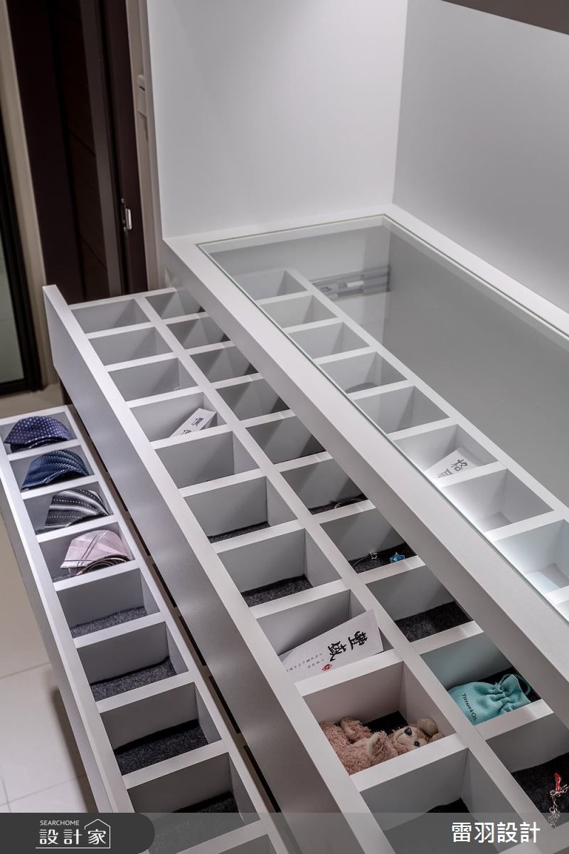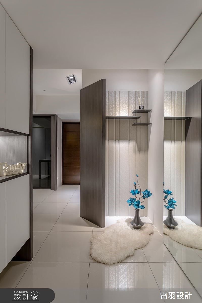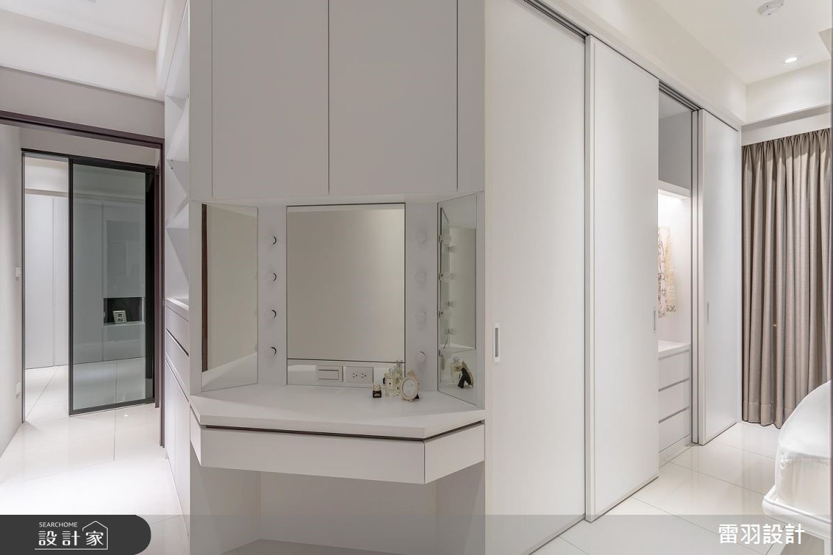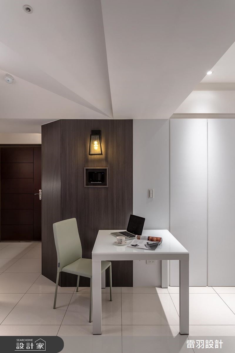83平方米的现代风住宅,屋主为年轻的新婚夫妻,喜欢黑、白对比的高冷风格,并希望增加房间的收纳量。于是设计师藉由格局调整和隐性收纳设计,满足了两人期待的新家样貌。 【电视墙凹凸层次,呼应折线天花】走进室内,客厅以简洁为主调,电视墙采用银狐大理石铺陈,并搭配厚薄不一的设计,产生深浅的视觉律动;下方则搭配黑白根大理石,增添时尚大器的质感。天花板处利用斜面折角注入视觉上的趣味性,更消弭了垂直交错梁柱的突兀感。因原本主卧格局不大,为了增加主卧的收纳量,设计师缩小书房的空间,让卧室可以一次增加衣柜、化妆台面,以及手表、包包等配件的收纳展示区。同时为了遮掩床头上方的梁,运用木板修饰并刷白,搭配大地色系的墙面,形成宛如方框的趣味效果。