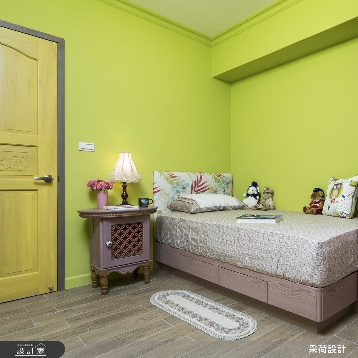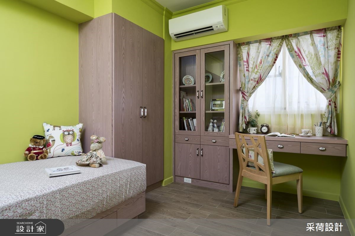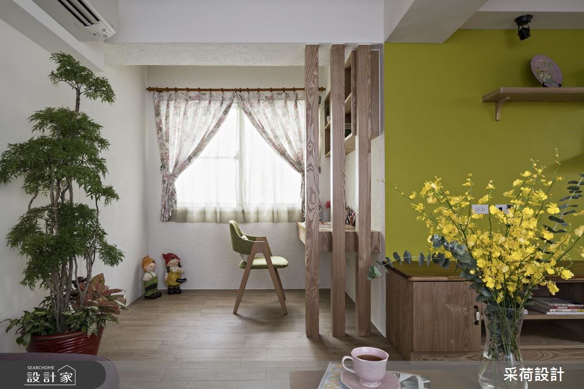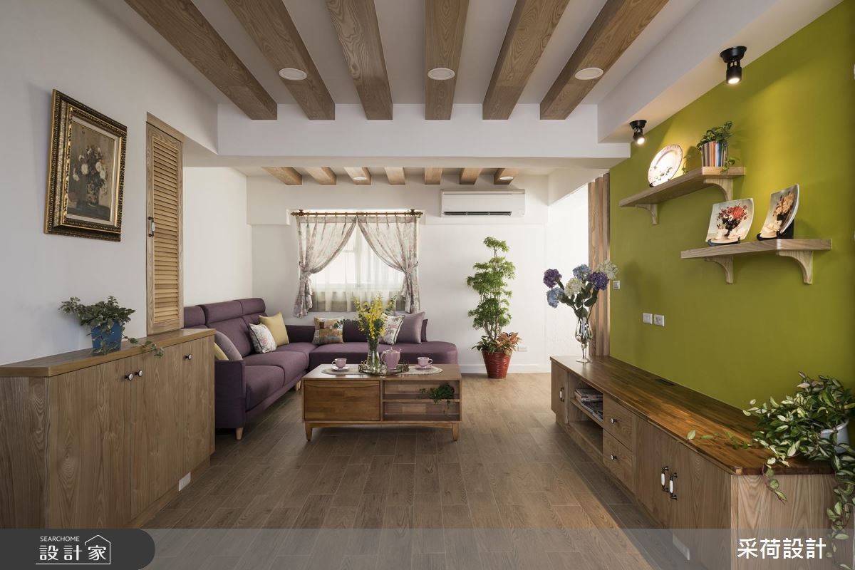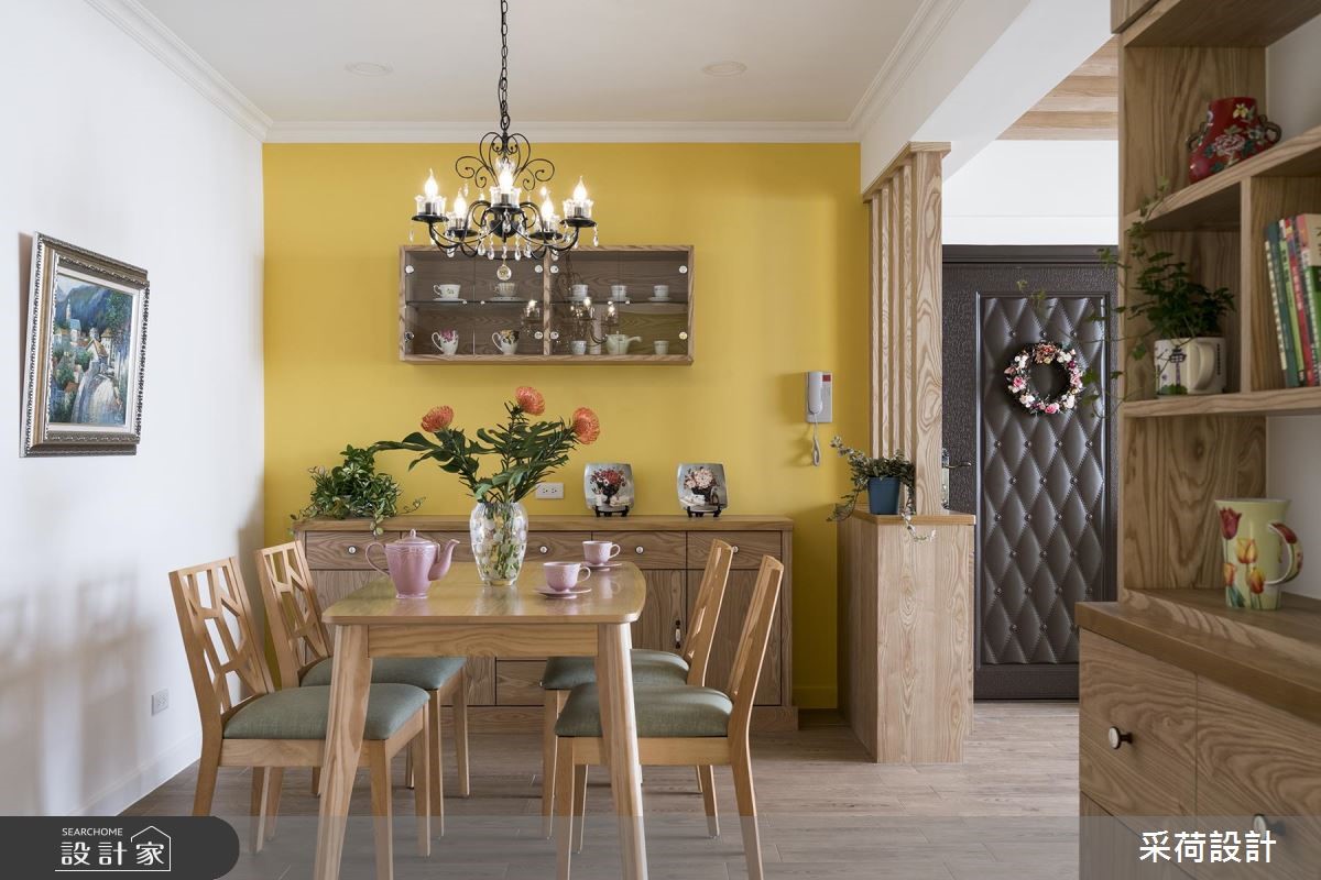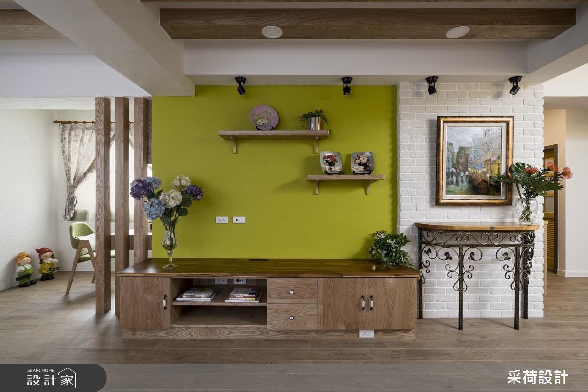屋龄40多年的99平方米老屋,虽然位于热闹、便利的市中心,但屋况老旧,原有动线也不适合年轻屋主夫妻和孩子的生活需求。采荷设计以专业设计思维,从繁琐的基础工程开始,为老屋奠定基礎,并以乡村风定调,让老房子重獲新生。【鮮亮黃綠,帶動明亮視覺】改造后的老屋,以鲜亮的黄、绿色彩,点亮了活泼、亮丽的视觉焦点,搭配文化石砖墙,运用材质的差异性,营造出独特的空间視覺。天花板藉由木梁设计,减少原有梁柱的突兀感,也更具乡村风格的质朴魅力。全室地板则铺上进口木纹砖,以大比例的木质色调,为空间挹注温馨感受。餐厅处以精致的欧式吊灯,凝聚温馨浪漫的用餐气氛,加上柠檬黄的墙面和木餐柜,营造出明亮、有活力的餐厅空间。卧室分别以浪漫的薰衣草紫、活泼的草绿为主题色,为不同居住者打造别具特色的私领域气质。而采干湿分离的卫浴空间,特别换上欧式门片,设计师也利用不同色彩的方格砖与花砖混搭装饰,让卫浴空间更具有艺术的丰富层次。