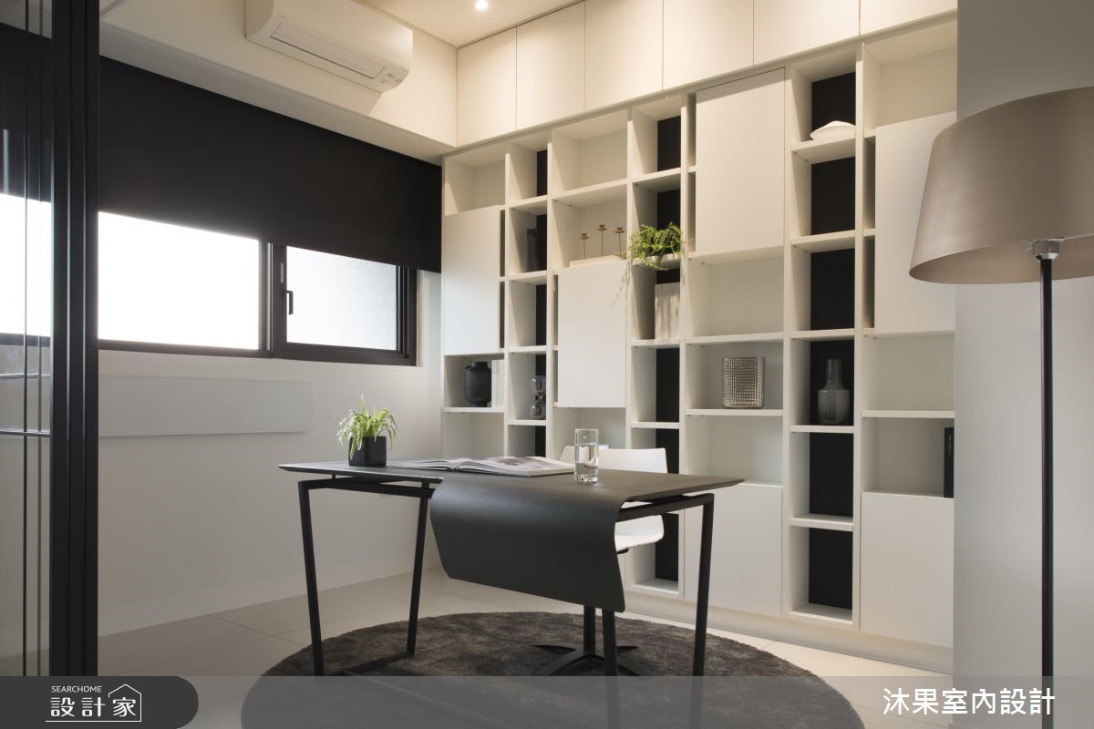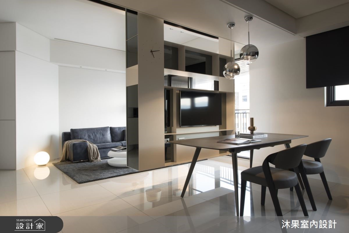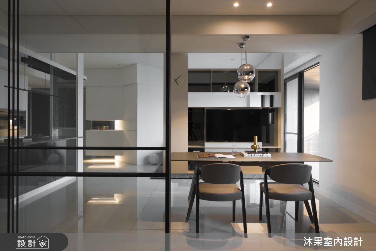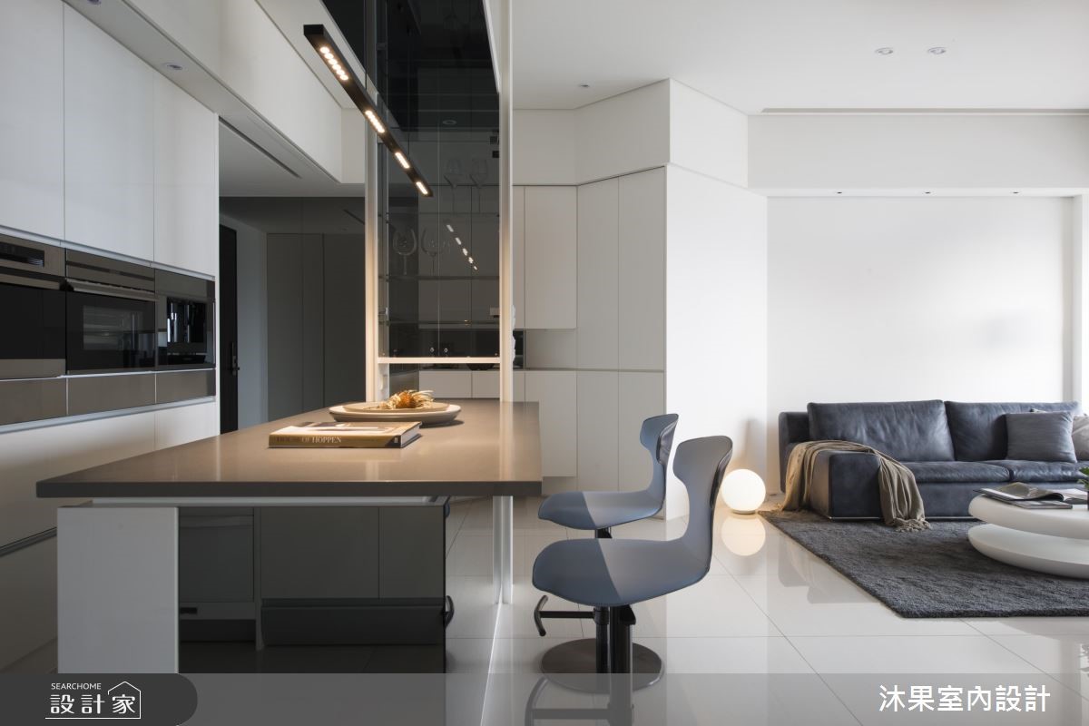 夫妻两人与四只爱猫即将在新居展开生活。由于喜爱简约俐落的现代风格,男屋主带着自己规划的平面图找上沐果设计,几经沟通后经由设计师的专业建议,找到属于家的崭新样貌。【电视柜转向,获得开阔视野】设计师改变了餐厨配置与电视墙的方向,更利用客变拆除隔断(客户变更;建设公司在施工阶段依照屋主需求,预先提供变更格局、设备等服务),利用玻璃隔断开放视野。调转电视墙,搭配悬吊式设计,便能将沙发安排在采光充足的区域,也能向外眺望,视野更开阔。虽是开放餐厨空间,设计师依据机能性,将餐厅与吧台区拆分,将电器柜与吧台、酒杯柜结合,让用餐、小酌皆能有充裕空间。设计师更看见男、女主人有各自的喜好与需求,分別设计了男女书房,让两人皆能拥有阅读、练琴的私人空间。
