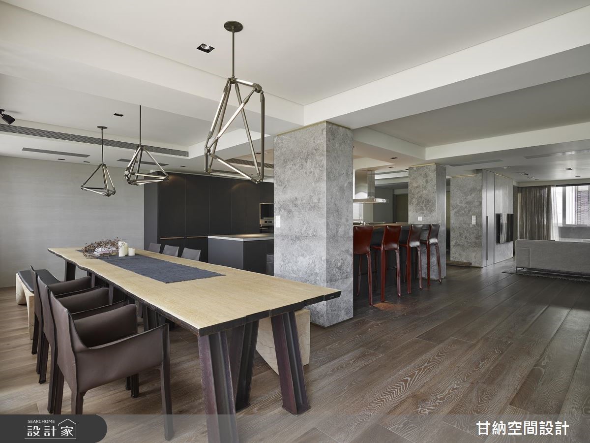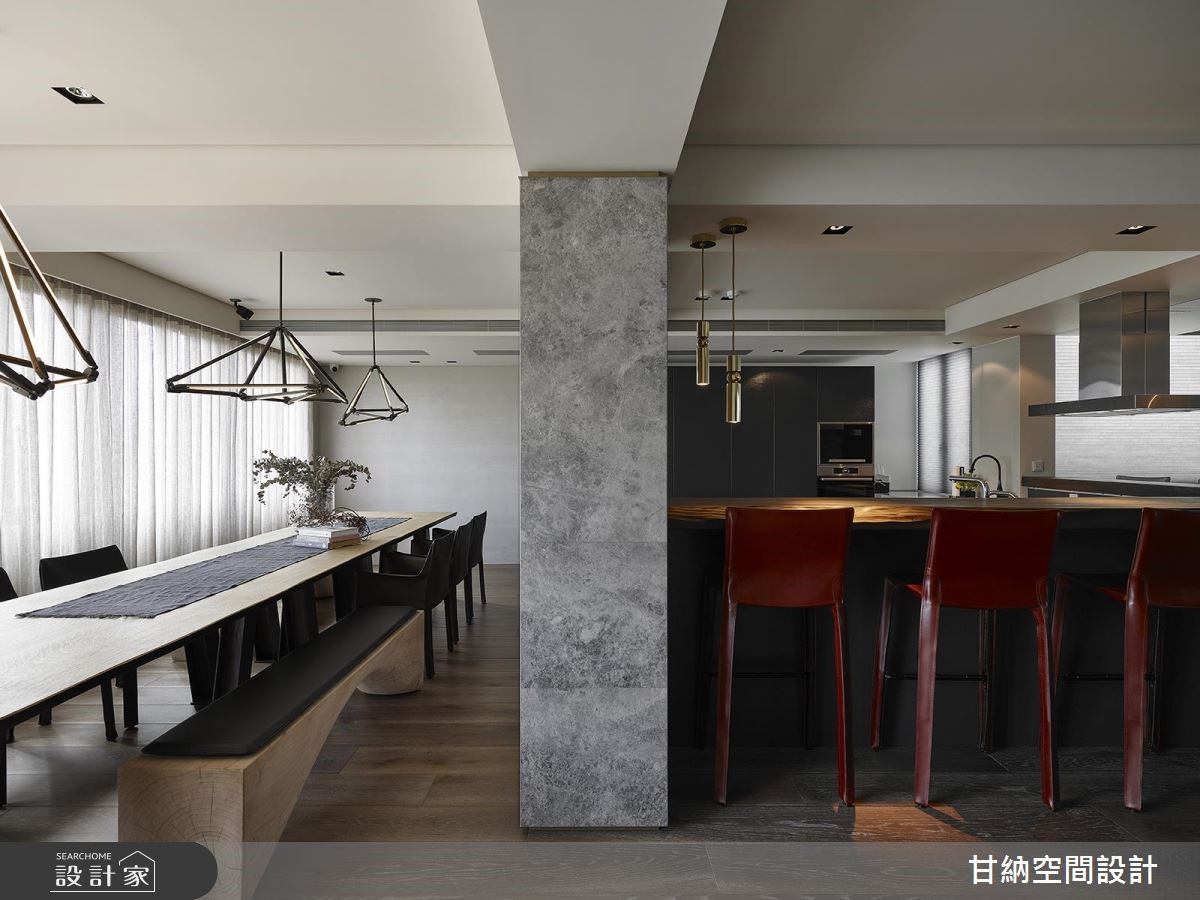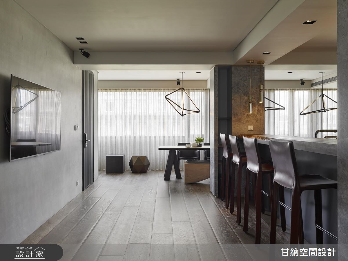 135平米老屋,为屋主的旧宅,基于以往那份成长的情感,在许多年后,屋主买回此处,并将本案装修为休憩居所,作为与亲朋好友一起重温美好时光的空间。【混搭装饰黑灰木三色调】设计师透过黑、灰、木色三色作为全室基调,透过混搭风的挹注与开放格局的擘划,利用建材与家具做出配置,界定区域的功能差异;吧台区着重于线条的表现,在餐桌上方加入灯具呈现不规则的立体几何感,藉此破坏暗色调的沉重感受,同时缔造用餐区域的不凡质感。【惬意微醺视听品酒区】家庭剧院区则以沙发摆设定义空间范围,让屋主可在此专心享受视听体验;走至后方的品酒区,则不同于前两区鲜明的线条表现,此区刻意于家具加入圆型元素,搭佐半月型沙发,型塑柔和慵懒的氛围,让屋主可惬意地休憩与品尝美酒! 【流动线条空间创意】空间中所分布的梁与柱,无形中形成了绝佳的空间架构,设计师化阻力为助力,透过梁体与柱体的分布型构流场动线,开启生活视野的最大弹性!