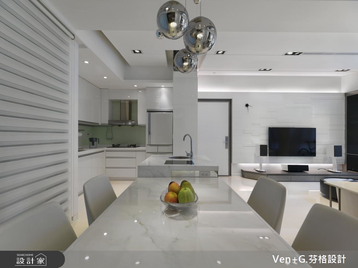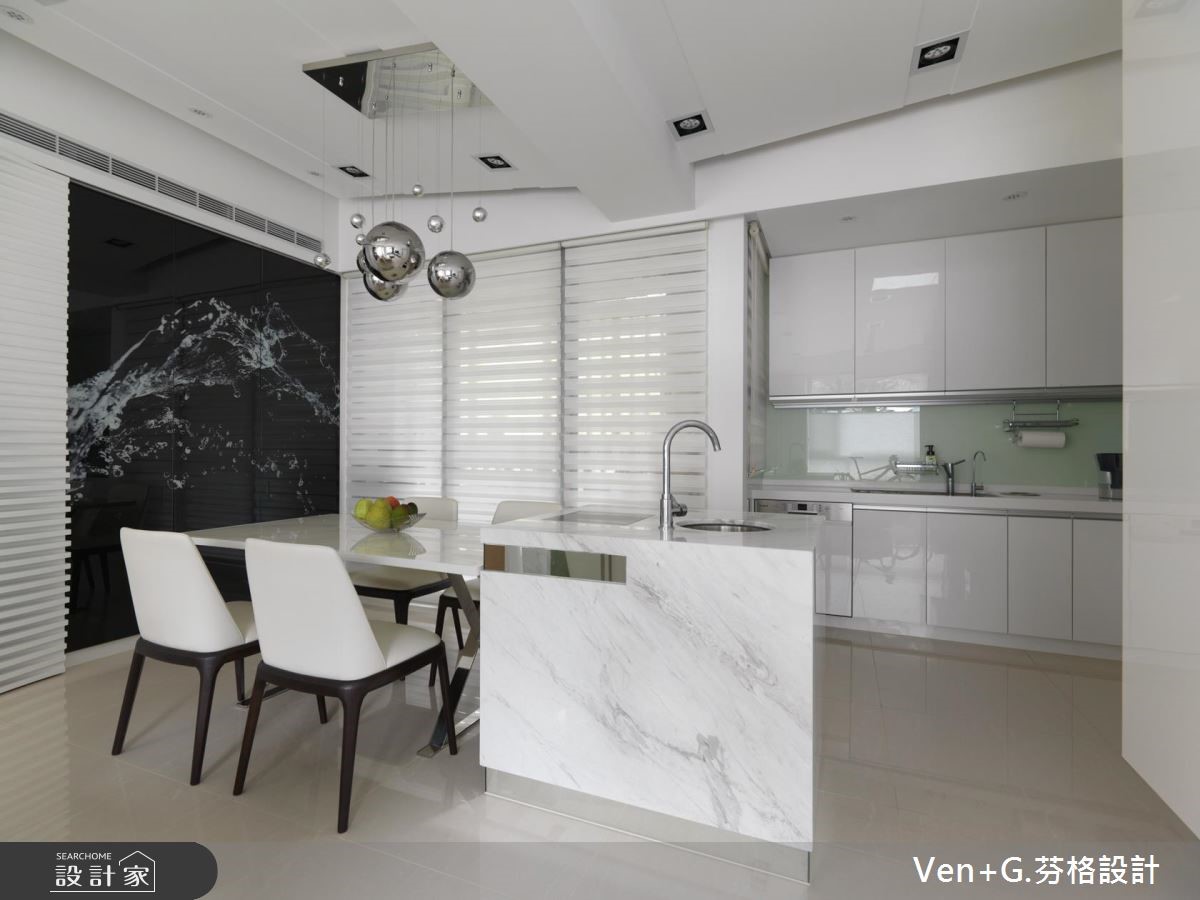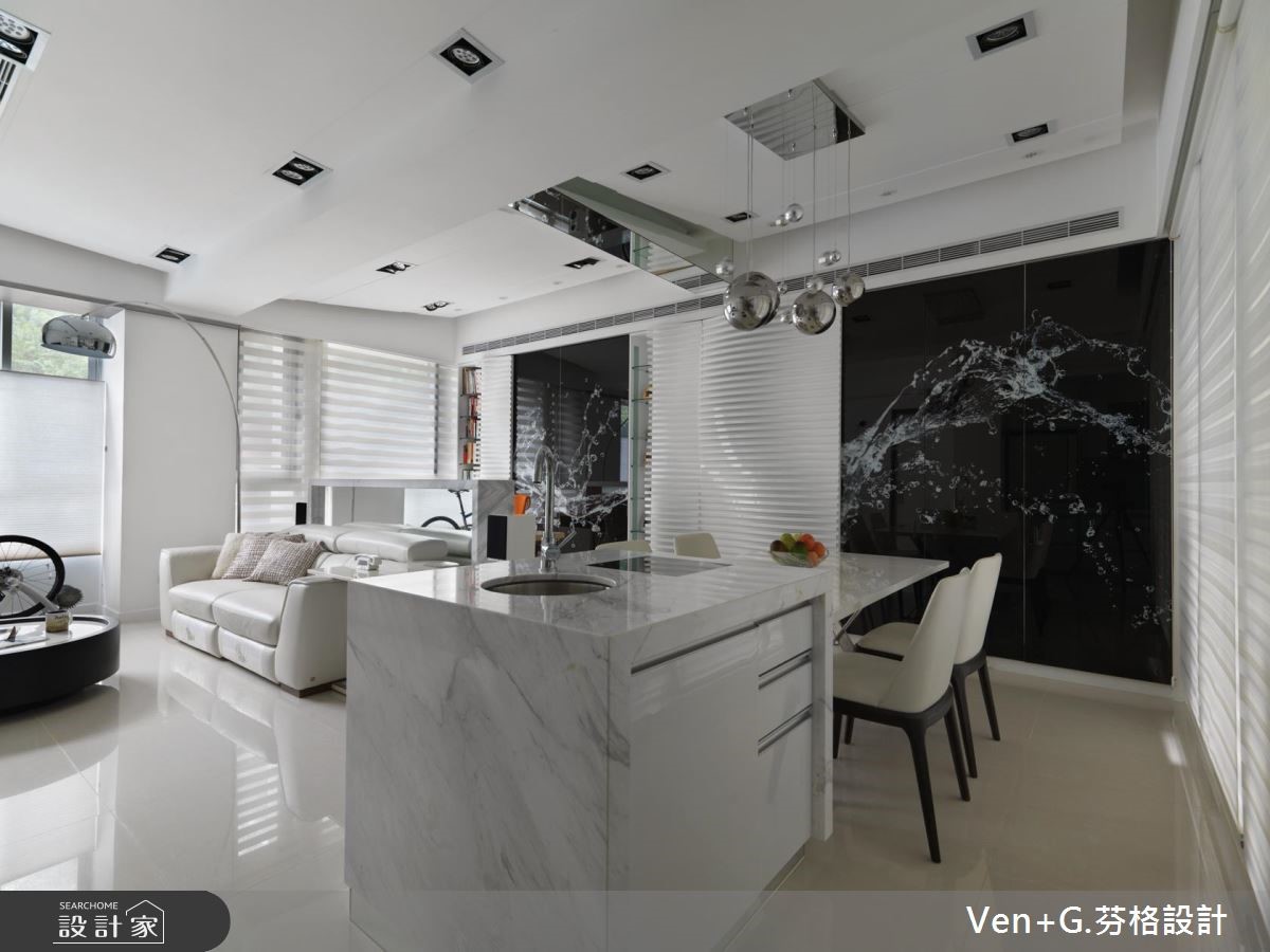 设计师以"水"为题,利用银、白、灰作主色调,层叠出浓淡有致的色韵,在此空间中,可感受到碧海浪花的抽象笔触,与窗外的翠绿山景相互对映,连成一片山光水色美景。【材质纹理,堆叠空间层次变化】设计师藉由材质的纹理,将抽象的水境变化成实体设计;并以开放式格局规划,使客厅与书房连通,仅以白色大理石作为小型隔屏,再巧用镜面创造通透效果,营造更为宽阔延伸的视野,同时加入印刷玻璃门片,使动态的水纹影像瞬间凝聚于空间之中,展演出律动的轨迹。餐厨区域所配置的中岛吧台,串联起半开放式的厨房领域,让家人间的生活互动更为紧密;主卧床头采用一体式造型规划,将床头板作为全遮光窗帘,打造优质的睡眠环境;小孩房则给予活泼甜美的跃层设计,温馨而可爱,在兼具风格与机能性之中,缔造最舒适的生活感。