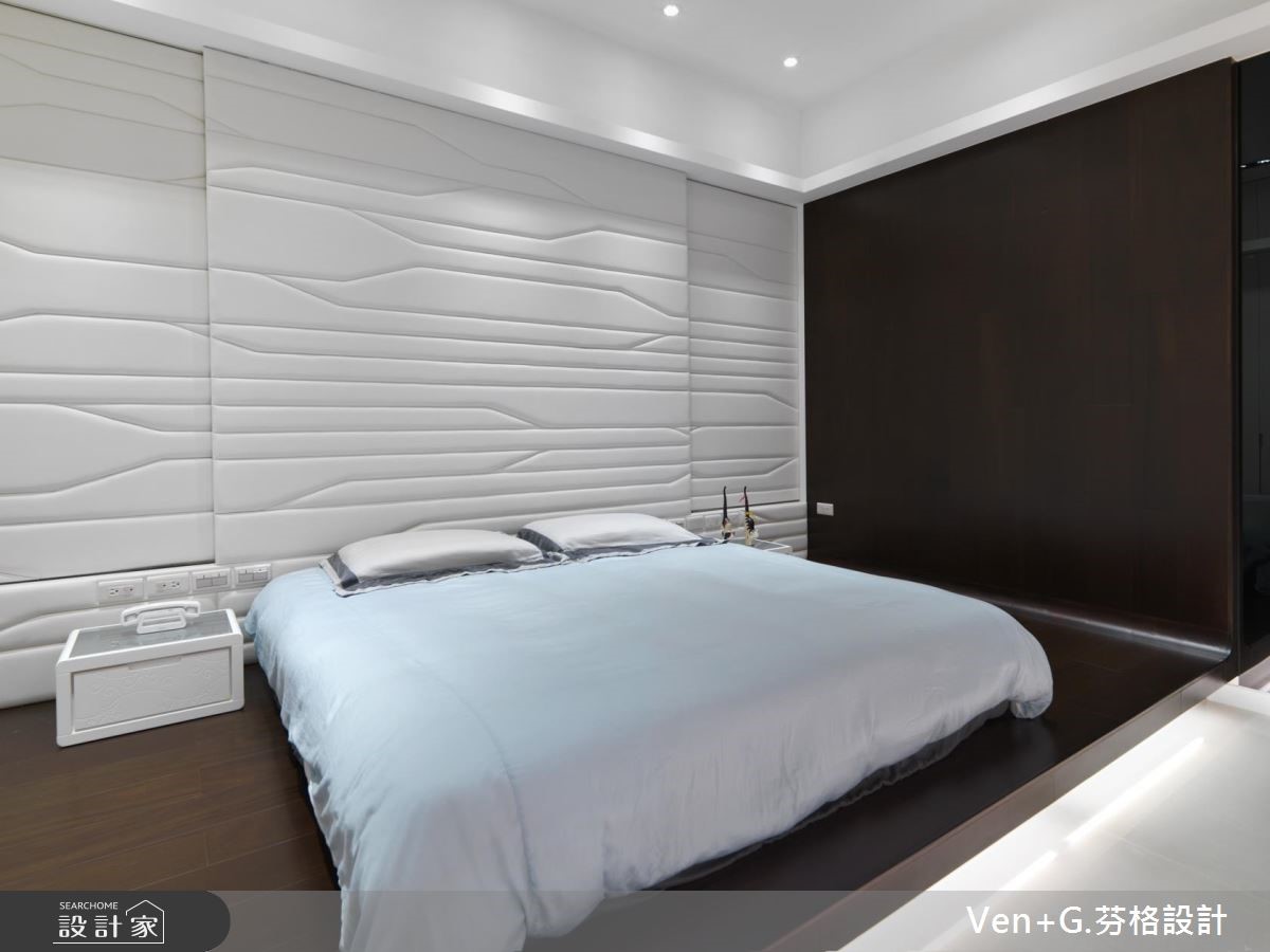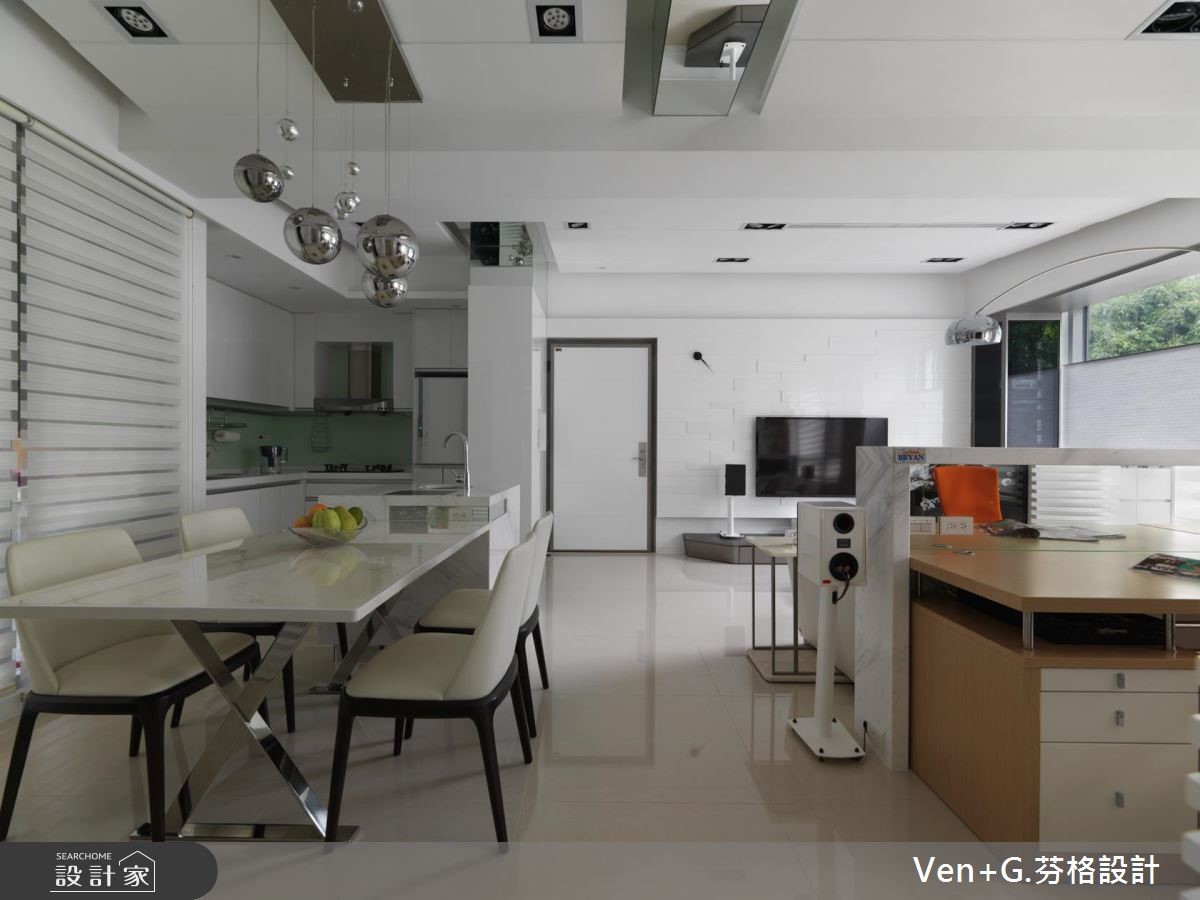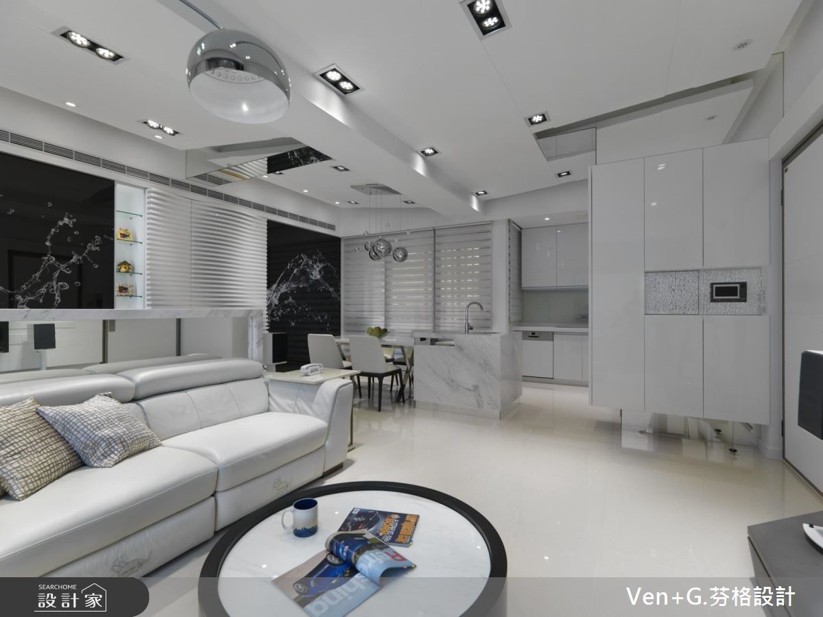 设计师以"水"为题,利用银、白、灰作主色调,层叠出浓淡有致的色韵,在此空间中,可感受到碧海浪花的抽象笔触,与窗外的翠绿山景相互对映,连成一片山光水色美景。【材质纹理,堆叠空间层次变化】设计师藉由材质的纹理,将抽象的水境变化成实体设计;并以开放式格局规划,使客厅与书房连通,仅以白色大理石作为小型隔屏,再巧用镜面创造通透效果,营造更为宽阔延伸的视野,同时加入印刷玻璃门片,使动态的水纹影像瞬间凝聚于空间之中,展演出律动的轨迹。餐厨区域所配置的中岛吧台,串联起半开放式的厨房领域,让家人间的生活互动更为紧密;主卧床头采用一体式造型规划,将床头板作为全遮光窗帘,打造优质的睡眠环境;小孩房则给予活泼甜美的跃层设计,温馨而可爱,在兼具风格与机能性之中,缔造最舒适的生活感。