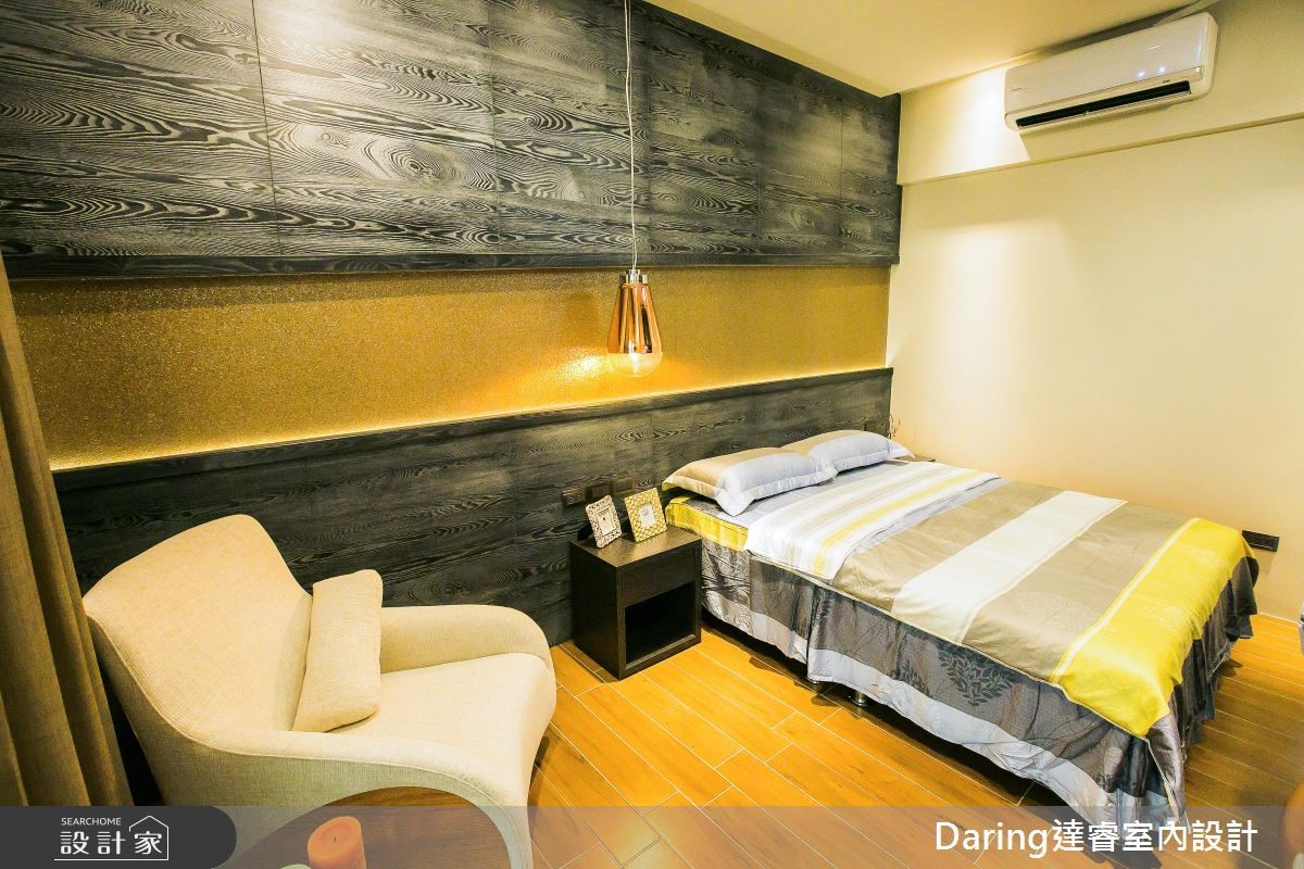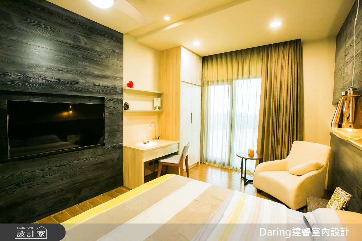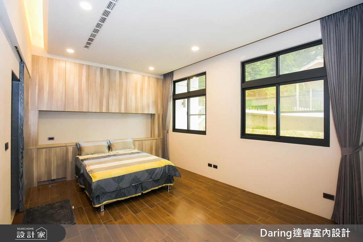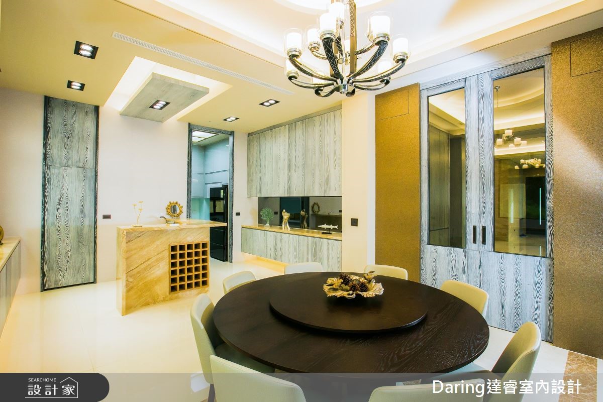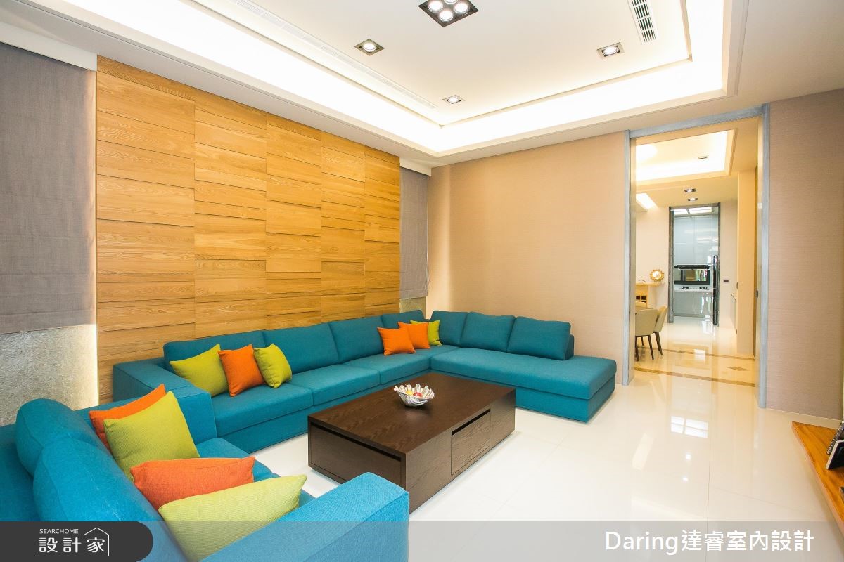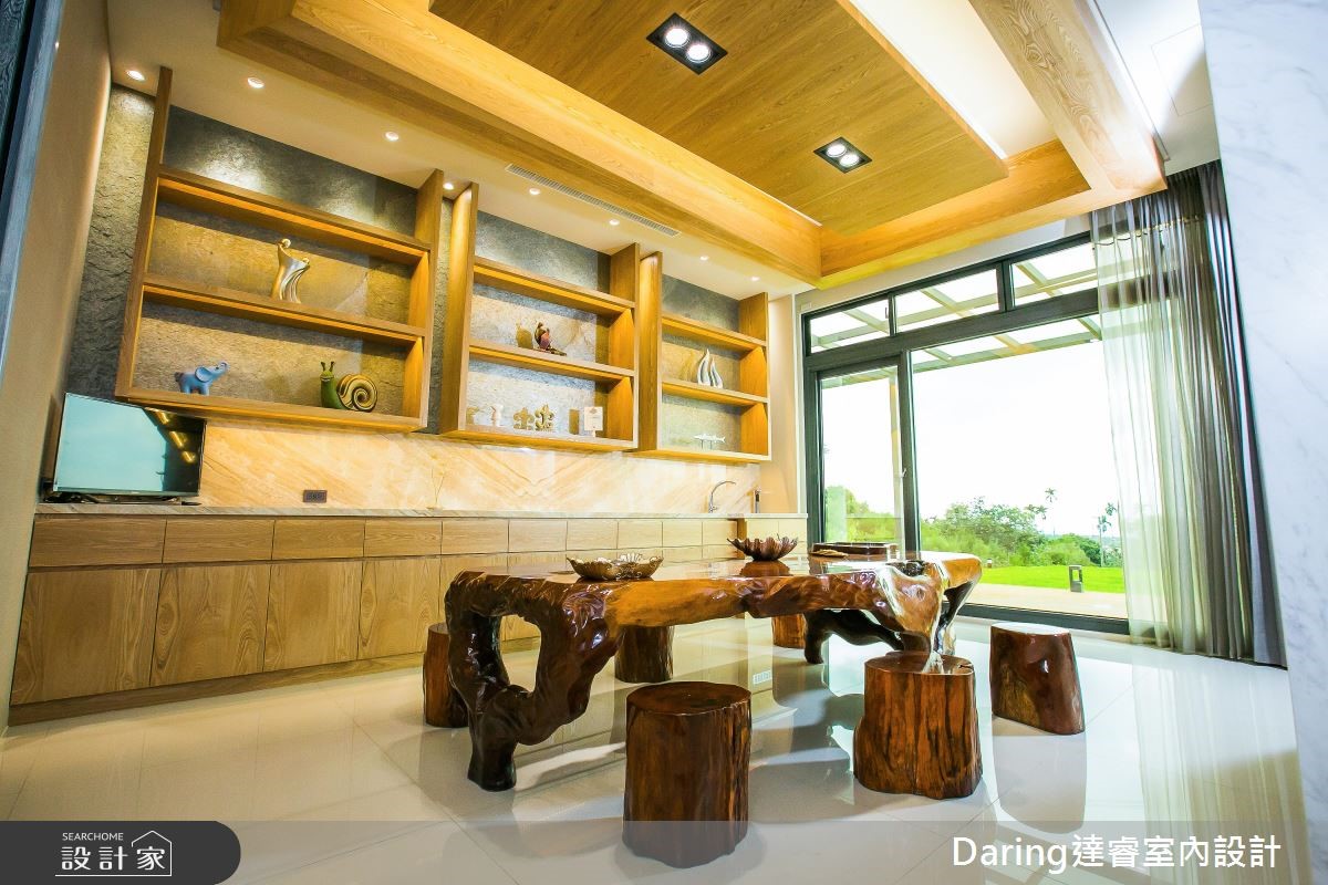 为了贴近屋主退休后所期待的度假生活,设计师发挥设计美学与创新思维,透过建材、线条与家具家饰品的铺叙,替488平方米的别墅注入鲜明表情,成功替屋主打造退休后的质感生活。【温润木质,为空间注入悠闲气息】透过大面窗导入日光,带出敞亮的公共领域,并藉由半高电视墙区划空间,导引流畅通透的行进动线。客厅以沉稳木质铺叙沙发墙,打造立体的墙面设计,搭配彩色沙发的调和,跳出活泼感;电视墙后则是泡茶区,以原木泡茶桌、收藏展示等为主轴,挥洒悠闲的生活情境。餐厨地带则分别规划热炒厨房、轻食吧台与餐桌,满足不同使用需求,再透过轻盈木皮包覆机能,打造全家人情感互动的核心场域;主卧回归纾压要求,透过浅木色、浅灰强调雅致温暖,并将可见的柜体采以无把手设计,落实简约无压的视觉印象。