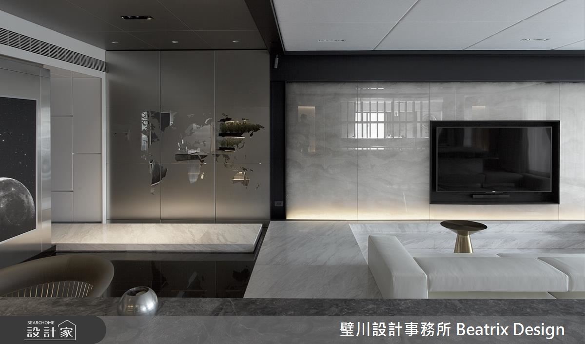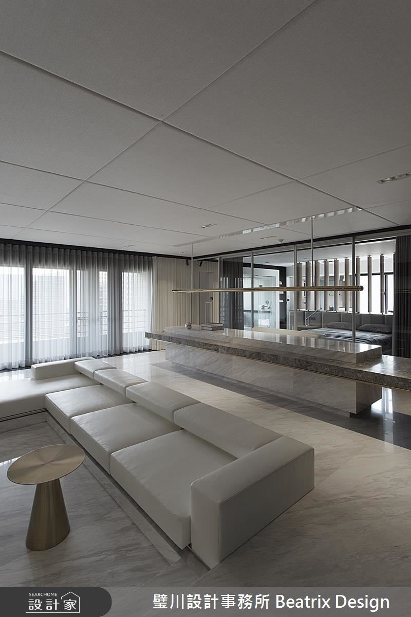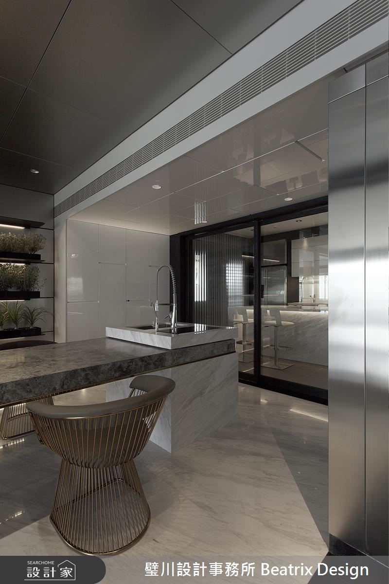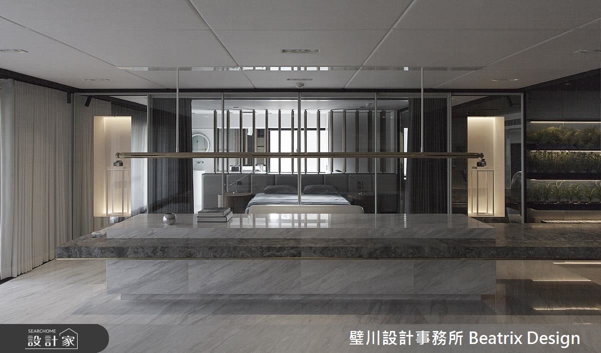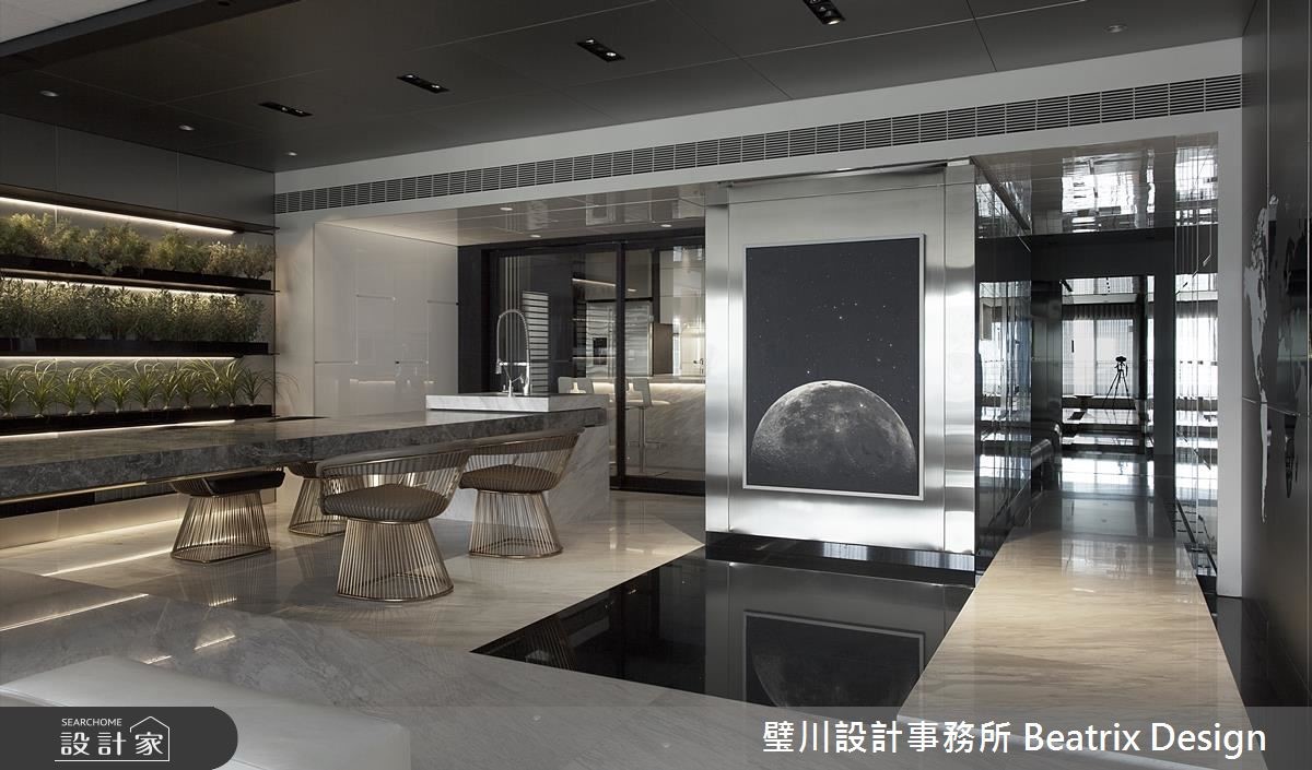 设计师藉由想象力与创意,打破居家的传统藩篱,在屋宅内注入艺术与摩登因子,让每个场域都宛如展演舞台,充满耳目一新的生活体验。【巧妙营造穿梭感,创造宽广视野】设计师考量到玄关、客厅衔接处跨过一支大梁,于是刻意压缩过道尺度,营造穿梭感,在穿出隧道之后,即可迎向宽广的厅区视野,并于地板作出高低踏阶,形成架空桥梁意象,拉深了视觉俐落性与延伸度。开放式的公共空间以白色打底、黑色点缀边框,并妆点不锈钢铺陈,色调简约纯粹,凸显架构中的立体设计;空间中心设计一道长桌,运用石材量体的穿插,表现桌体层次感,将工作、阅读、用餐、吧台、绿植墙等加以串联,大幅提升使用效益。长桌的端点为厨房,整合实用功能,并配置门片阻绝油烟,也可开敞坐享更宽阔的用餐场域;主卧跳脱制式框架,利用轻透玻璃作隔断,平时可让视野更加通透,需隐蔽性时,也能利用电动窗帘做屏蔽,在新颖大胆的设计手法下,创造无限惊喜!