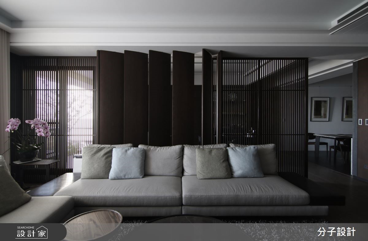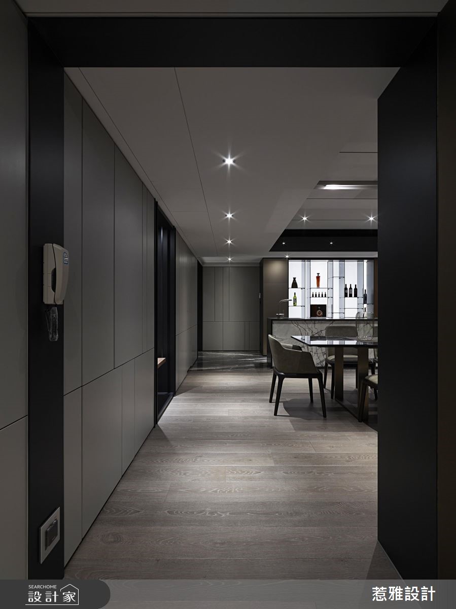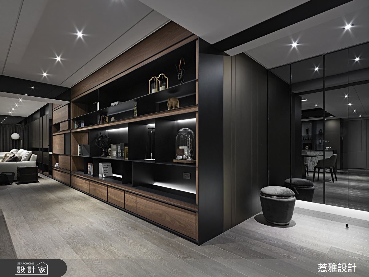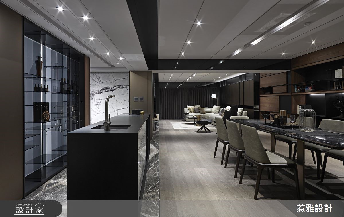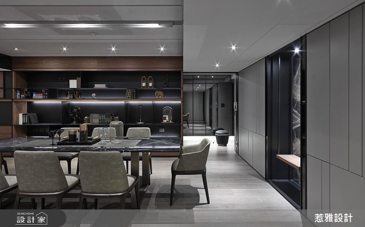 248平方米二手屋,为屋主夫妻预留给未来的退休宅,经由设计师缜密的设计后,成功解决了房屋的梁柱压迫、畸零空间等问题,并透过酒店风格的美化,呈现崭新而雅致的居住视野。【造型柜门与门片,修饰突兀柱体】设计师为了做出较大幅宽与长轴空间感,运用大量的铁件造型柜体以及门片造型修饰,来混淆原本偌大笨重的柱体存在,藉由块体与开放格柜,展现跳跃视觉感,同时也增加收纳展示机能。【长轴线布局,延展空间层次】低矮天花与大梁,则使用黑色镜面来作修饰,框出不同的场域范围;空间亦选用大器石材,彰显独特的艺术纹路;视觉可见的所有立面,都刻意加入长轴线布局,像是让餐厅餐柜串联沙发背柜,形成更为延展的空间感与层次变化。