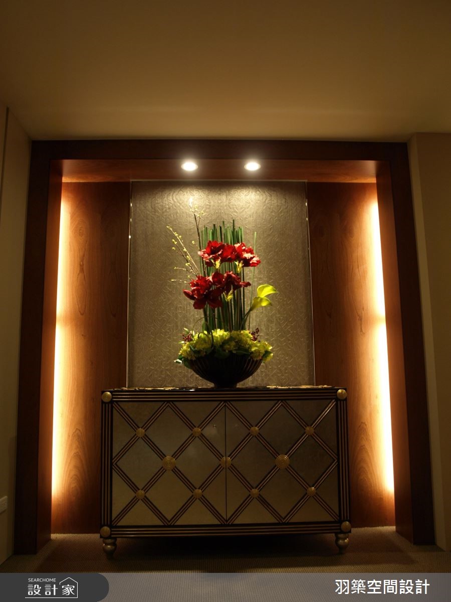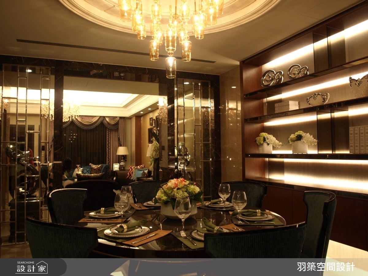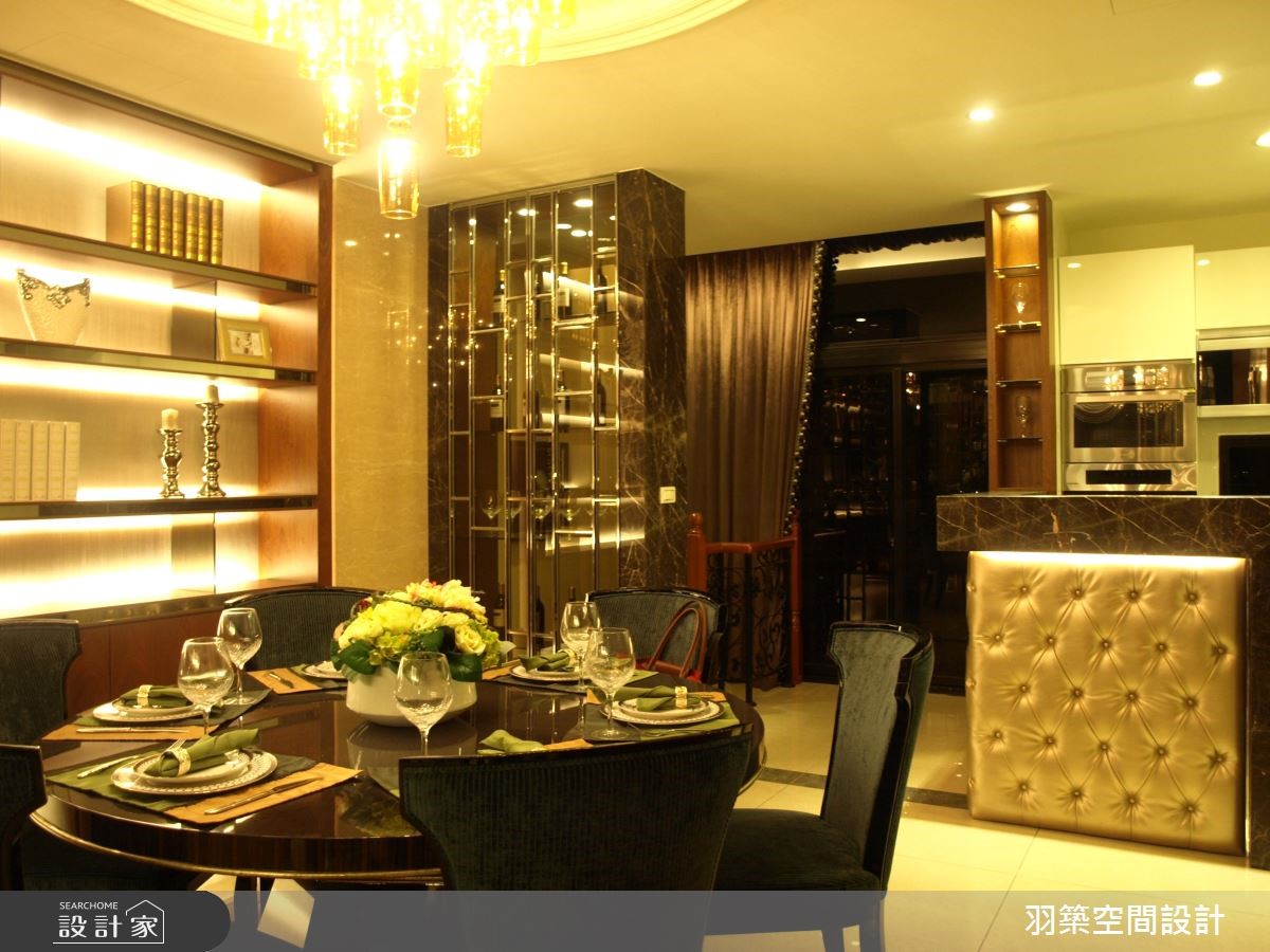 198平方米的透天别墅,设计师透过灯光营造以及大器建材,缔造奢华优雅的生活场景,同时在每间居室给予不同风格与机能属性,满足每位家庭成员对空间的期待。【清透玻璃,让视觉与光线延伸】玄关区采以框景搭配花艺,援以灯光衬托,围塑高雅的入门景致;并个别在餐厅、客厅悬挂华丽水晶灯,透过天花造型的对应,区划空间属性,除了融入细致的摆件与布艺,亦于局部带入金属色泽,诠释气派风范,且善用大理石材与镜面反射,呈现闪亮璀璨的空间特质。客餐厅之间则透过屏风结合门拱设计,界定二者范围,在玻璃的局部使用下,连串起公共领域的光线交流,吧台区底部更巧妙加入雾面感皮革,串联无所不在的奢华语汇;主卧区除了舒适性与实用机能,也透过风格营造,酝酿不同的空间风貌,量身定制全家人的梦想寝居。