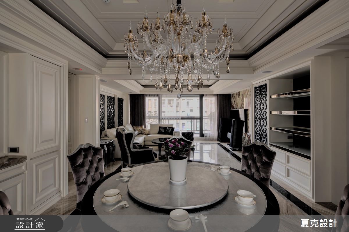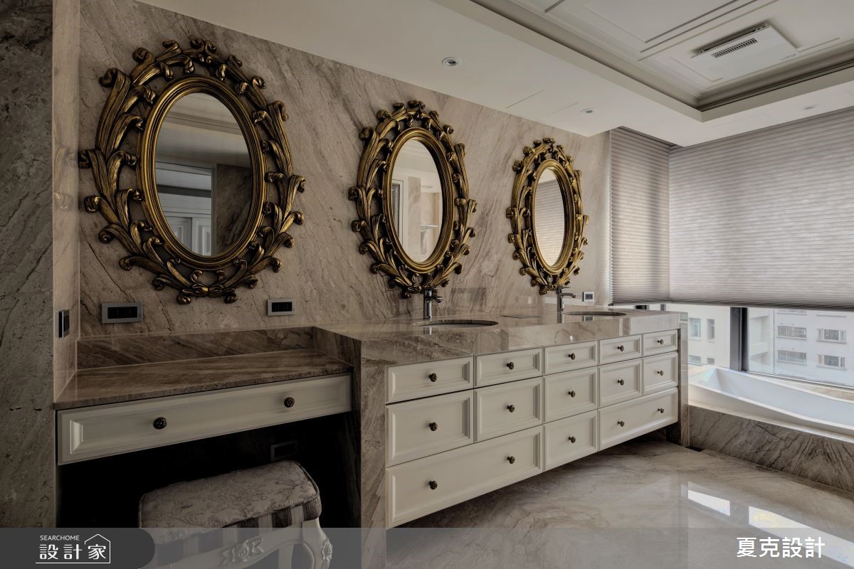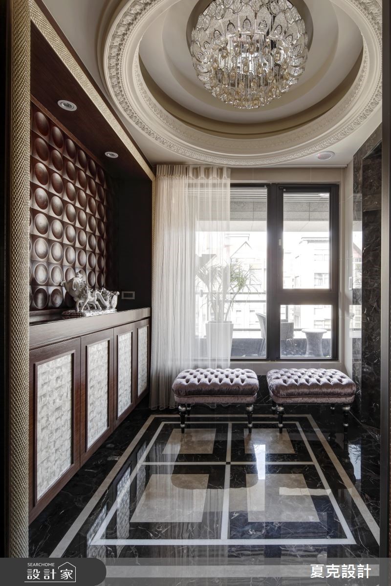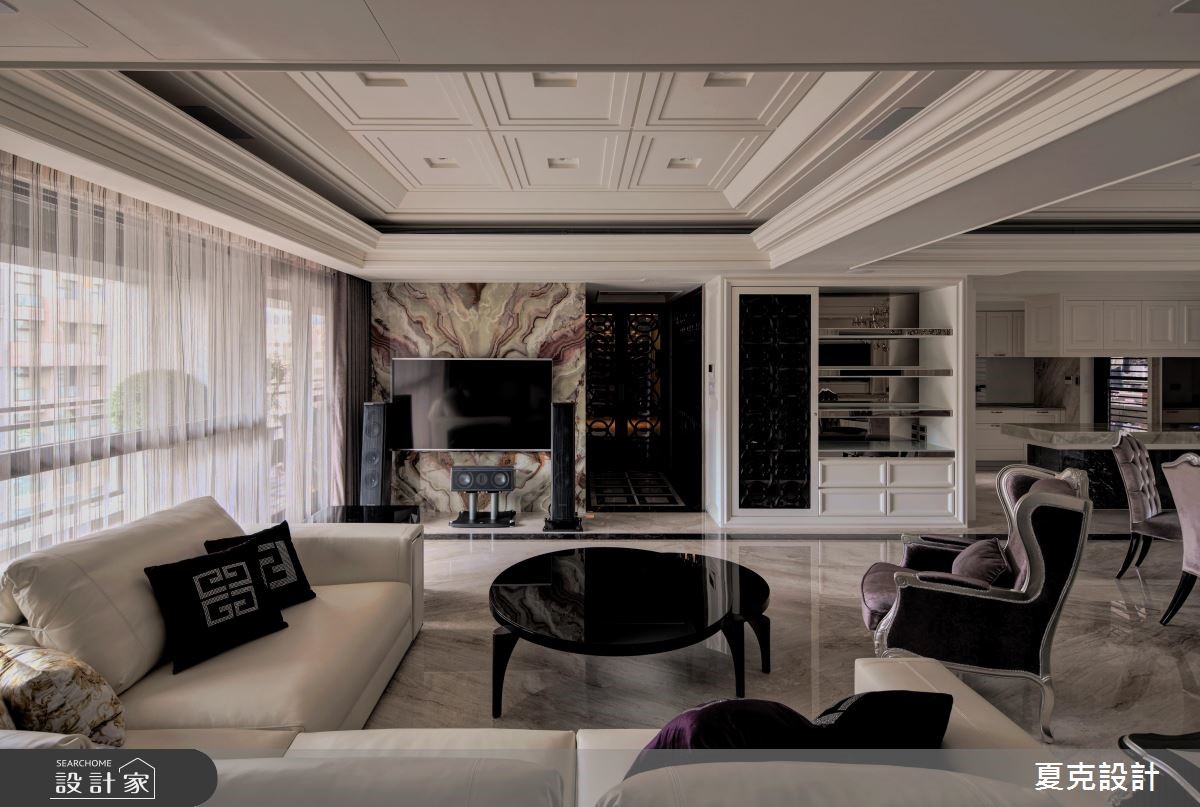 231平方米的古典风大宅,设计师运用地理优势与绝佳景观,将建筑气势与生活品味完美融合,演绎当代豪宅的大器视野。【贵气石材纹理,营造奢华情境】全室采大理石地坪铺陈,搭配透光青玉石的电视墙,透过灯光与采光的烘托,渲染出自然生动的石材质纹;天花则加入充满立体层次的线板造型,营造挑高视野;而沙发背墙上,特意使用雕刻图腾打造电动门片,不仅让视觉聚焦,亦形成厅区与书房间的通透界定。餐厅区则将电视整合于柜体,运用弹性门片作出修饰,且纳入优美窗景,塑造雅致开阔的用餐景色;主卧内,采美式新古典风格,以立体流线装饰床头主墙,搭配细致的大地色绒布,在精致中不乏舒适高雅,带出居住者的专属魅力。