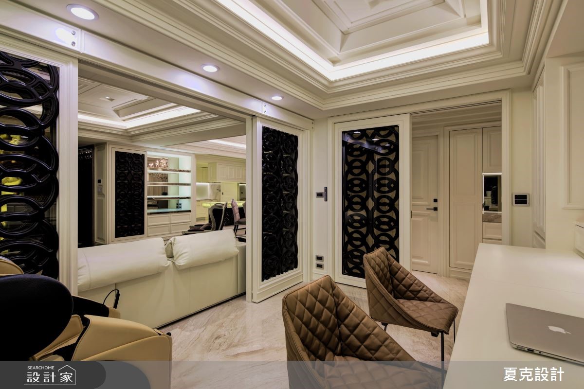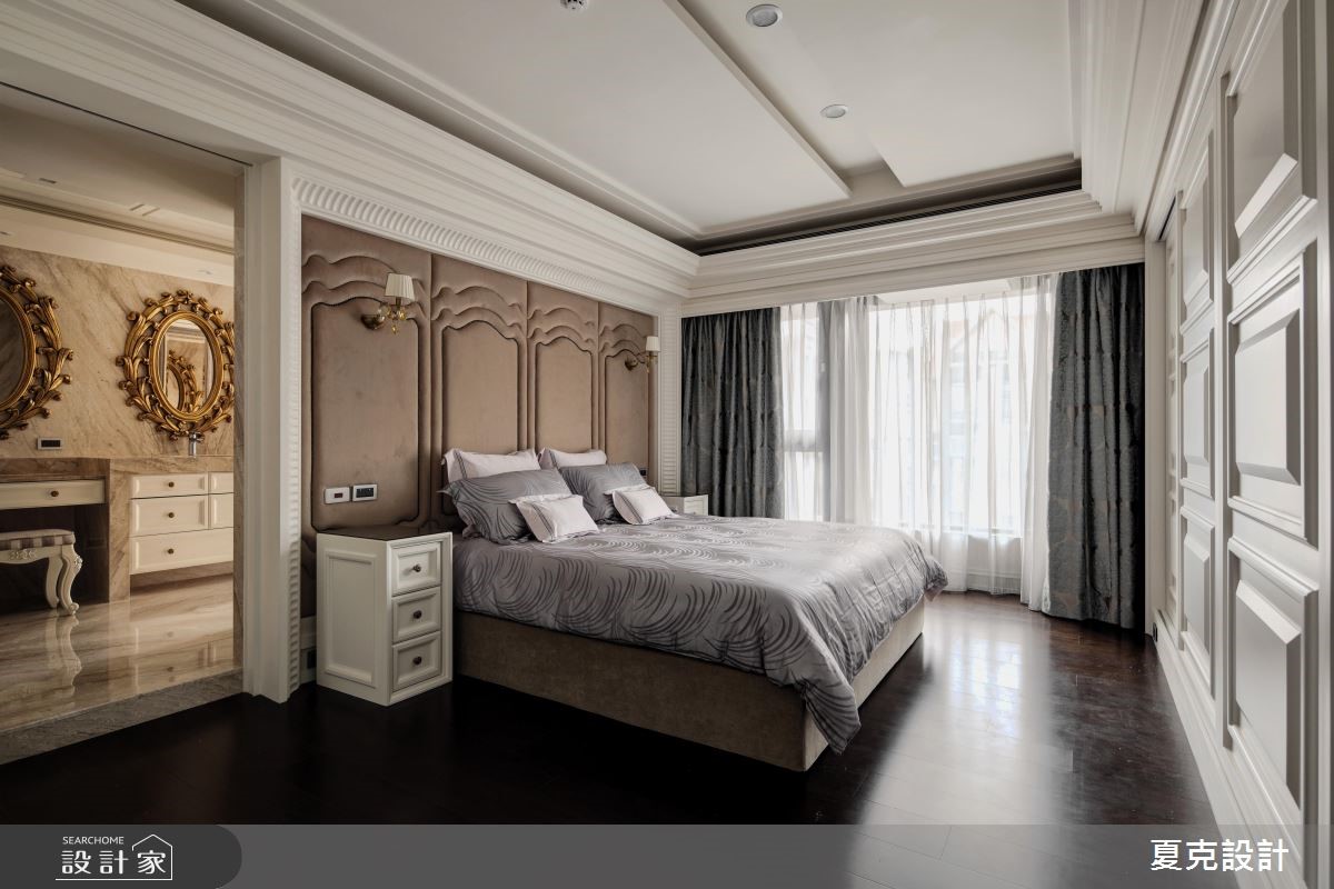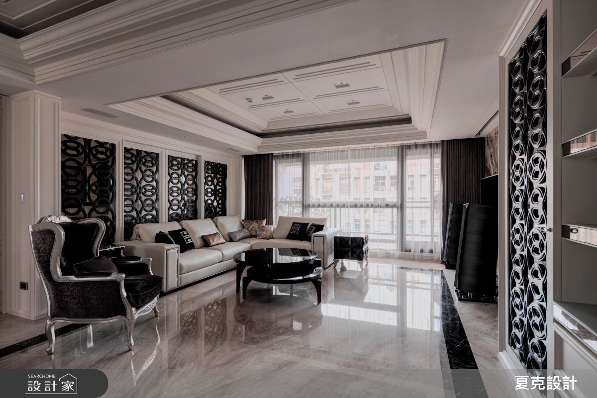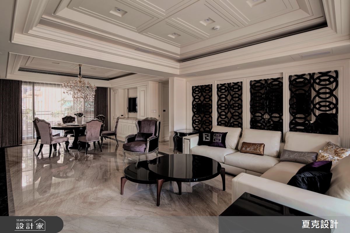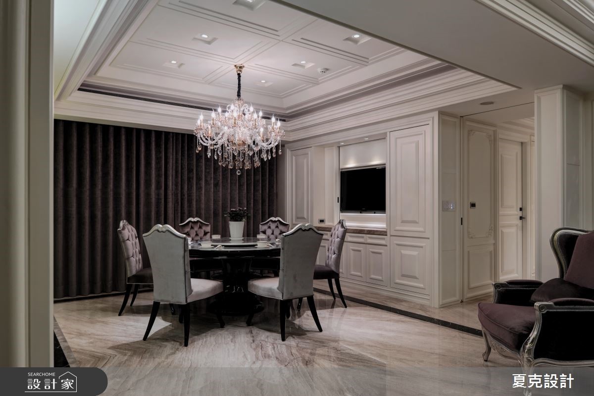 231平方米的古典风大宅,设计师运用地理优势与绝佳景观,将建筑气势与生活品味完美融合,演绎当代豪宅的大器视野。【贵气石材纹理,营造奢华情境】全室采大理石地坪铺陈,搭配透光青玉石的电视墙,透过灯光与采光的烘托,渲染出自然生动的石材质纹;天花则加入充满立体层次的线板造型,营造挑高视野;而沙发背墙上,特意使用雕刻图腾打造电动门片,不仅让视觉聚焦,亦形成厅区与书房间的通透界定。餐厅区则将电视整合于柜体,运用弹性门片作出修饰,且纳入优美窗景,塑造雅致开阔的用餐景色;主卧内,采美式新古典风格,以立体流线装饰床头主墙,搭配细致的大地色绒布,在精致中不乏舒适高雅,带出居住者的专属魅力。