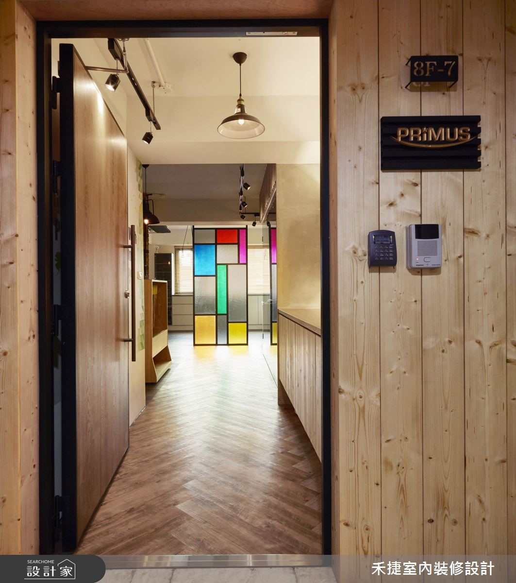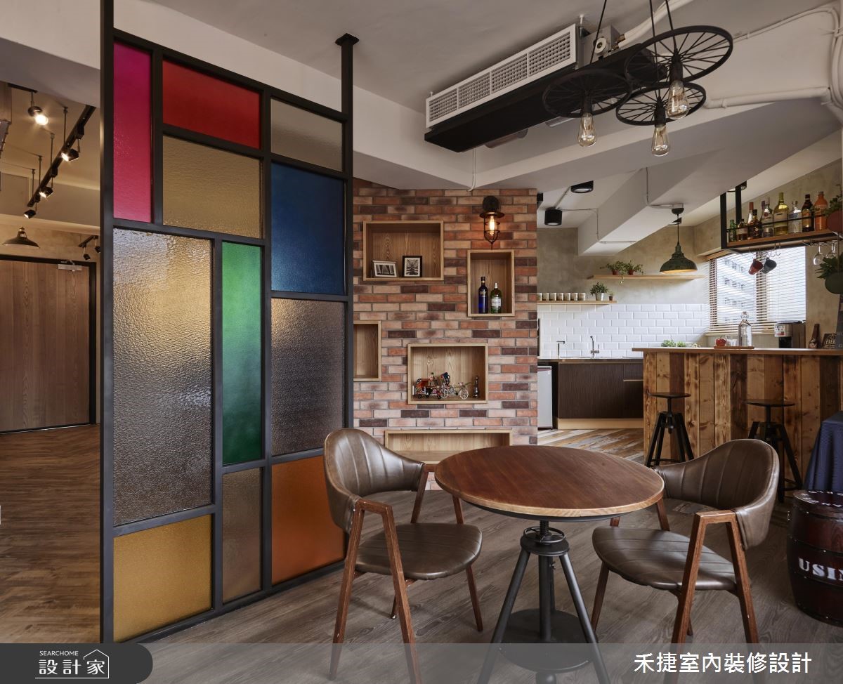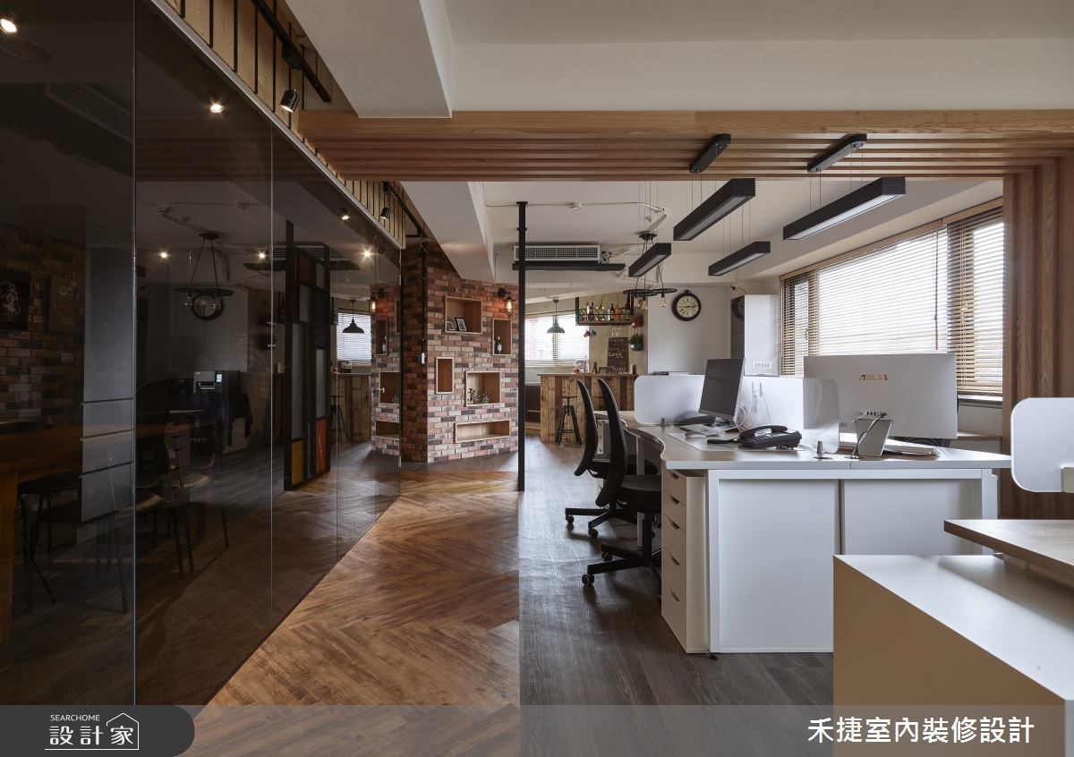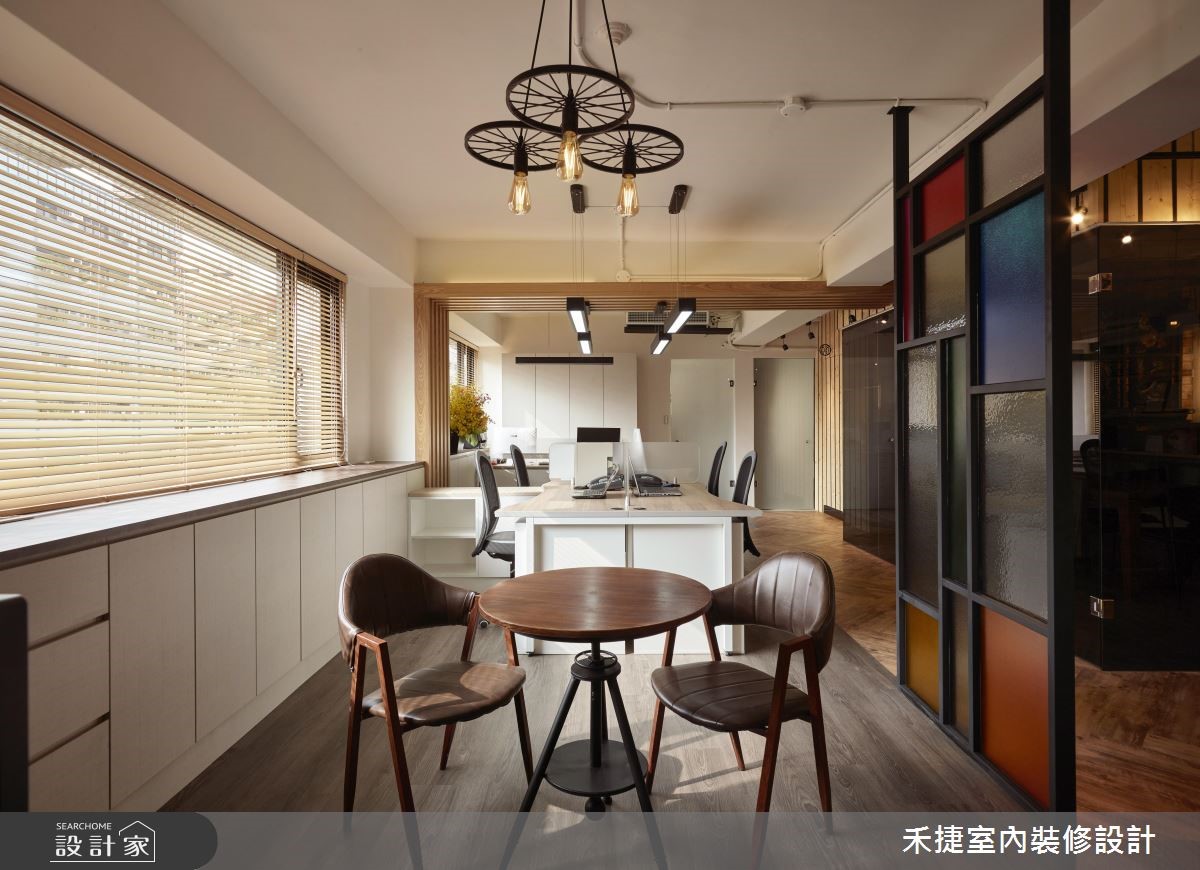 总是觉得办公室制式又无聊吗?不妨来看看这个颜料公司的改造案,屋龄50年的老旧写字楼,重新规划设计后,不但变得明亮开放,更具有复古的全新面貌。 【斜拼地砖修饰,空间视觉变方正】走进这处写字楼,以廊道作为气氛转换的设计开端,一旁是属于公司品牌的 LOGO意象。底端的彩绘玻璃隔屏遮挡了办公区的视线,成为视觉亮点。因原本格局并不方正,将畸零区划分为吧台、商品展示区以及一间储物室,加上斜向拼贴的塑胶地砖,视觉更加完整。动线设计以开放、宽敞为主,员工办公区设置在采光面旁,另一侧的会议室则藉由玻璃隔断保持通透、明亮感,也具有独立的隐私性,不必担心会打扰到其他人。董事长办公室和颜料实验室移至空间动线的内侧,方便进行产品开发和实验。