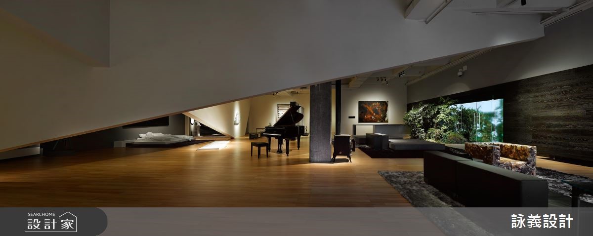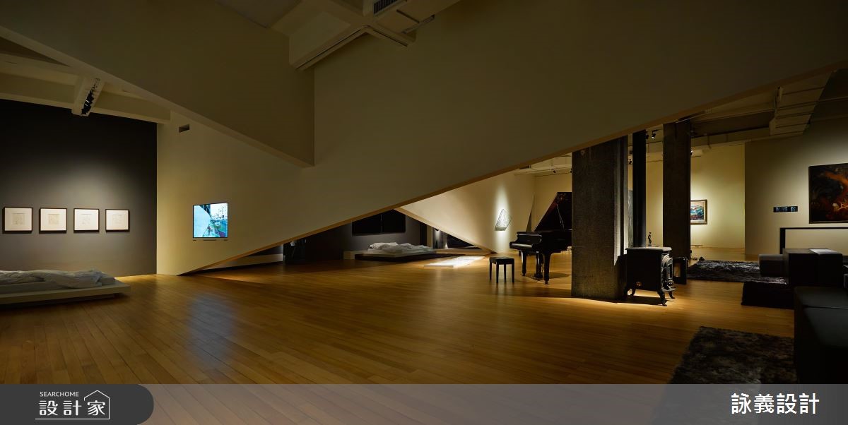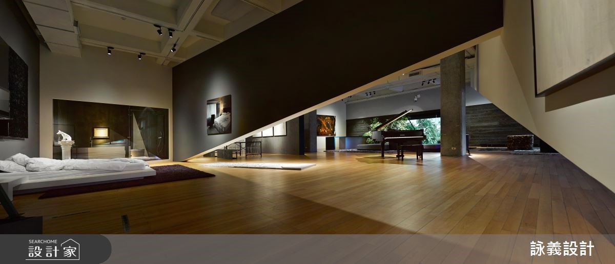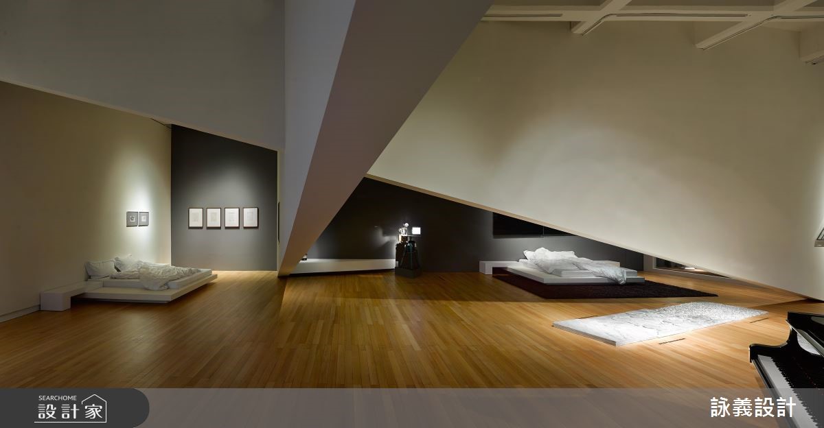位于台北市立美术馆内的展场,有一处舒适近乎奢华的家居空间,名为"我在中山刘公馆",犹如自家的设计般,实际上从电视播放的影墙、墙面画像或角落一景,都是选自美术馆典藏的艺品,并以透光落地照亮此挑高场域,缔造介于美术馆与私人住宅之间的新颖感受。【立体斜线架构,打造丰富层次】为让室内与户外可自然和谐的交融,设计师加入室内绿化的概念,并藉由窗景导引绿意入室,并在不影响整体的流畅与穿透感前提之下,达到空间叙事的架构与功能,使用两道斜线作为界定,突破平面之上的斜线,化为三度空间上垂直向度的斜面,型塑出立体的领域架构。每道斜线不仅区隔出各个区域,又带出流动的特质,演绎相当丰富的视觉层次,且让观者处在各个角度,都能观览到不同的面向,获得截然不同的视觉体验;而每个场域机能如客厅、工作室、卧房、餐厅等,都恰如其分的安居在最合适的位置,展开艺术的对话。