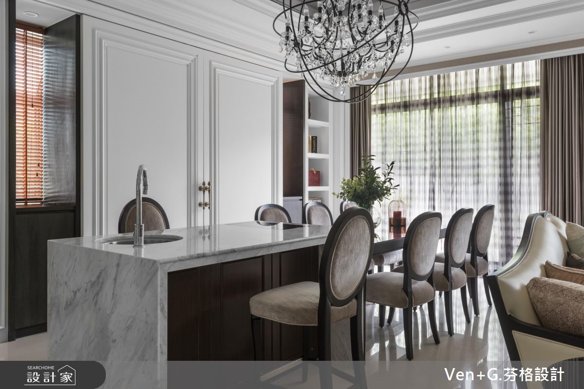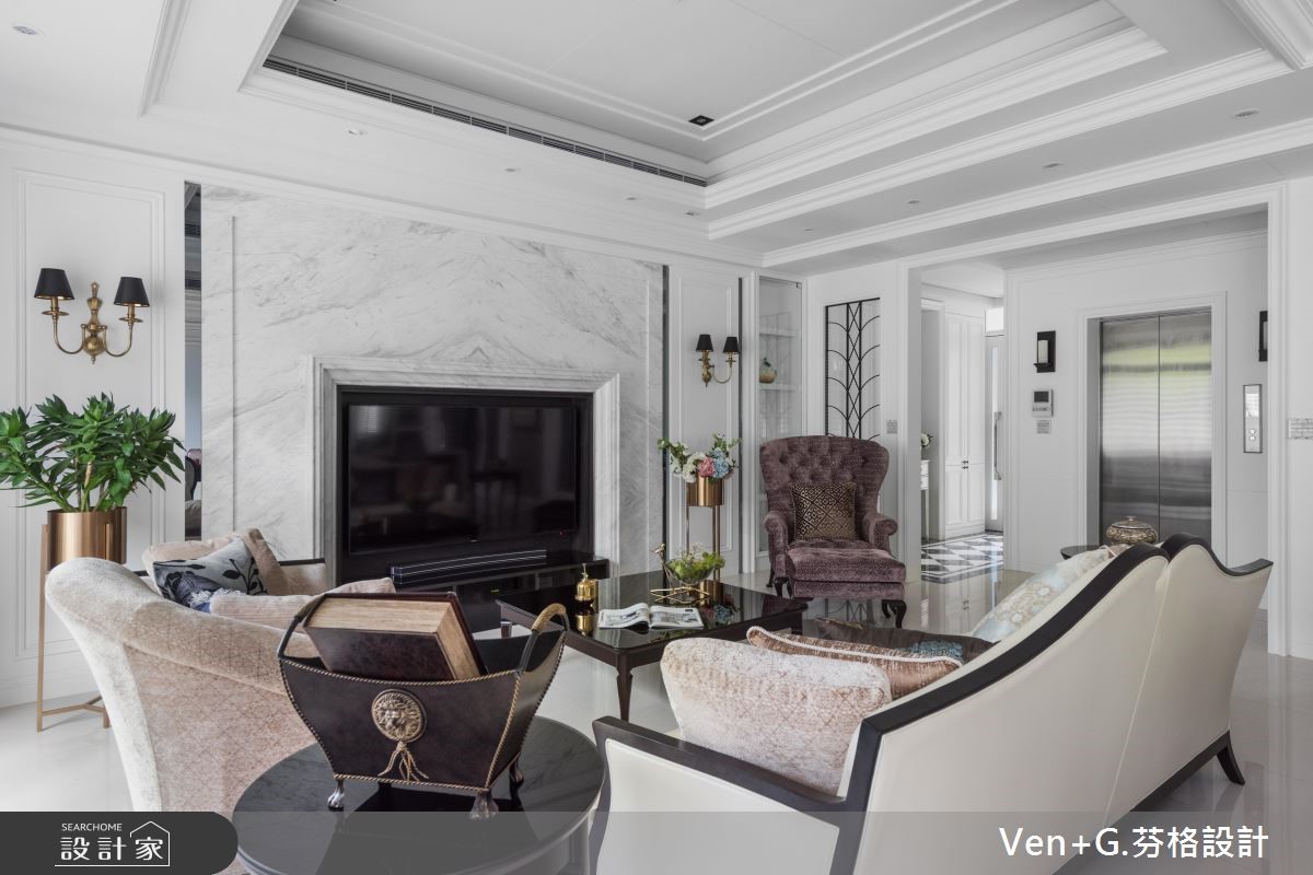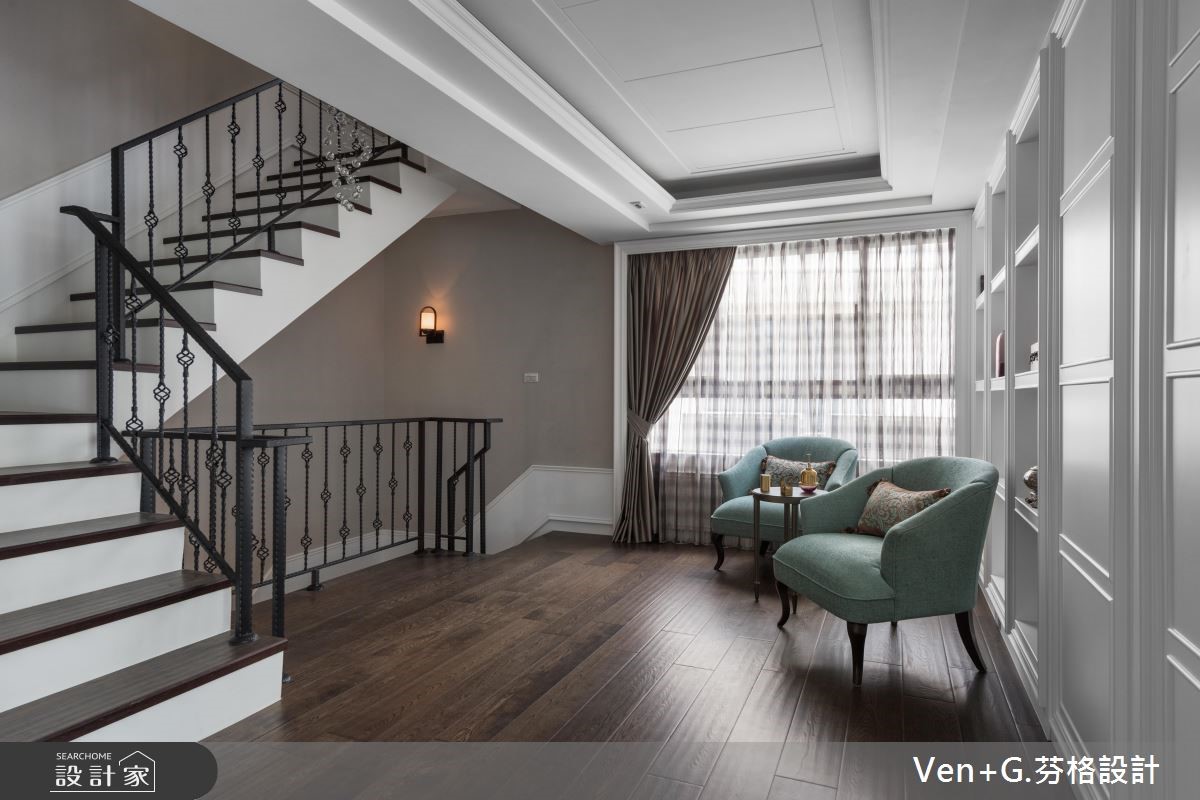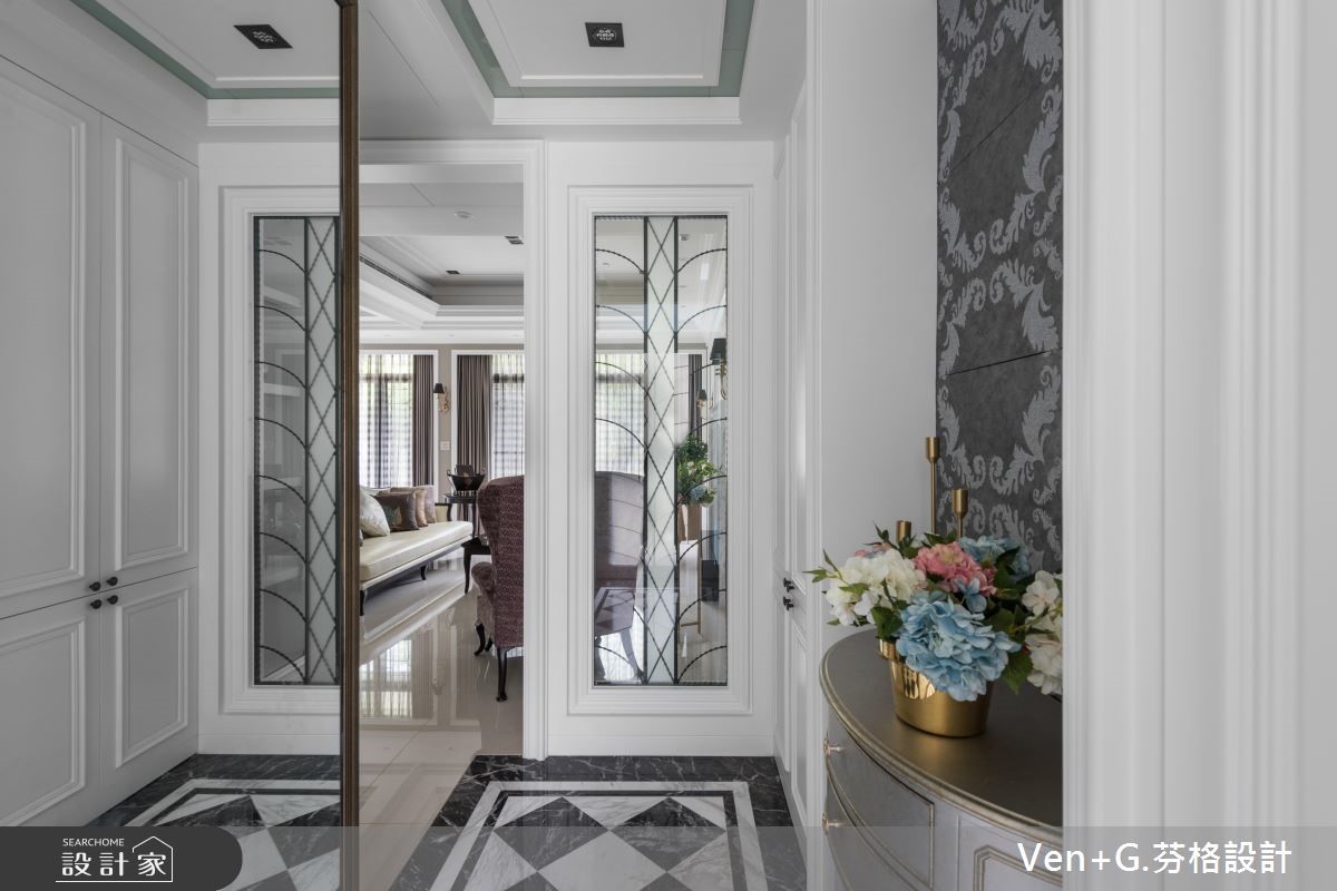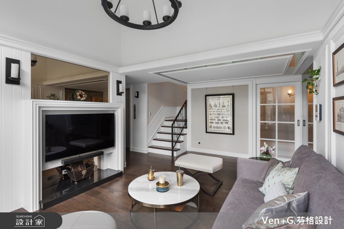 这处4层楼的美式风大宅,不仅拥有充沛的采光和绿意景色,设计师以纯白色为基调,细节处融合新古典式的优雅细致,营造出宛如贵族庄园般的氛围气质。【纯白色调,打造清新美式空间】玄关处运用大理石拼花及锻铁花纹呈现精致大器感,加上大幅的穿衣镜,兼具放大空间的视觉效果;一楼为开放式客餐厅,利用移动式家具围塑定位,细部则加入美式线板、大理石以及壁炉造型,注入美式风情调。私领域的规划,包含起居室、主卧,并搭配精品级的更衣室和高级酒店式的卫浴设备;而位在4楼的小孩房则在挑高的空间上方打造阁楼,利用梯阶下方作收纳用途,并以纯白色调搭配浅蓝,搭配童话里的斜屋顶设计,打造出兼具睡眠、游戏和亲子交流的多功能空间。
