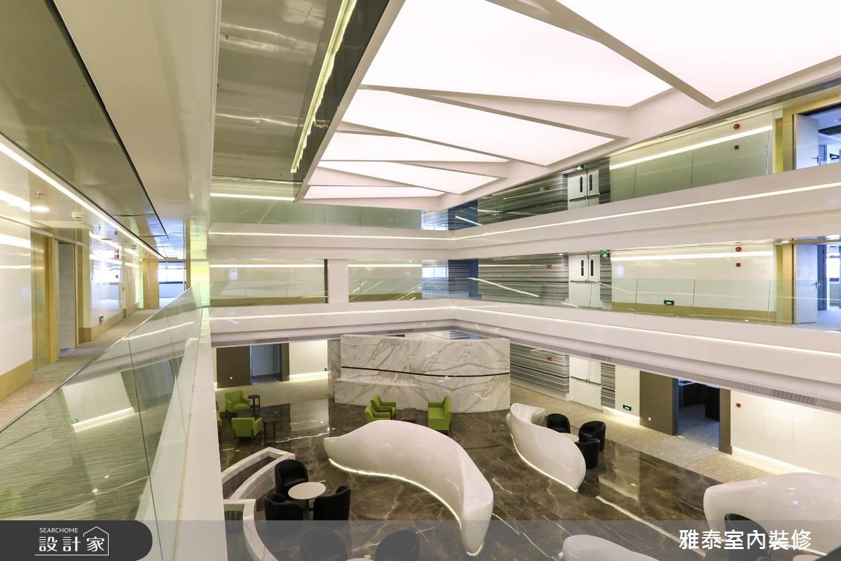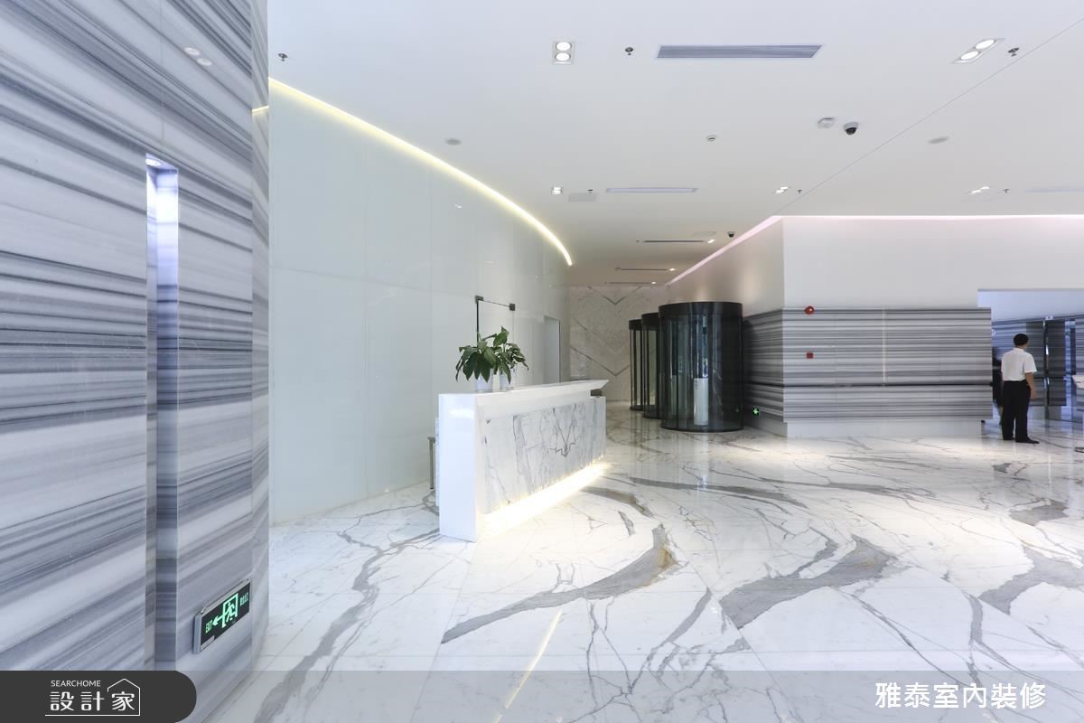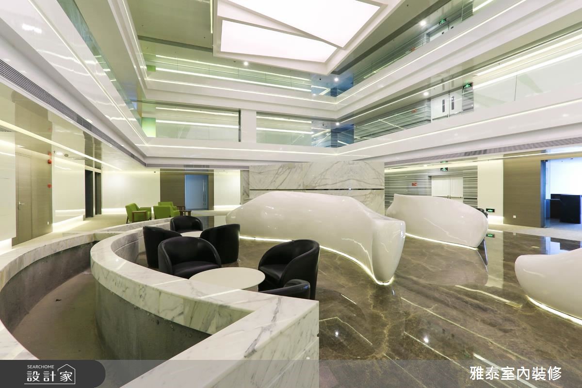 位于深圳深南大道的30层私人商业大楼,设计师依循建筑的主体架构做出美化,让空间更加立体与实用,并跳脱既有结构的深色沉重感,选用亮色系建材,搭配四面采光的优势条件,再造大器轩昂的企业形象。【清爽色调,营造宽阔大器感】设计师跳脱原先规划的深色风格,改以明亮的白色为主调,不仅扩大视觉感受,也凝聚高科技的公司印象。大厅的四根柱子为空间中醒目焦点,设计师加入水平向的线条设计,呼应整体的灰白色大理石地坪,如此修饰不但减轻柱体的压迫感,更彰显了挑高的气派感。中庭区域则藉由桌椅的安排,规划许多小型的讨论区块,且透过充满雕塑感的手法打造隔断,以自由流线的量体造型,让各个讨论区互相串联也保有适度区隔,演绎有如美术馆般的艺术视野!