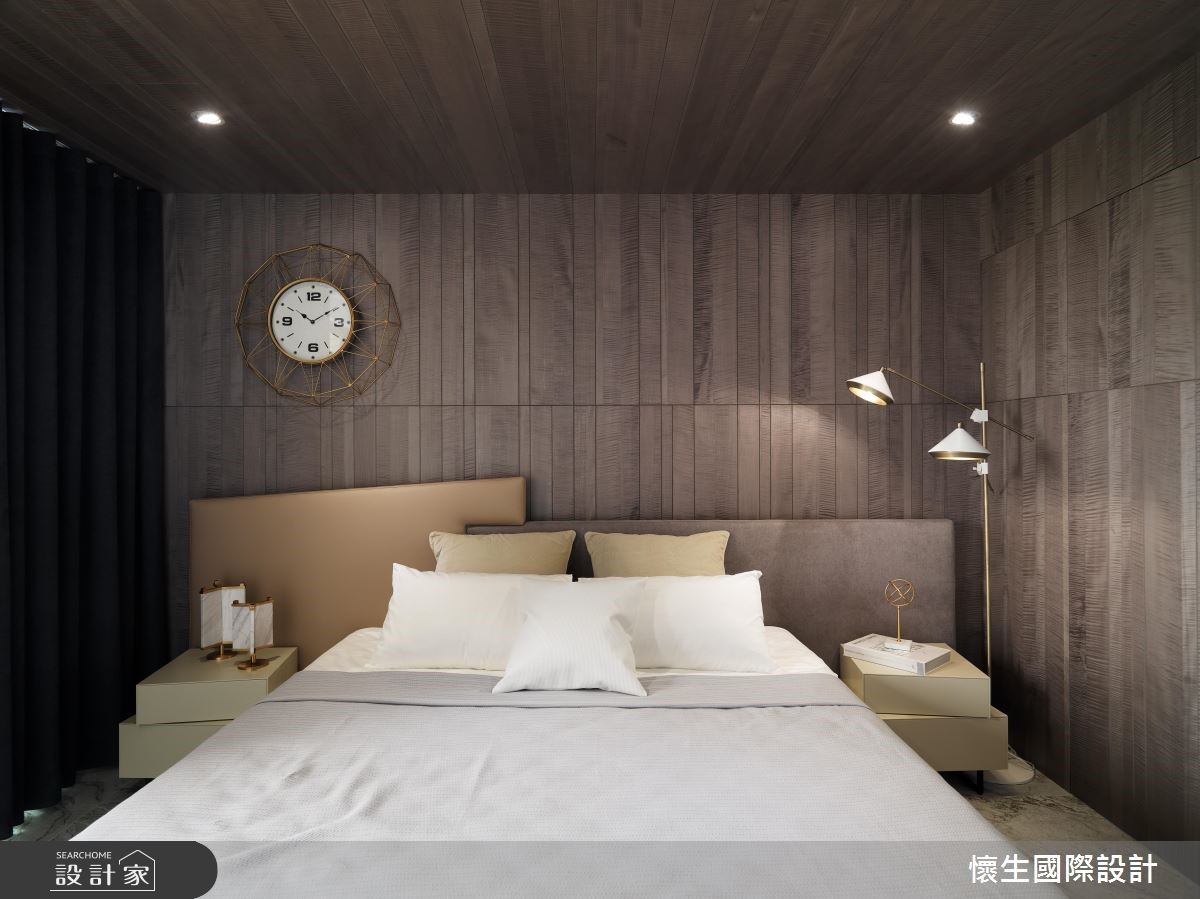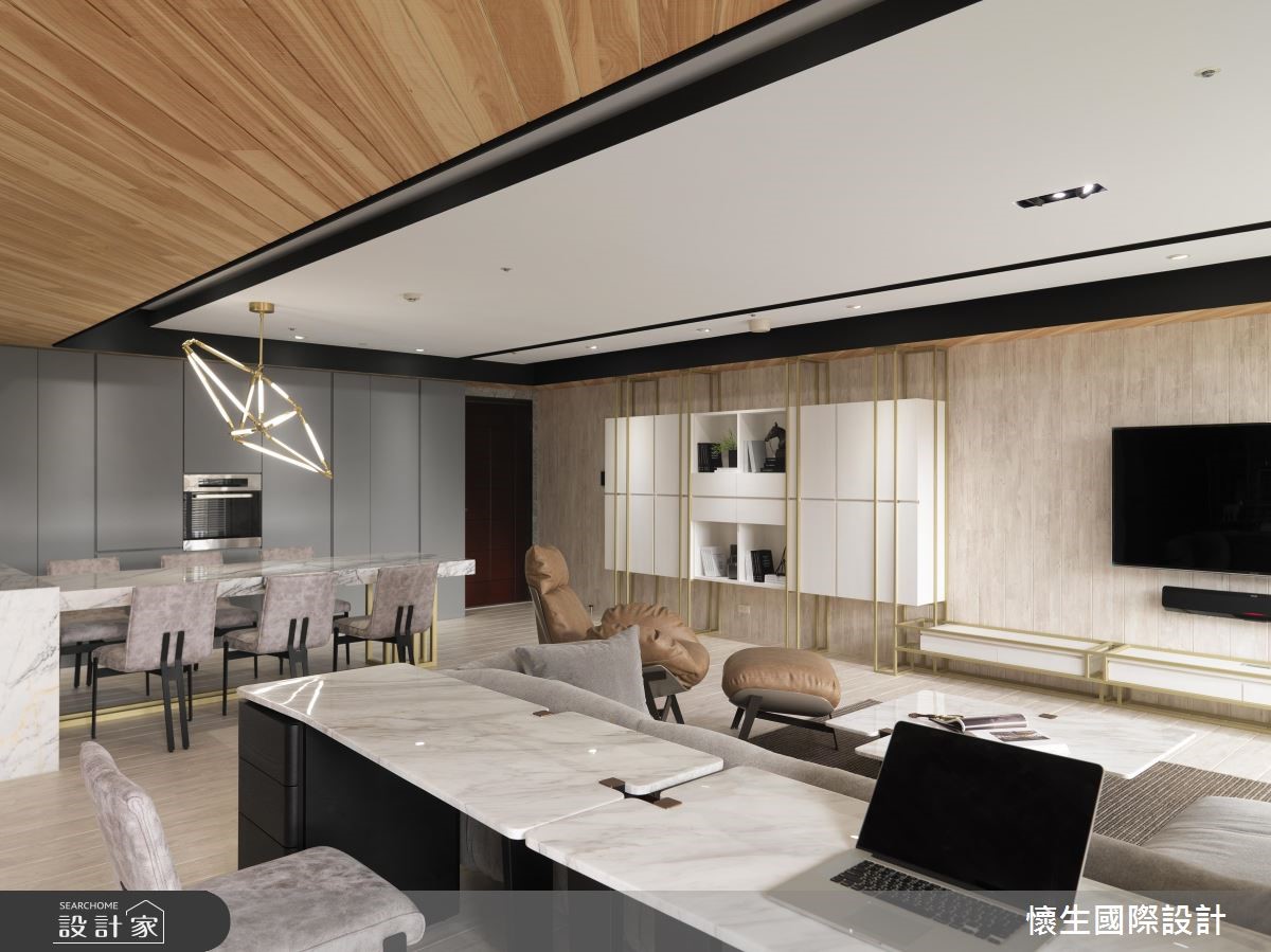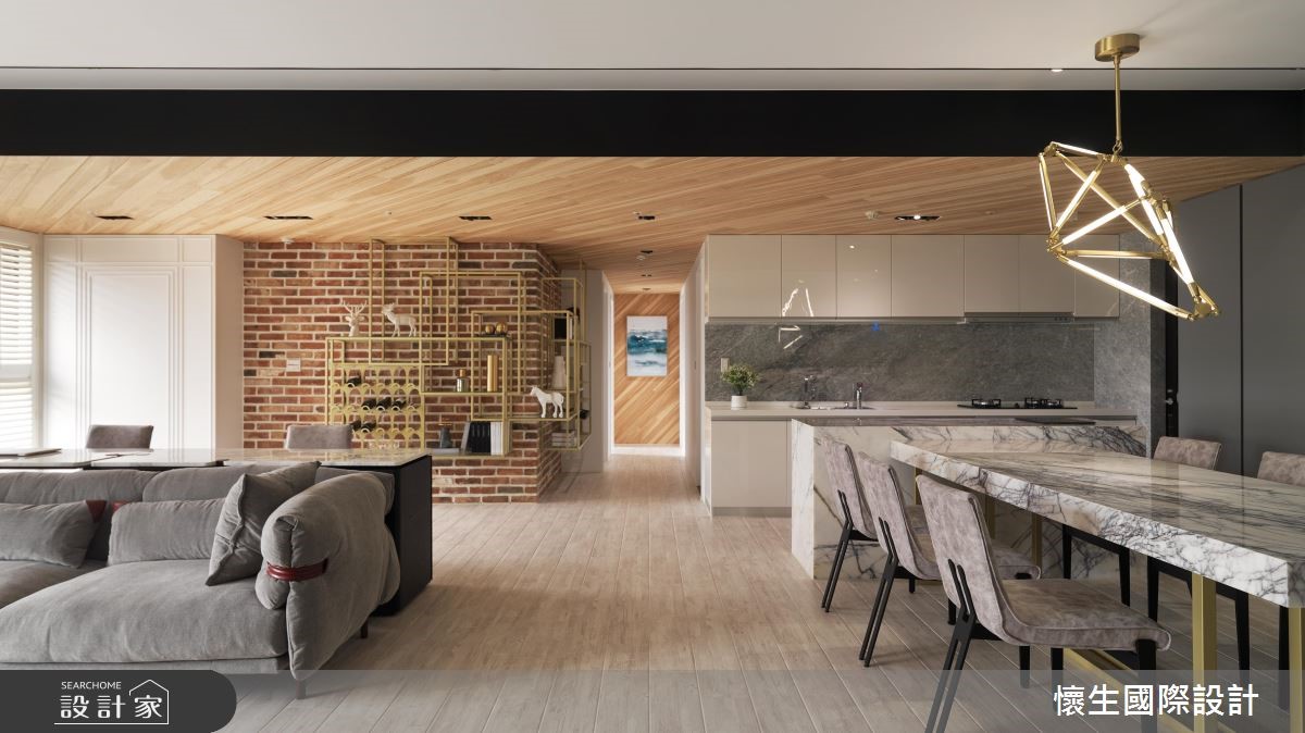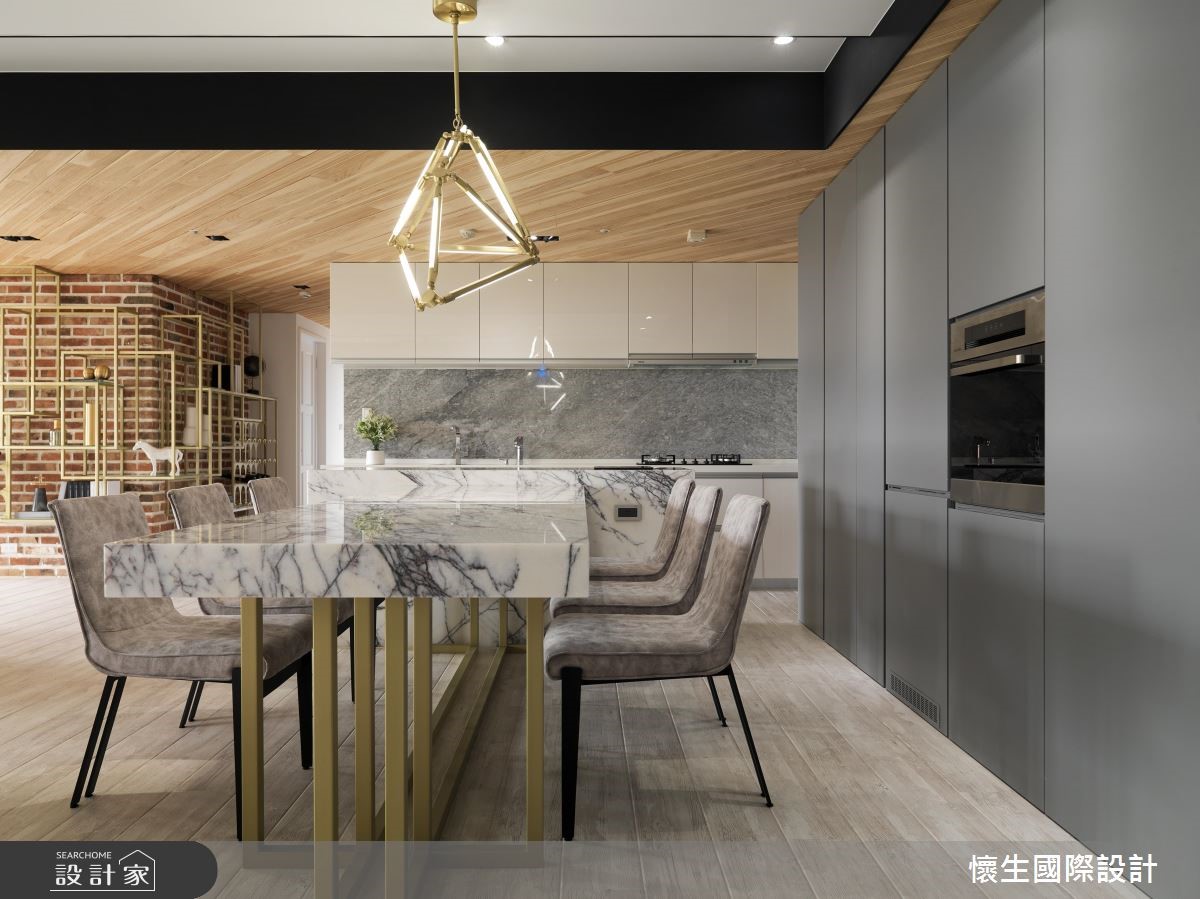 曾经拥有良好装修经验的屋主,这次再度找上当年合作过的翁嘉鸿设计师,运用前卫的造型、利落的线条,以美式风为基底,佐入新潮的前卫思维,使居家无处不是亮点。【以金色细节,对比粗犷复古砖】以木材料串联天地壁,并加入金色铁件框塑,带来异材质的趣味,天花板亦勾勒线性架构,以黑色线条交织利落视感,搭配大面斜纹天花设计作出客餐厅界定,缔造丰富层次,局部墙面铺陈复古砖,与金色金属形成细致及粗犷的呼应。【大理石餐台,营造微奢质感】餐桌中岛则特别选材,选用具有放射状纹路的大理石建材,并在上方悬挂立体几何造型灯饰,营造华丽用餐视野,餐厅中岛旁沿墙线配置隐藏柜体,型塑清爽的机能表情,且以灰色调为底串联墙面,带来视觉完整性。