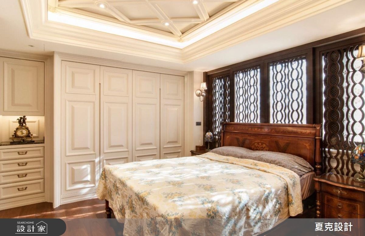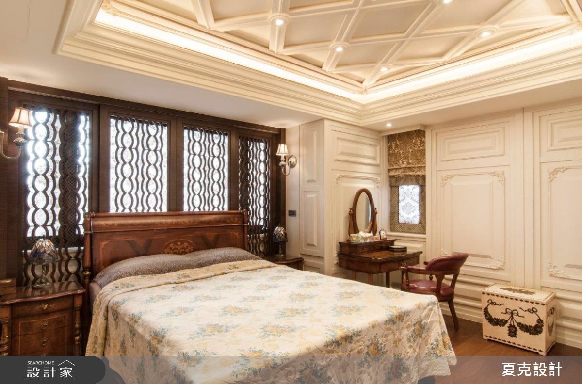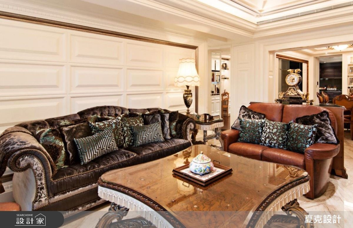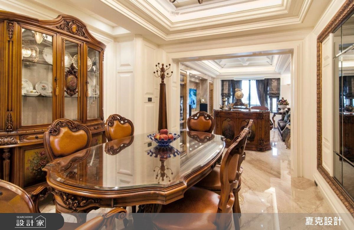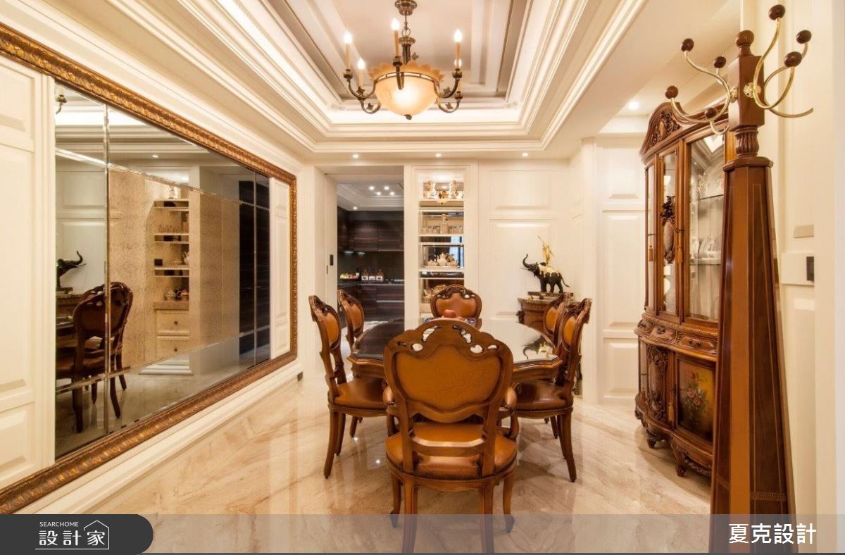 264平方米大宅,设计师采新古典作为居家风格,给予线板、比例与细节的精准掌控,同时搭配家具摆件的合宜分布,赋予充满欧风感的生活情境。【雕花线板,营造精致古典居家】客厅天花加入层叠的线板工法,让整体视野更加挑高,寓意步步高升的居家气势;电视主墙则选用天然石材堆砌而成,以菱型钻石斜角切割工法,呈现更为深远的视觉感,并搭配灯光的点亮烘托,塑造开阔明亮的空间。餐厅区则可见大片镜面墙,达到延伸尺度的目的,并摆设充满立体雕花的经典木作家具,凸显精致工艺美学;主卧于床头做出独特的镂空窗设计,以引入户外采光,再搭配复古温润的寝具,缔造内敛高雅的氛围。
