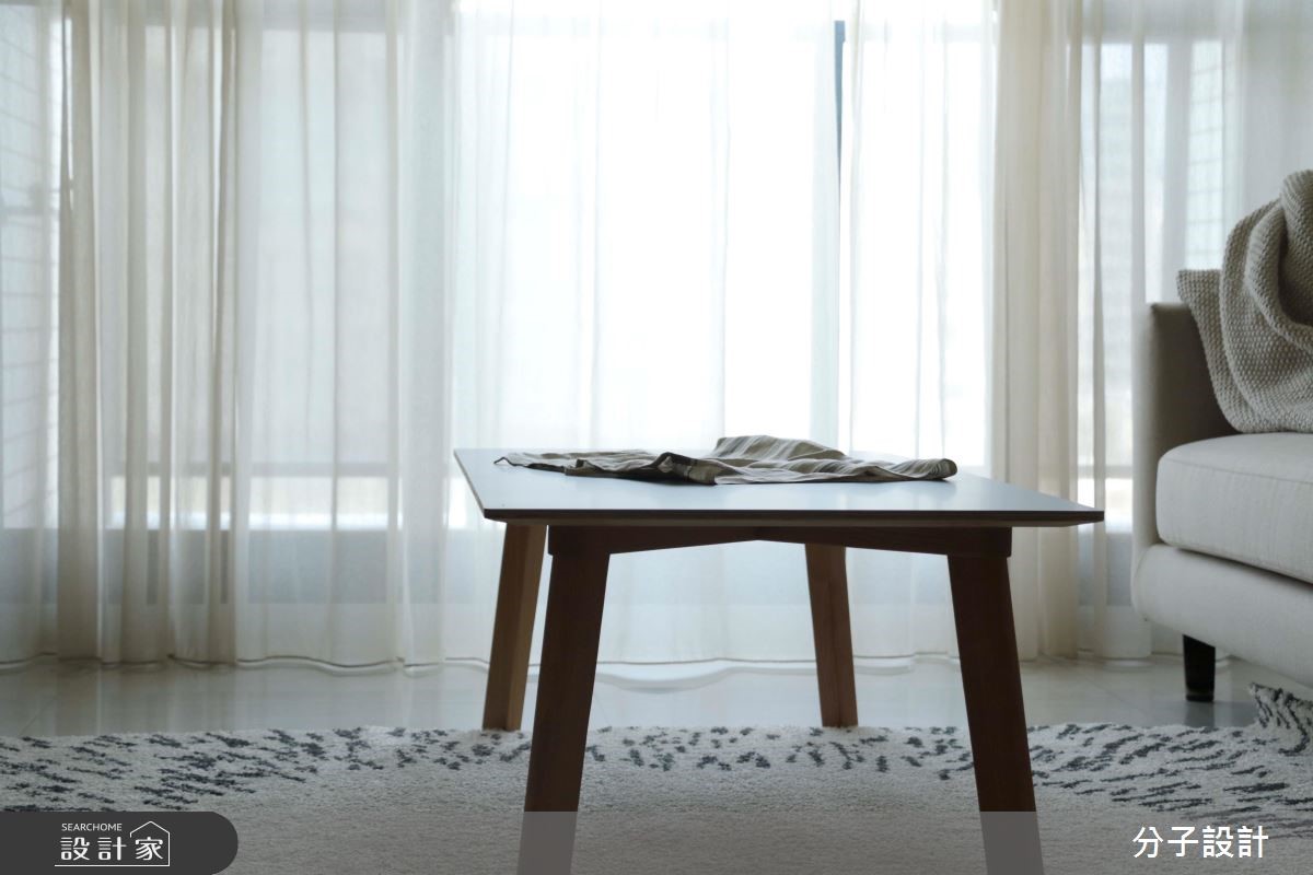 99平方米现代风居宅,居住者为两名年轻屋主,设计师考虑到两人的居住型态,将三室两厅的其中一间居室打通,更改为主卧更衣室,拓增更实用的机能,同时给予简单不繁复的风格取向,实践两人梦想中的简约生活。【轻盈用色与建材,打造清新风格】公领域以全开放配置串联客餐厅,在风格铺陈上,给予纯白轻盈的用色,融合温润自然的建材,搭佐柔软舒适的软件,打造整体的清新风格,客厅窗面则给予透光窗帘,隐约将柔和采光引入室内,营造天然的穿透力。【白色基底,宣告回归的静谧感受】全室的天花梁体则不做过多修饰,但巧用白色基底的串联,将梁柱化为层次分明的架构,增添室内格局的丰富感。廊道间则承袭着白色的延续,在空与留白的表现中,回归私领域的静谧感受!