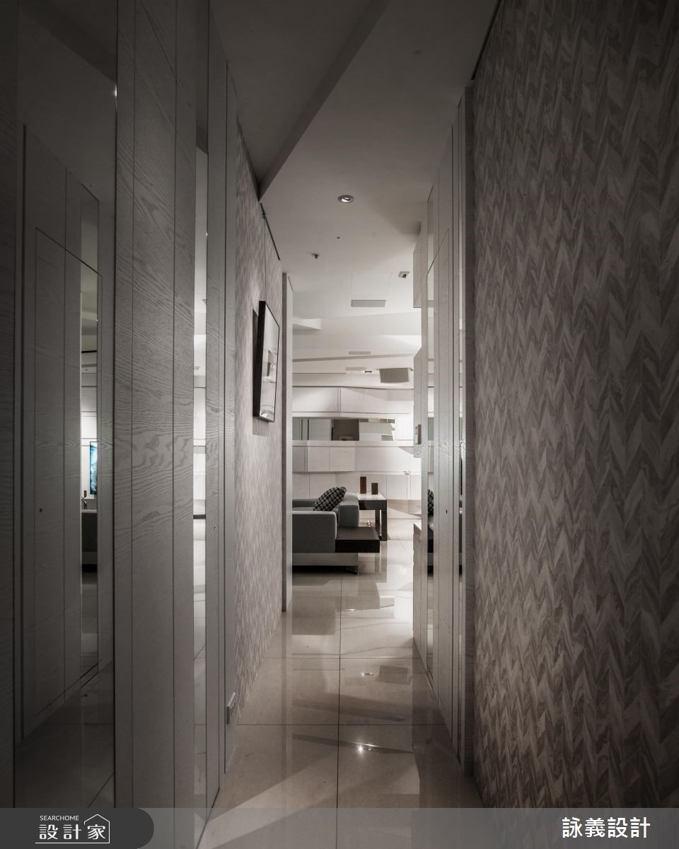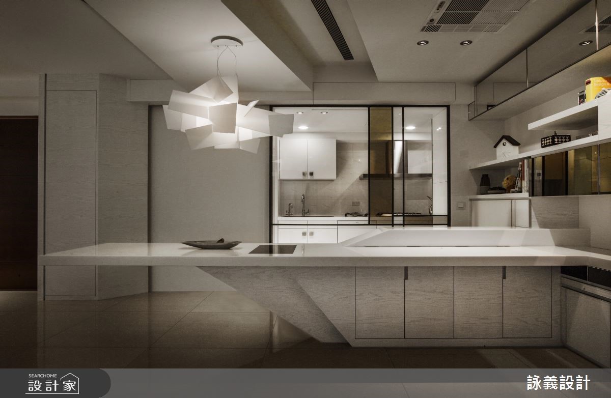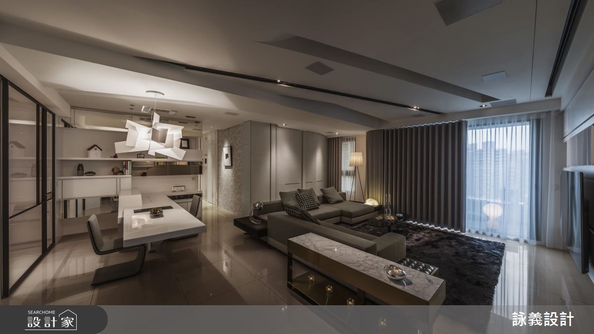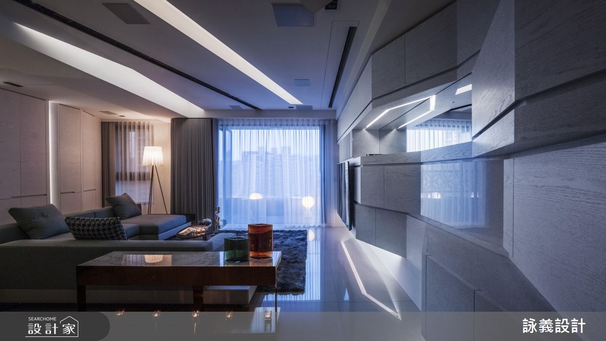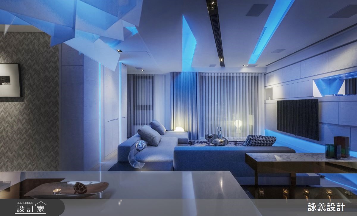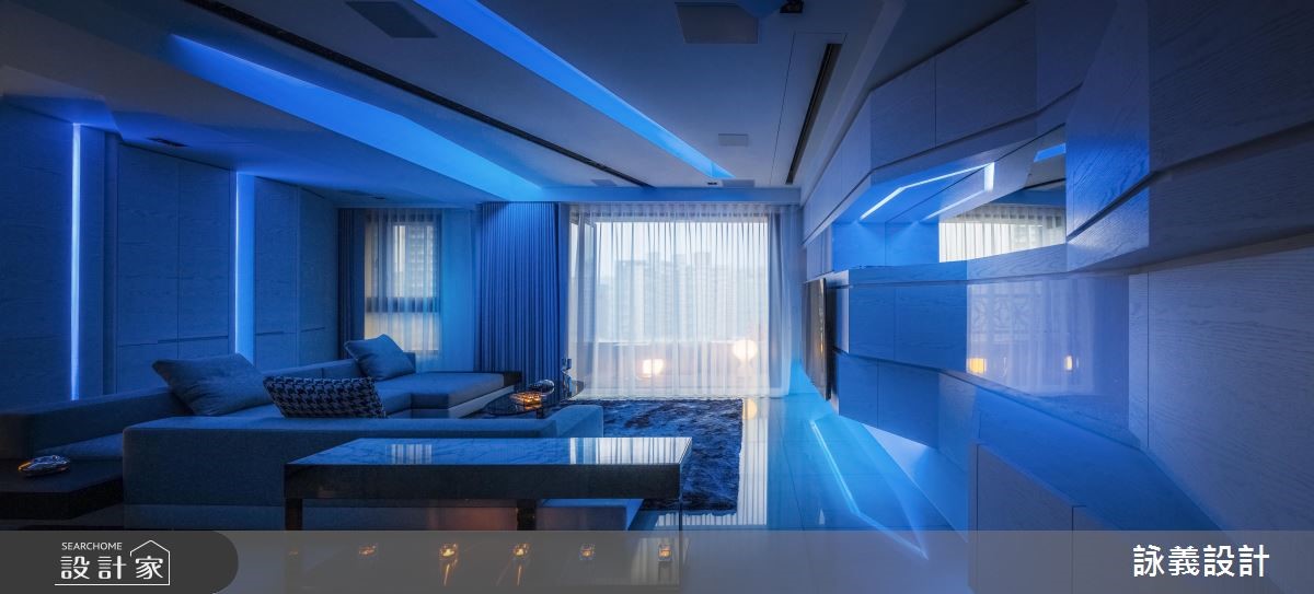 129平方米居宅,在同个空间内,设计师善用智能灯光,主导了白昼、黑夜的不同情境,仅凭借一个开关,实践舒适与浪漫场景,展现截然不同的居家视野,快跟着小编一起来看看吧! 【线条语汇堆叠,丰富空间层次】整体在墙面、天花等处引用多层次的线条转折、几何语汇,堆叠出充满律动感的空间意象,从电视墙起始,即透过进出面交错的设计,衔接展示平台与隐藏收纳柜,呈现富有节奏感的立体主墙,天花板也同样呼应着墙面,在灯光烘托下铺叙更挑高的居家架构。来到餐厨区,也可见巧思设计,设计师将柜体与桌体做出一体规划,从立面延伸出浮岛式餐桌,且穿插着镜面妆点,搭佐前卫吊灯画龙点睛,使场域温馨却不乏摩登韵味。同时,亦藉由灯光衍生更多情境变化,若是开启暖白光线,则与户外采光相得益彰,延伸白昼的舒适质地,或也可在夜晚打开蓝色灯光,瞬间改变氛围,变化成神秘科幻,有如异星般的唯美视野。