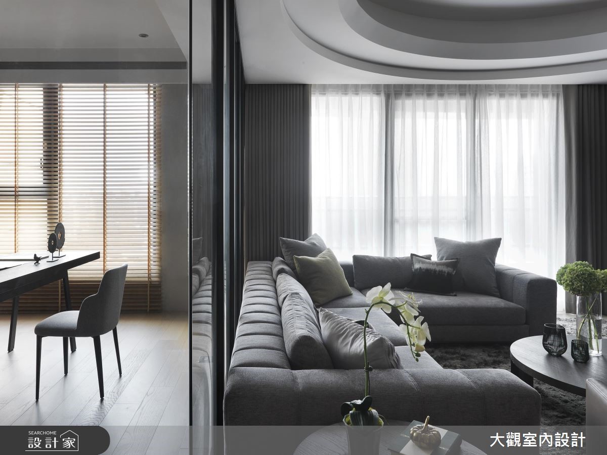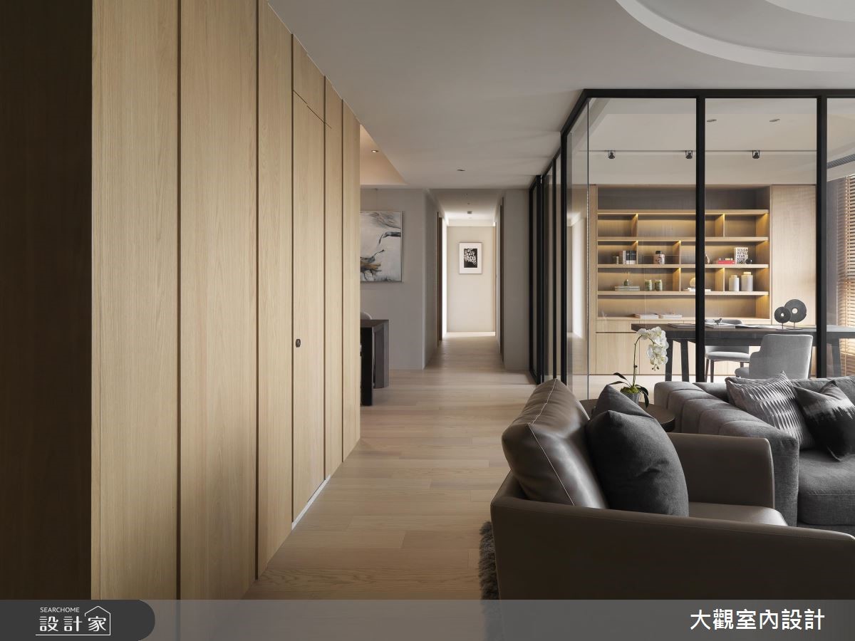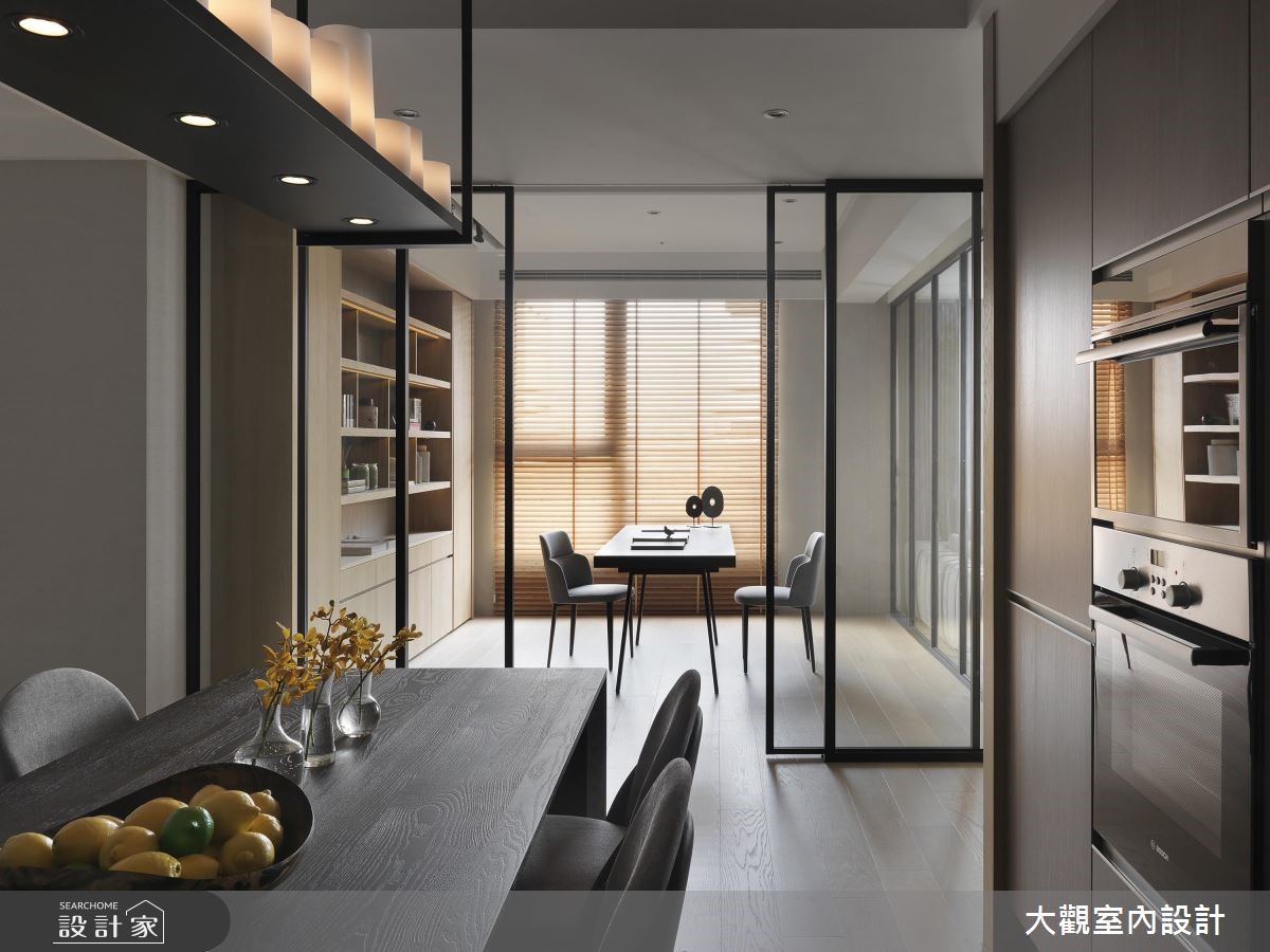 善用原有的大面落地窗优势,让户外暖阳穿透网纱窗帘、筛洒入室,这是接近艺文特区的一处私宅。融入温润木质,透过温润光晕、浅色木纹的收纳柜搭配沉稳灰色家具,一股静谧、优雅的氛围随之散漾开来。 【通透玻璃隔断,视觉扩容延伸】天花板以圆弧曲线勾勒出渐层的立体视觉效果,搭配环绕式的嵌灯照明,形塑公共空间晕黄淡雅的光感。电视墙则以柔美纹理的大理石材铺陈,同时电器柜平台可摆设艺术画作,增添人文雅趣之美。沙发后方以玻璃隔断围塑出书房领域,视觉从客厅延伸入内,也让自然光毫无阻拦的进入,带来整体空间的明亮宽敞之感。后方壁面则以木作隔板搭建开放书墙,除了阅读书籍,也能摆设展示品,随时切换日常风景。隔着廊道,与书房相对而规划出餐厅领域,即使不需装设推拉门,也自然形成空间独立之感。而深色木纹铺陈餐桌、厨具门片,带来安定沉稳的空间气息,餐桌上方悬挂铁件吊柜,一次满足收纳与美学展示机能。