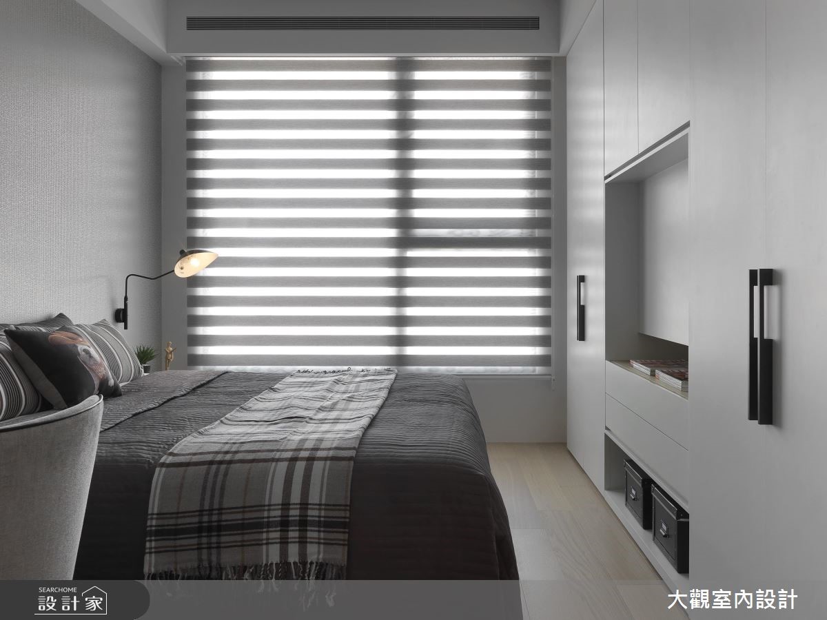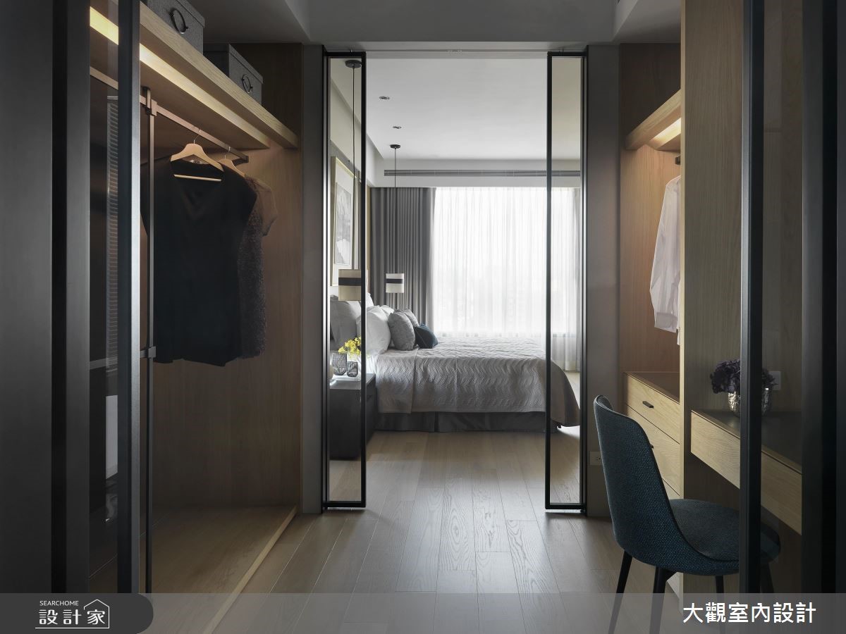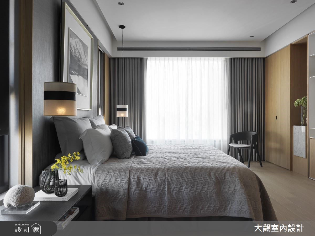 善用原有的大面落地窗优势,让户外暖阳穿透网纱窗帘、筛洒入室,这是接近艺文特区的一处私宅。融入温润木质,透过温润光晕、浅色木纹的收纳柜搭配沉稳灰色家具,一股静谧、优雅的氛围随之散漾开来。 【通透玻璃隔断,视觉扩容延伸】天花板以圆弧曲线勾勒出渐层的立体视觉效果,搭配环绕式的嵌灯照明,形塑公共空间晕黄淡雅的光感。电视墙则以柔美纹理的大理石材铺陈,同时电器柜平台可摆设艺术画作,增添人文雅趣之美。沙发后方以玻璃隔断围塑出书房领域,视觉从客厅延伸入内,也让自然光毫无阻拦的进入,带来整体空间的明亮宽敞之感。后方壁面则以木作隔板搭建开放书墙,除了阅读书籍,也能摆设展示品,随时切换日常风景。隔着廊道,与书房相对而规划出餐厅领域,即使不需装设推拉门,也自然形成空间独立之感。而深色木纹铺陈餐桌、厨具门片,带来安定沉稳的空间气息,餐桌上方悬挂铁件吊柜,一次满足收纳与美学展示机能。